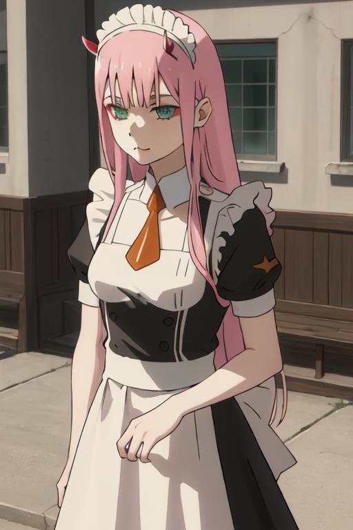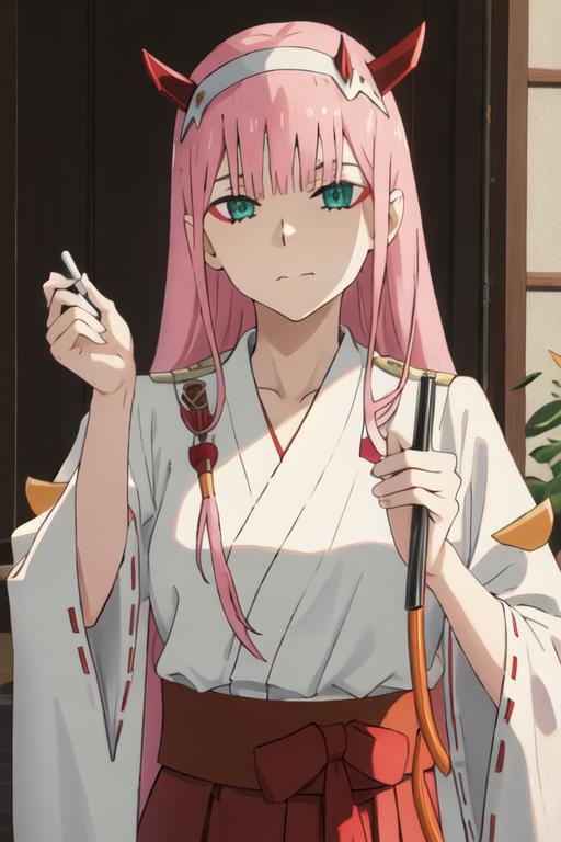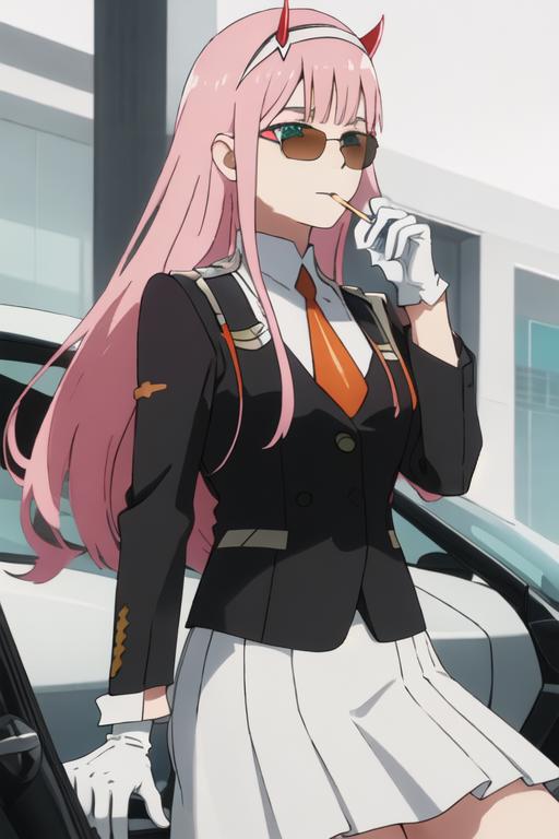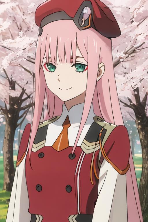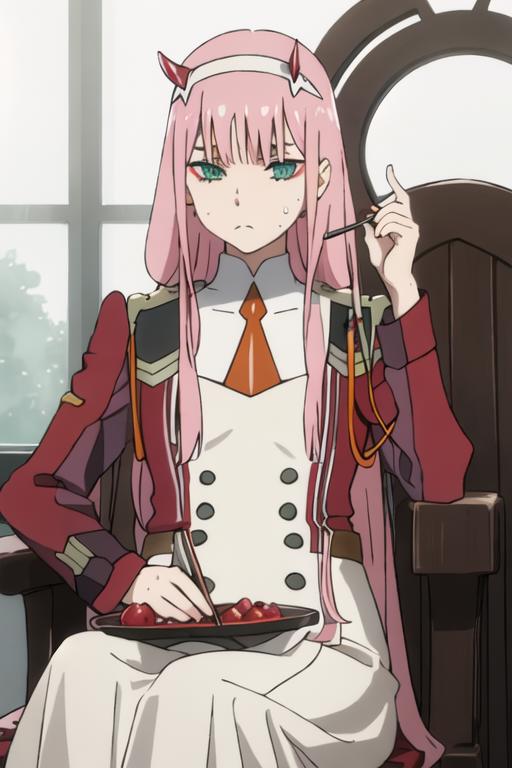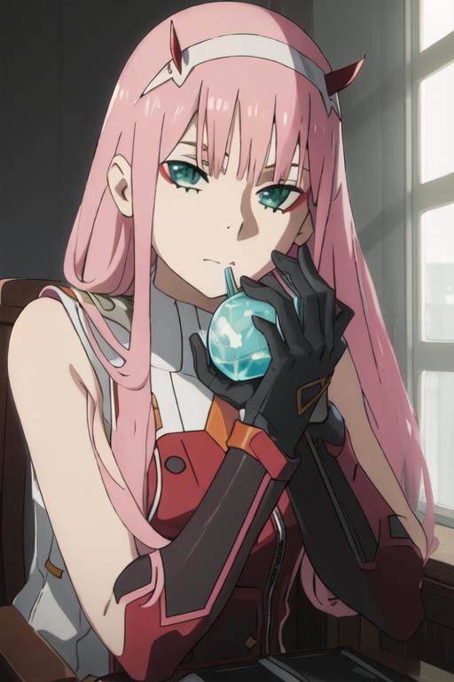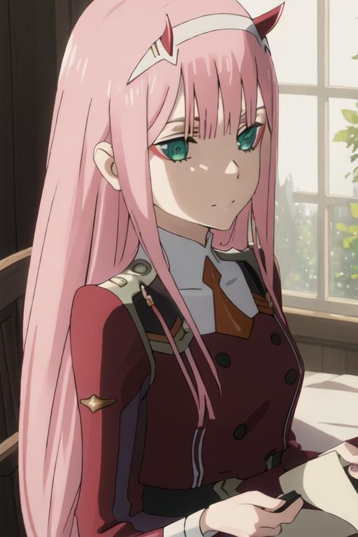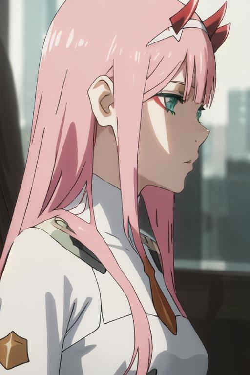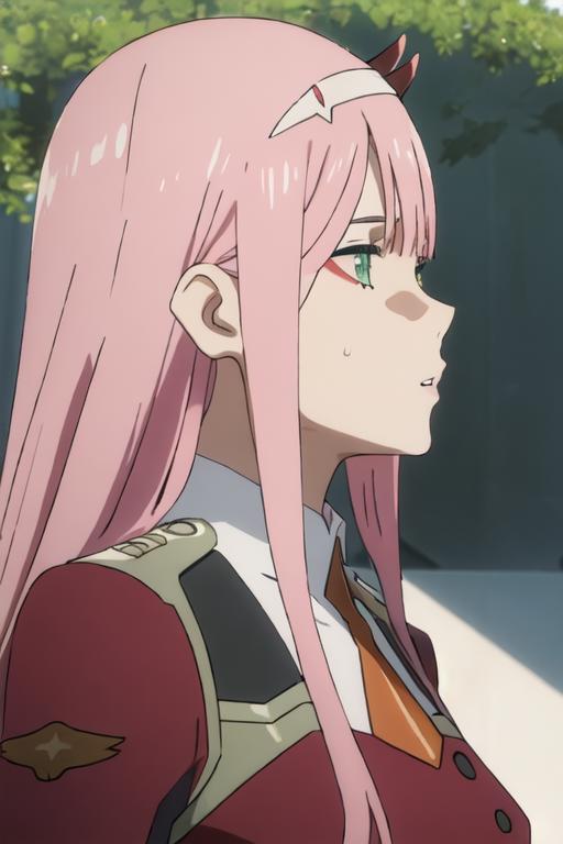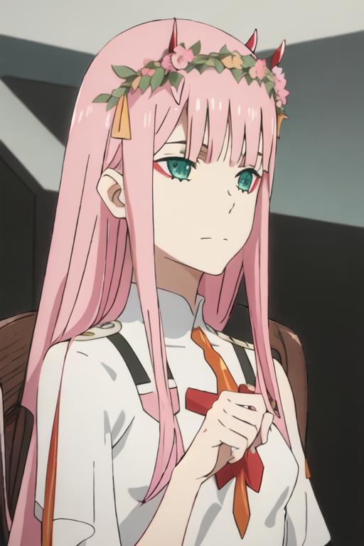 The trigger word is 02_darlinginthefranxx, and the recommended tags are best quality, masterpiece, highres, solo, {02_darlinginthefranxx:1.15}, long_hair, pink_hair, horns, bangs, hairband, green_eyes, white_hairband, closed_mouth, makeup, straight_hair, eyeshadow, aqua_eyes.