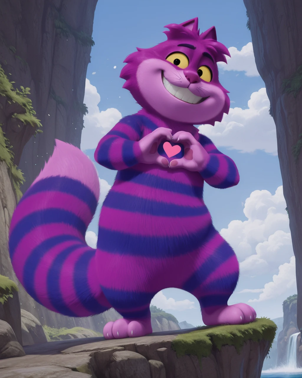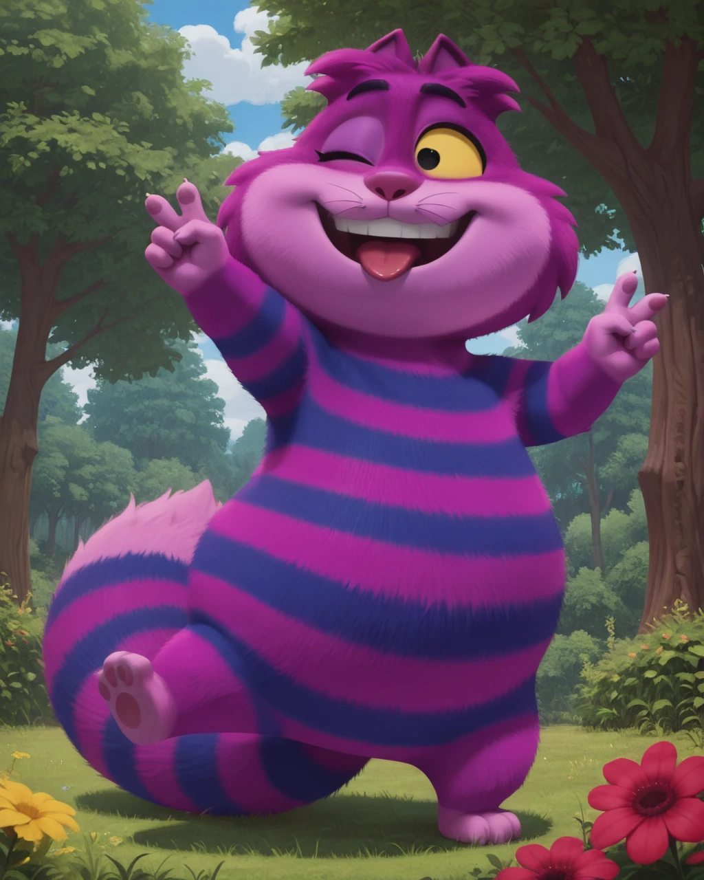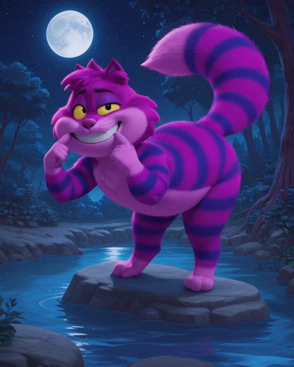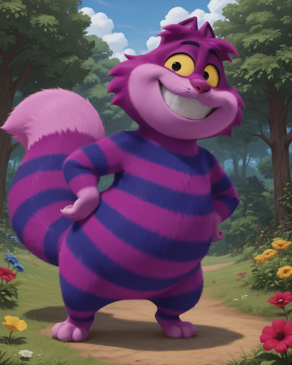CheshirecatIl CartoCharCat, cat, Cheshire cat, yellow sclera, black eyes, two-tone fur, pink fur with blue stripes, tail, pink nose, whiskers, small ears, paws, male, teeth,