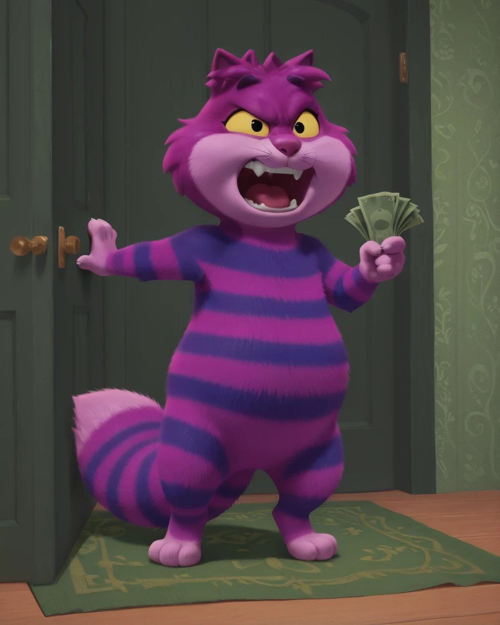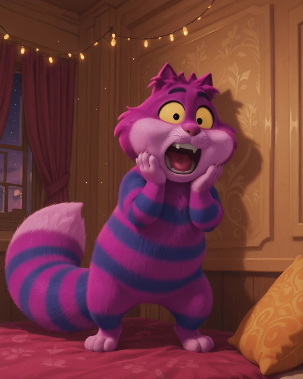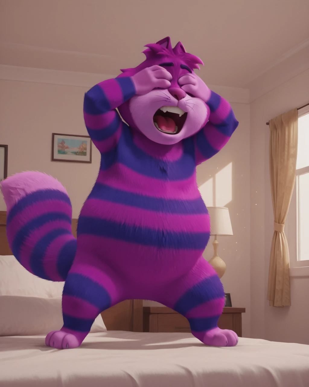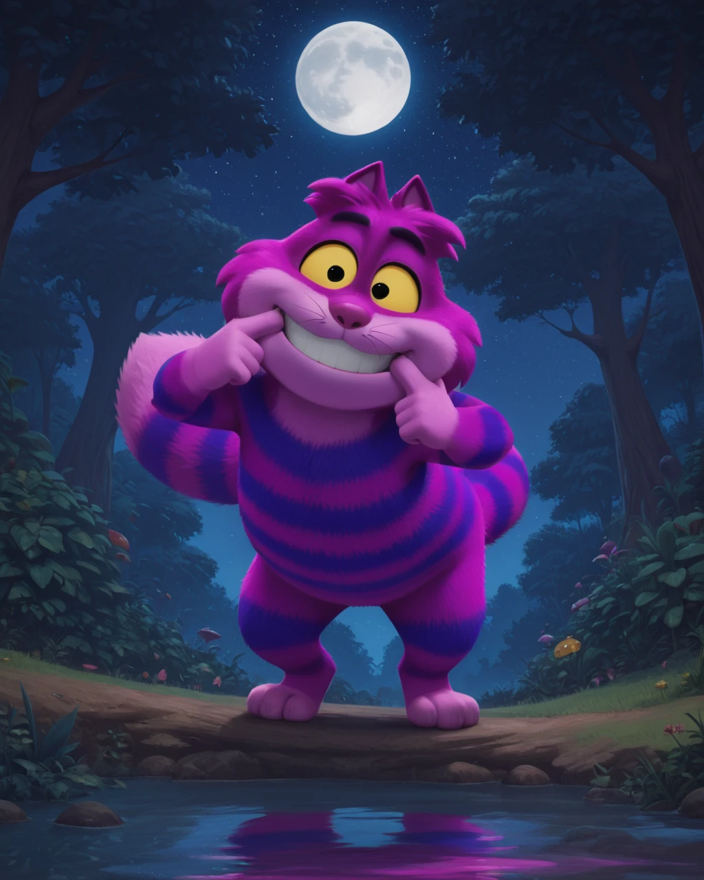 CheshirecatIl CartoCharCat, cat, Cheshire cat, yellow sclera, black eyes, two-tone fur, pink fur with blue stripes, tail, pink nose, whiskers, small ears, paws, male, teeth,
