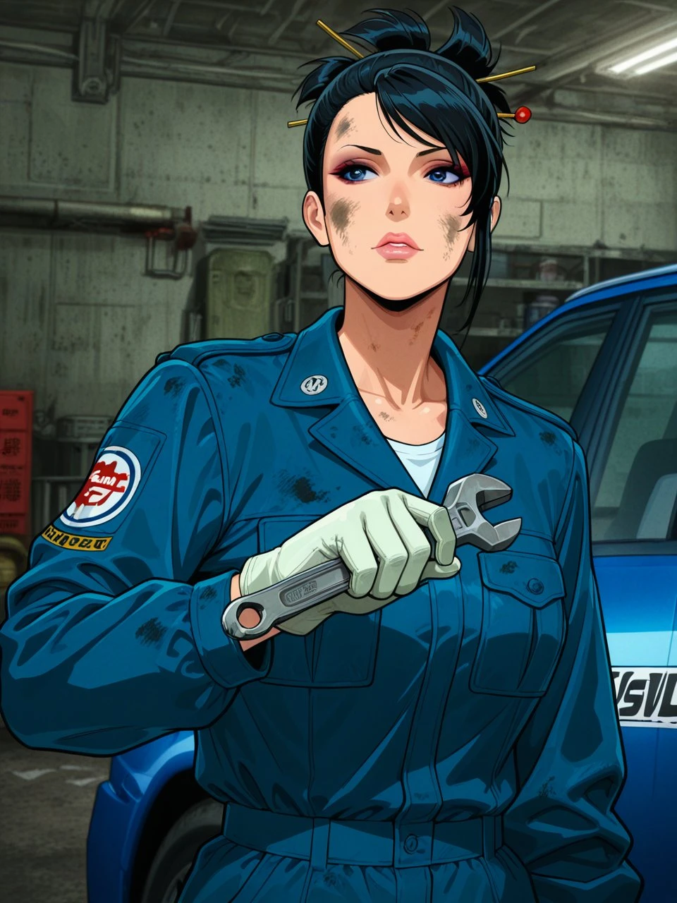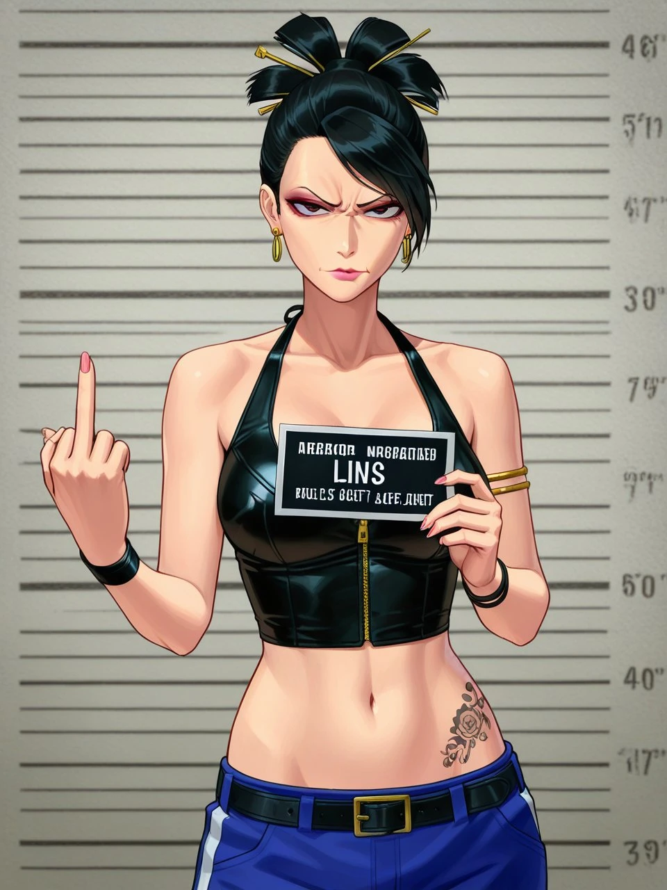 helper tags: black hair, hair stick, brown eyes, hip tattoo