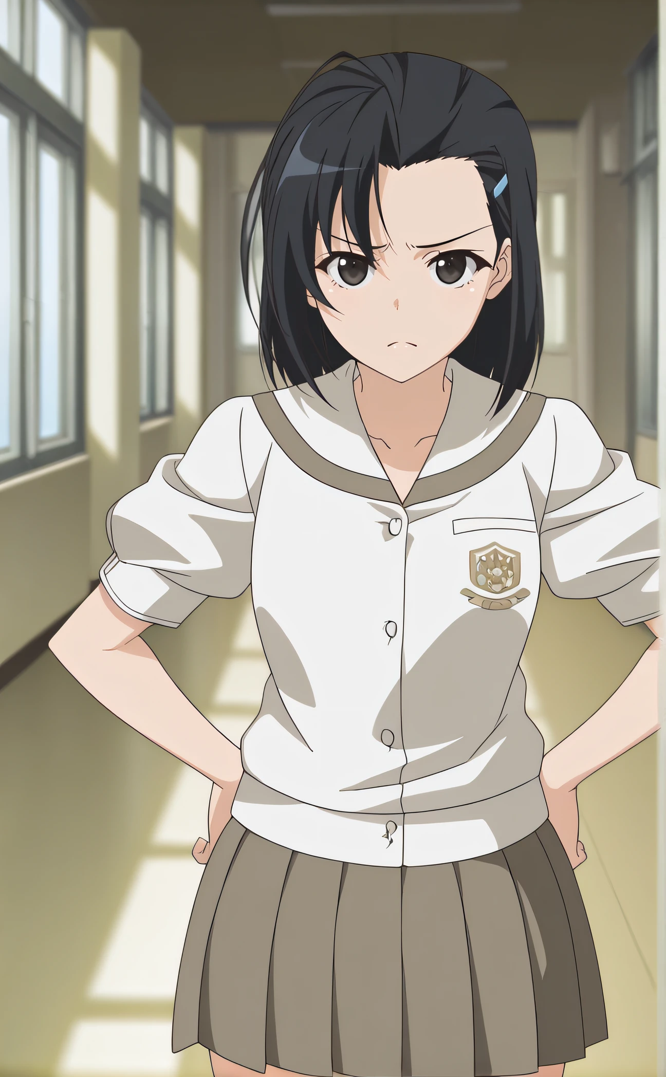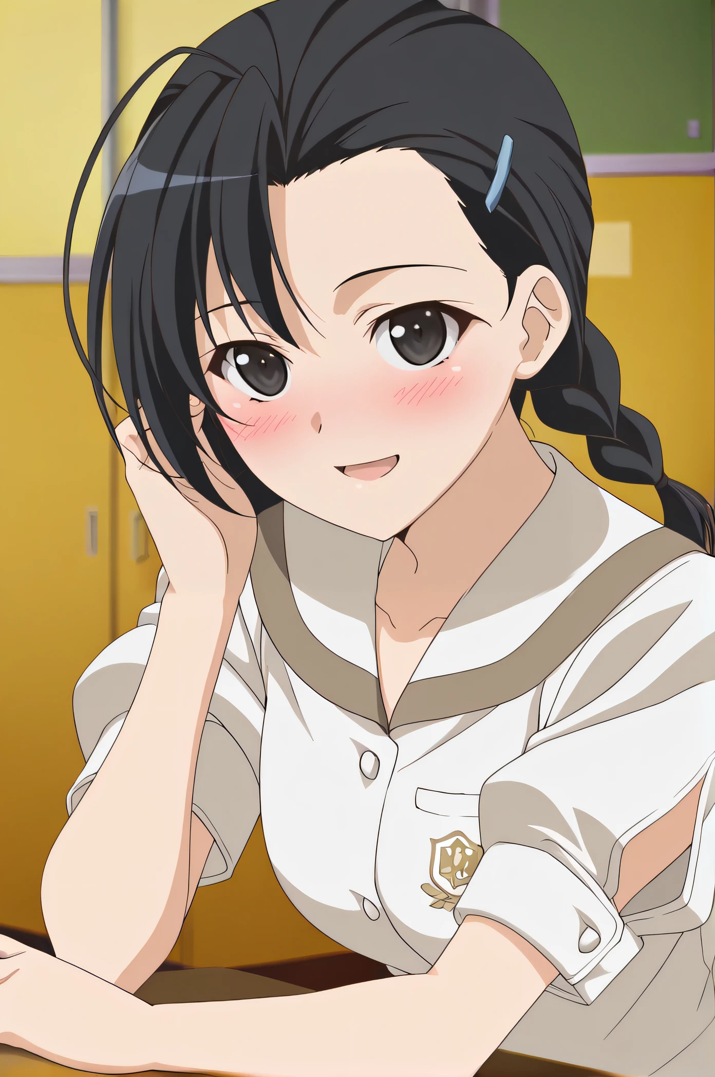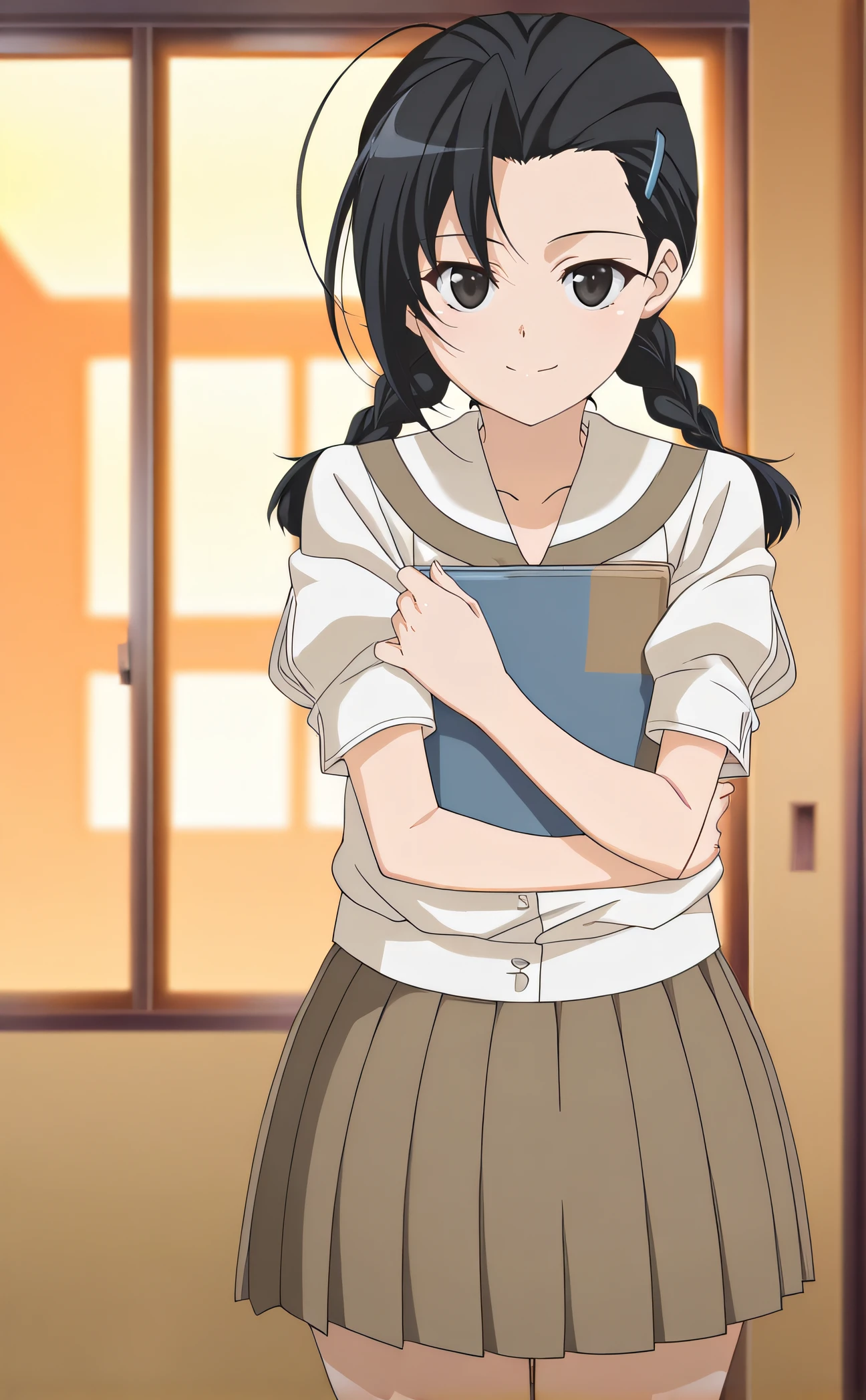 kozue, black hair, twin braids, hairclip, black eyes, school uniform, short sleeves, pleated skirt