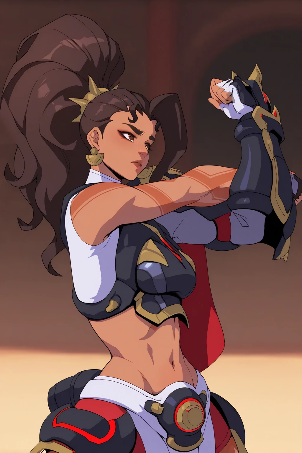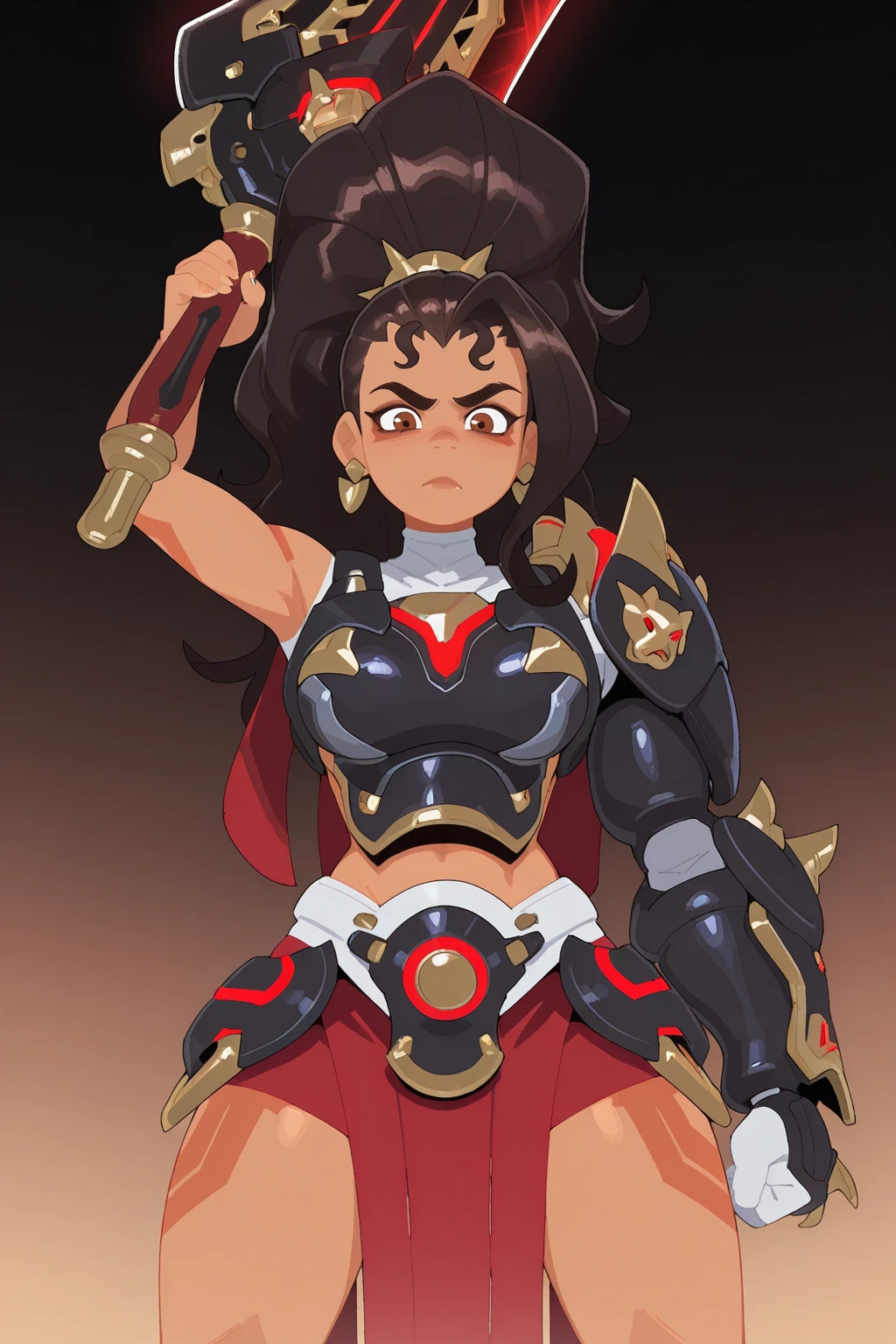 1girl, solo, vendetta \(overwatch\), dark skin, armor, dark-skinned female, weapon, holding, holding weapon, long hair, ponytail, black hairDescription