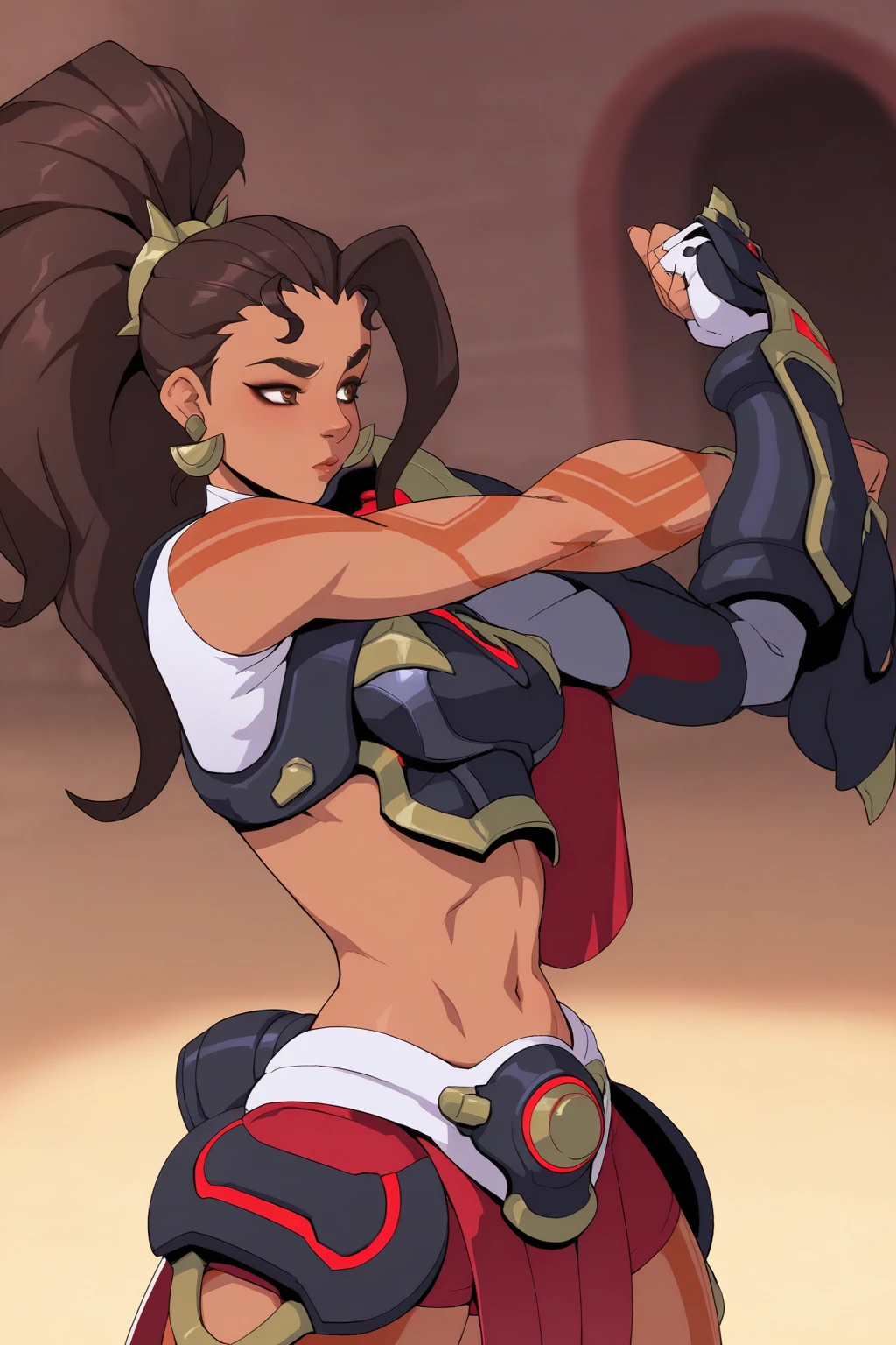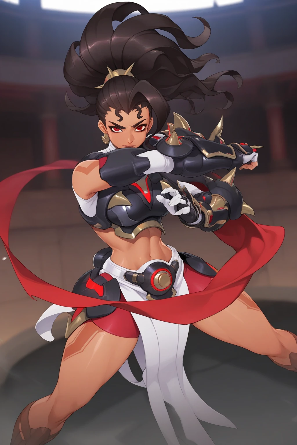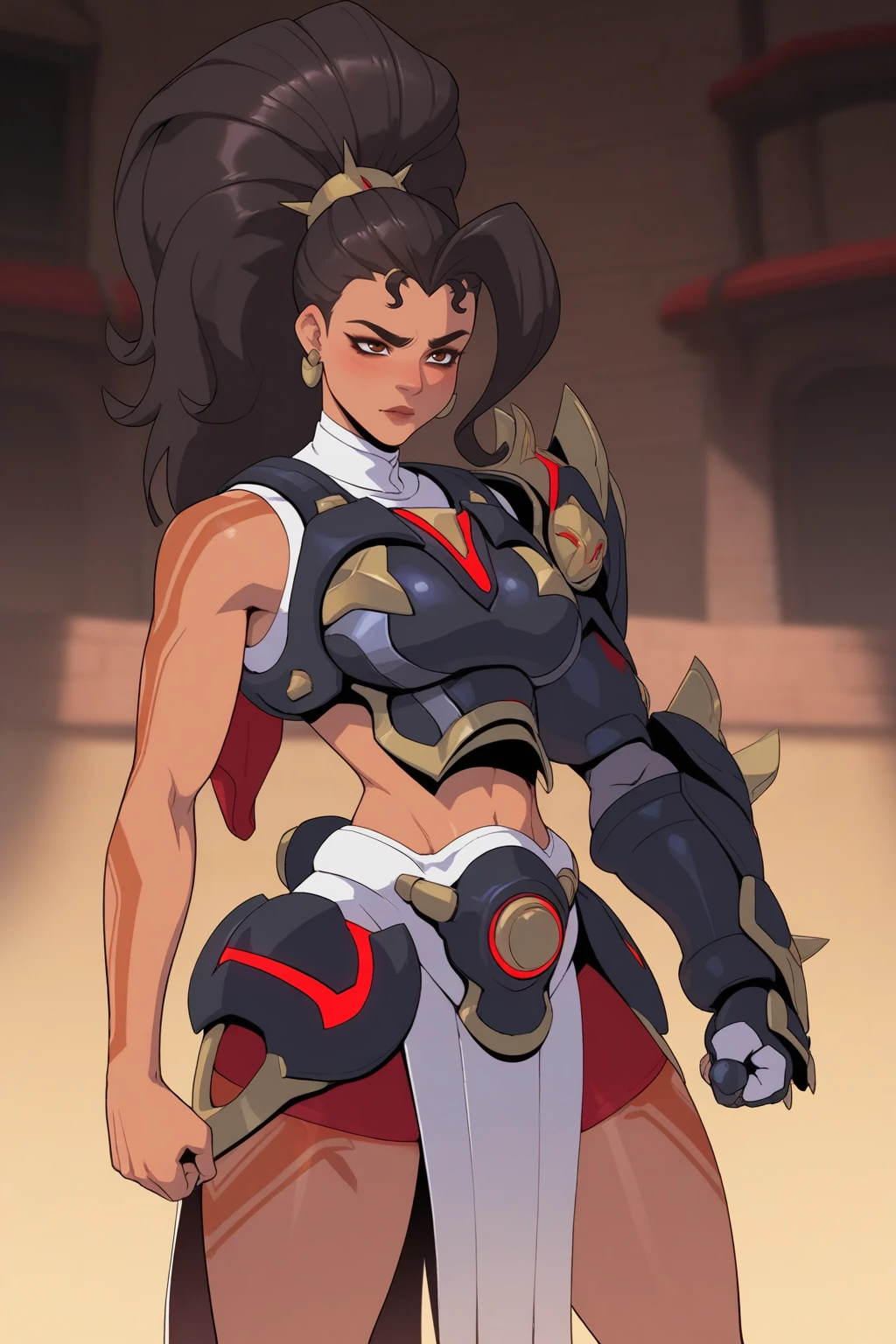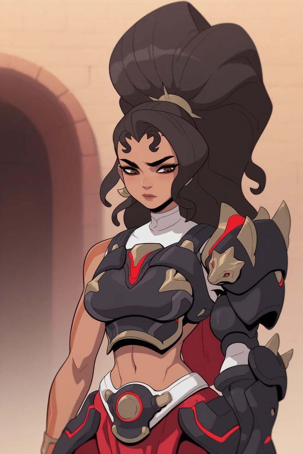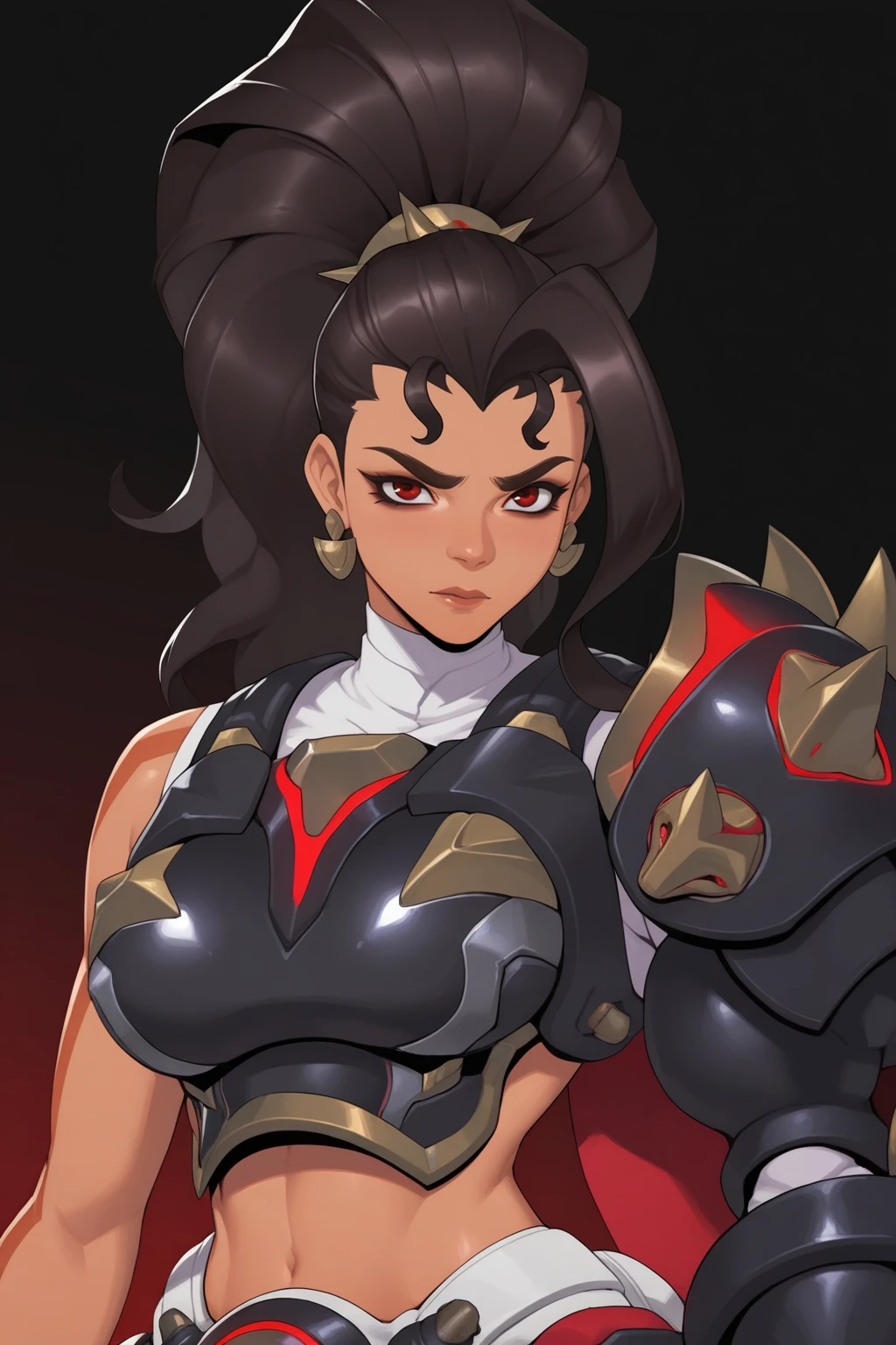dark skin, armor, dark-skinned female, long hair, ponytail, black hair