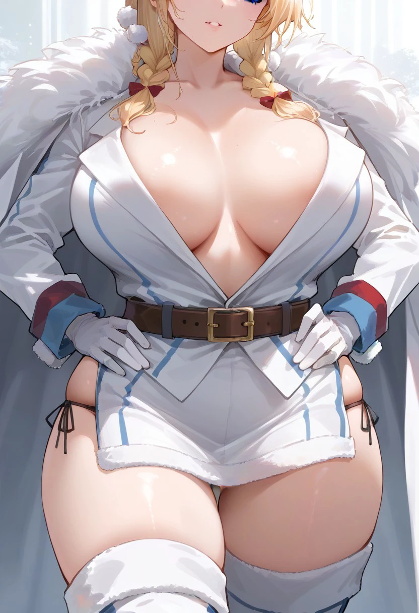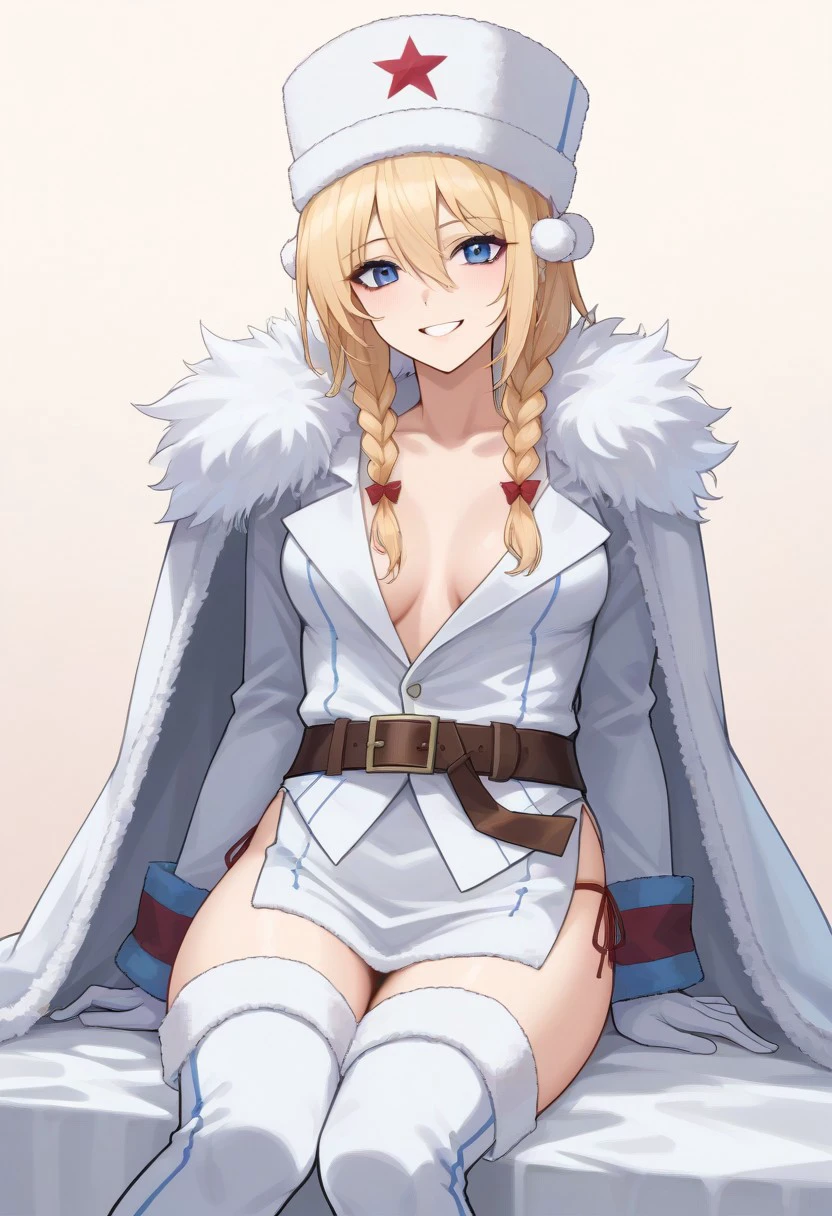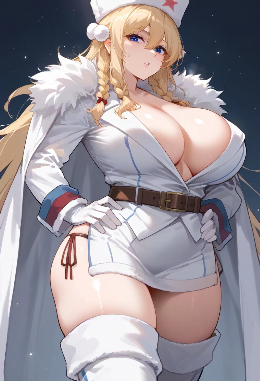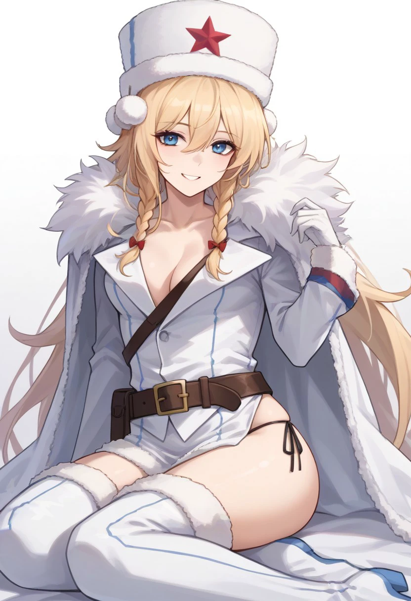 ushanka, red star, coat, fur trim, belt, white gloves, side-tie panties, thigh boots
