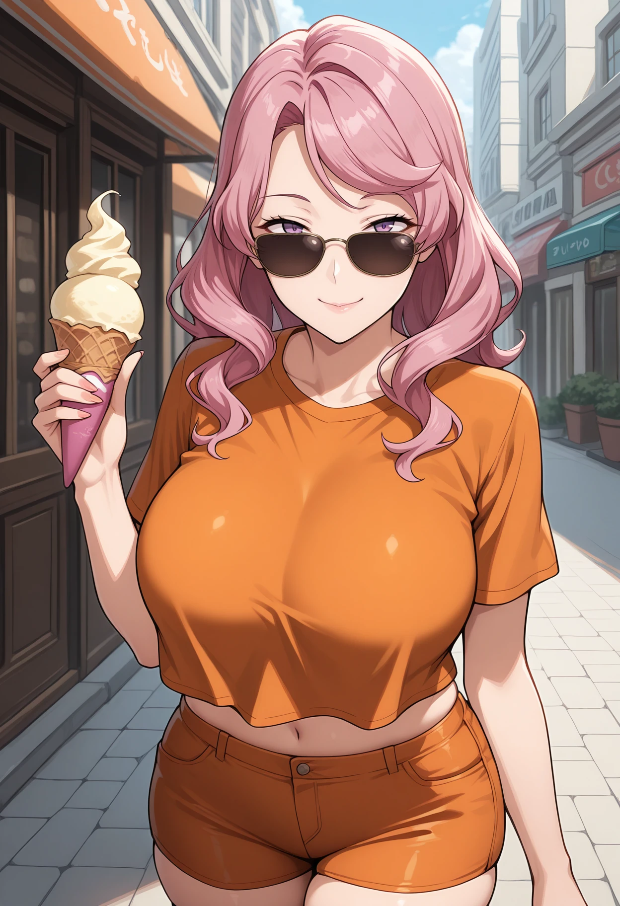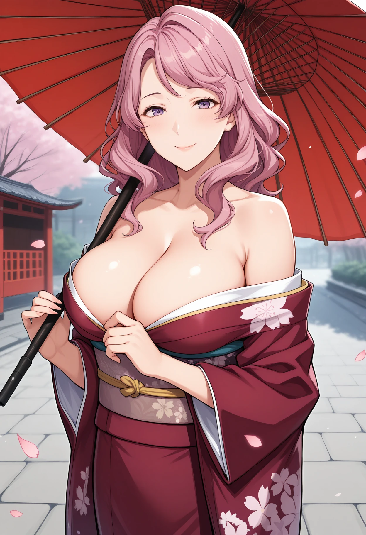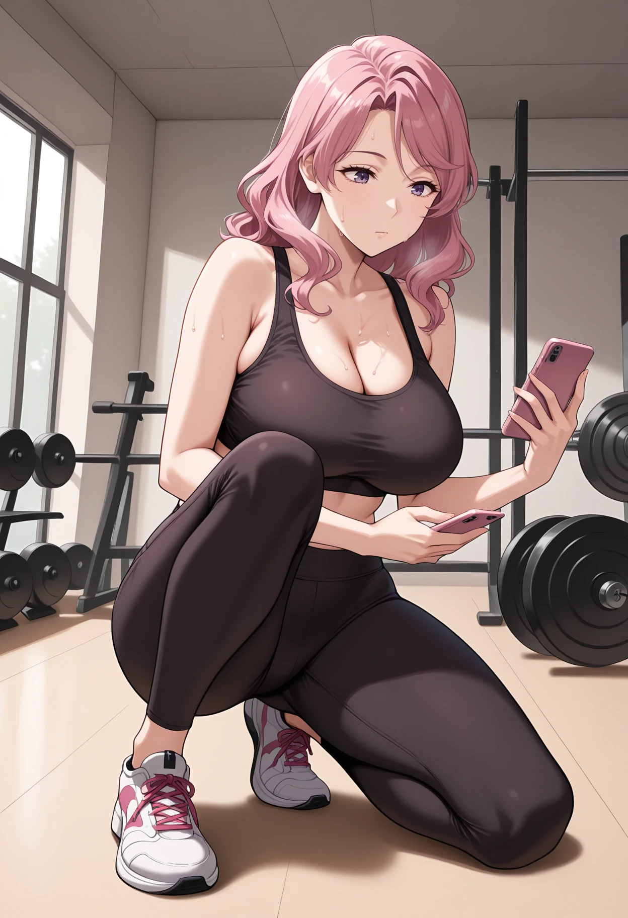 mature female, large breasts, long hair, pink hair, purple eyes,