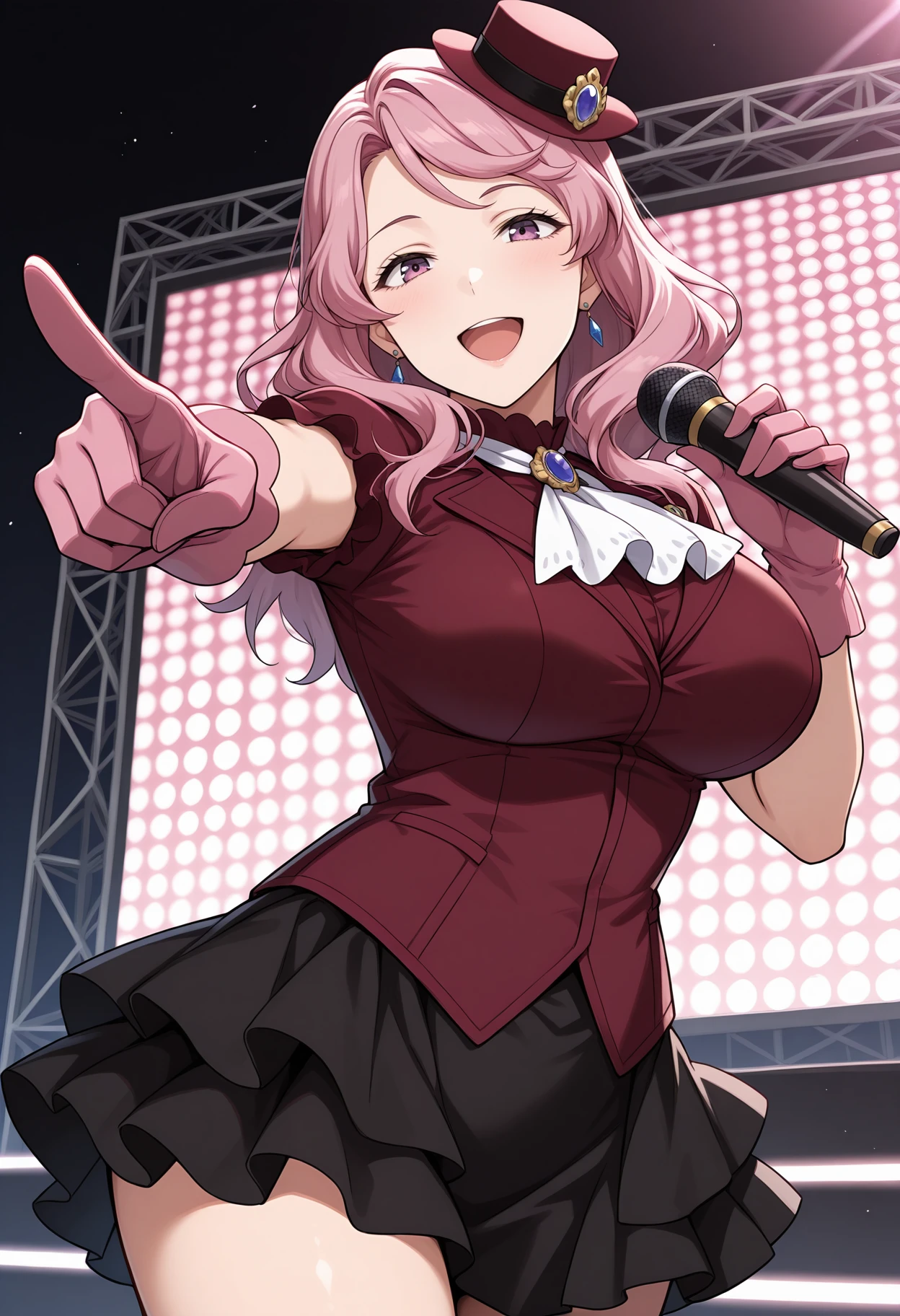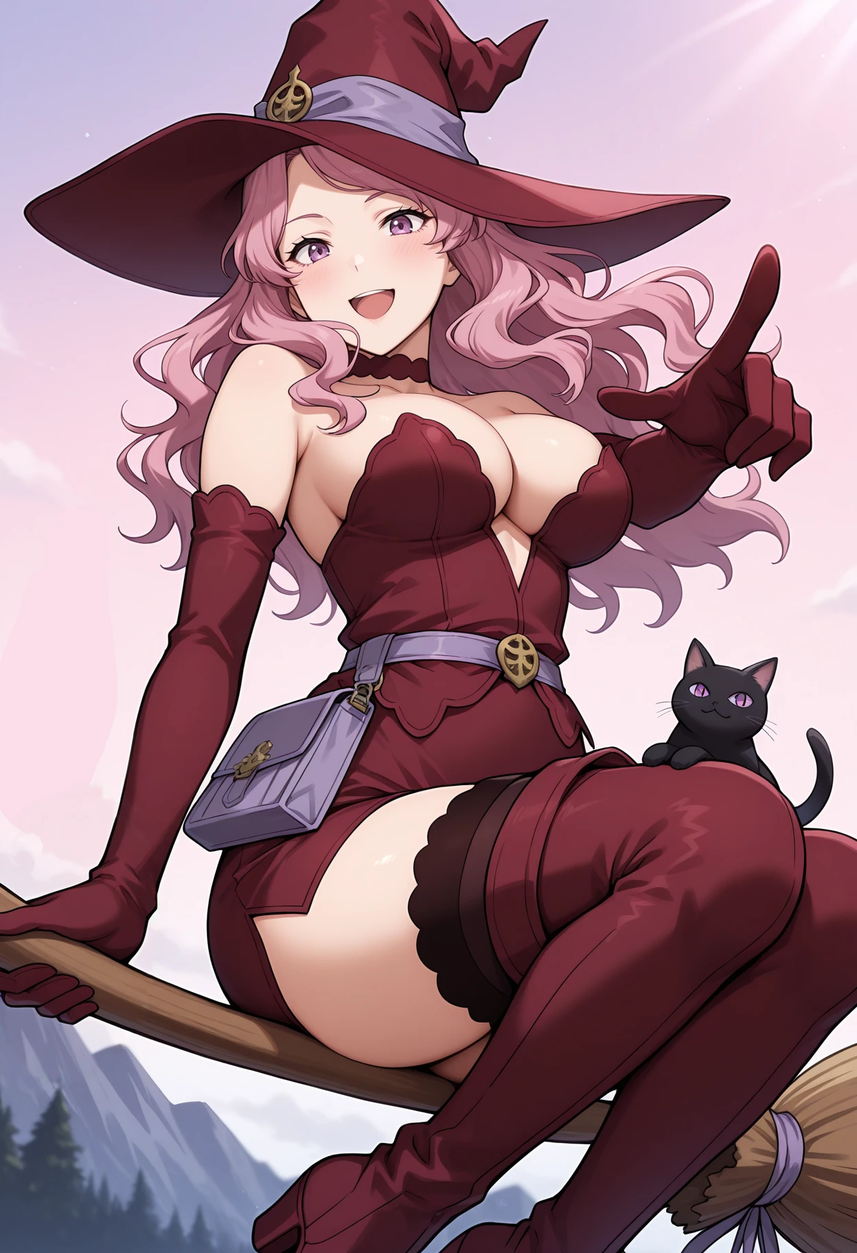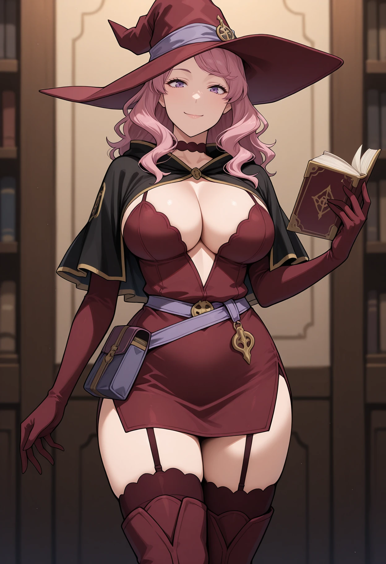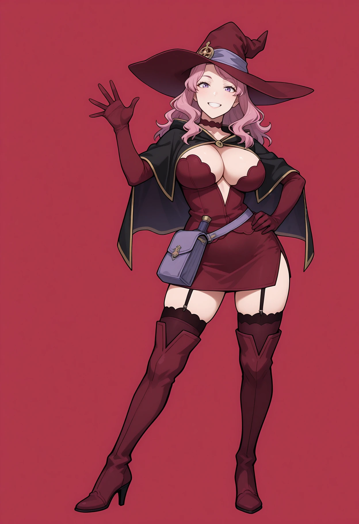 mature female, large breasts, long hair, pink hair, purple eyes, witch hat, red choker, black capelet, red dress, red elbow gloves, purple belt, belt pouch, garter straps, lace-trimmed thighhighs, black thighhighs, red thigh boots, Description