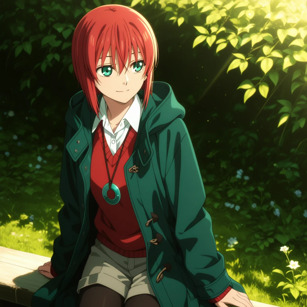 chisea, 1girl, red hair, short hair, green eyes, green coat, red sweater, collared shirt, shorts, black pantyhose, necklace,