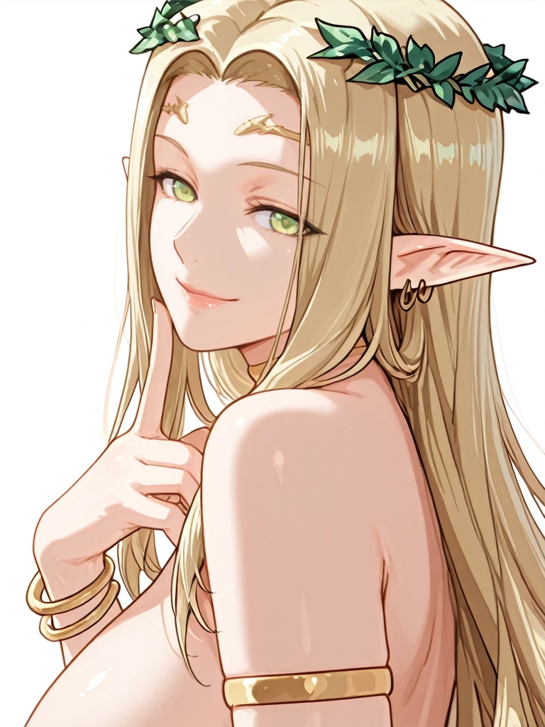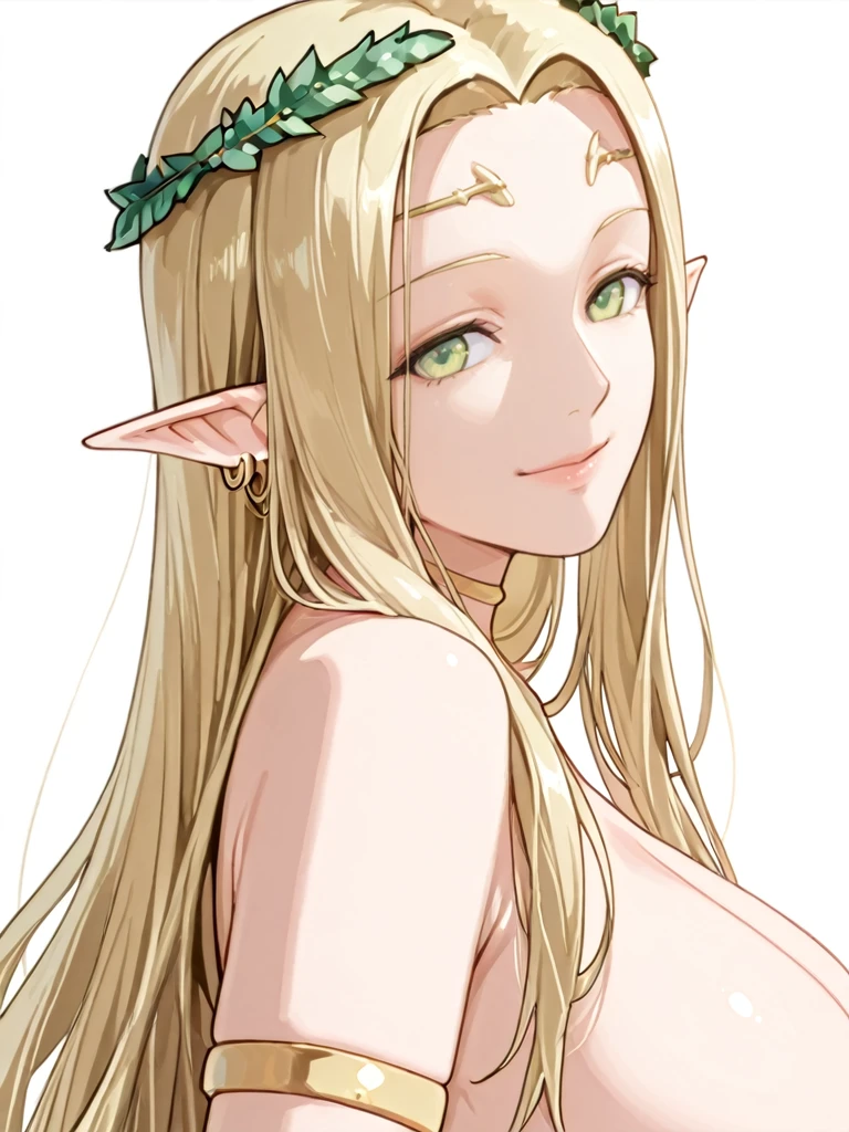 celestine,long hair,blonde hair,pointy ears,elf,green eyes,large breasts,earrings,armlet,bracelet,