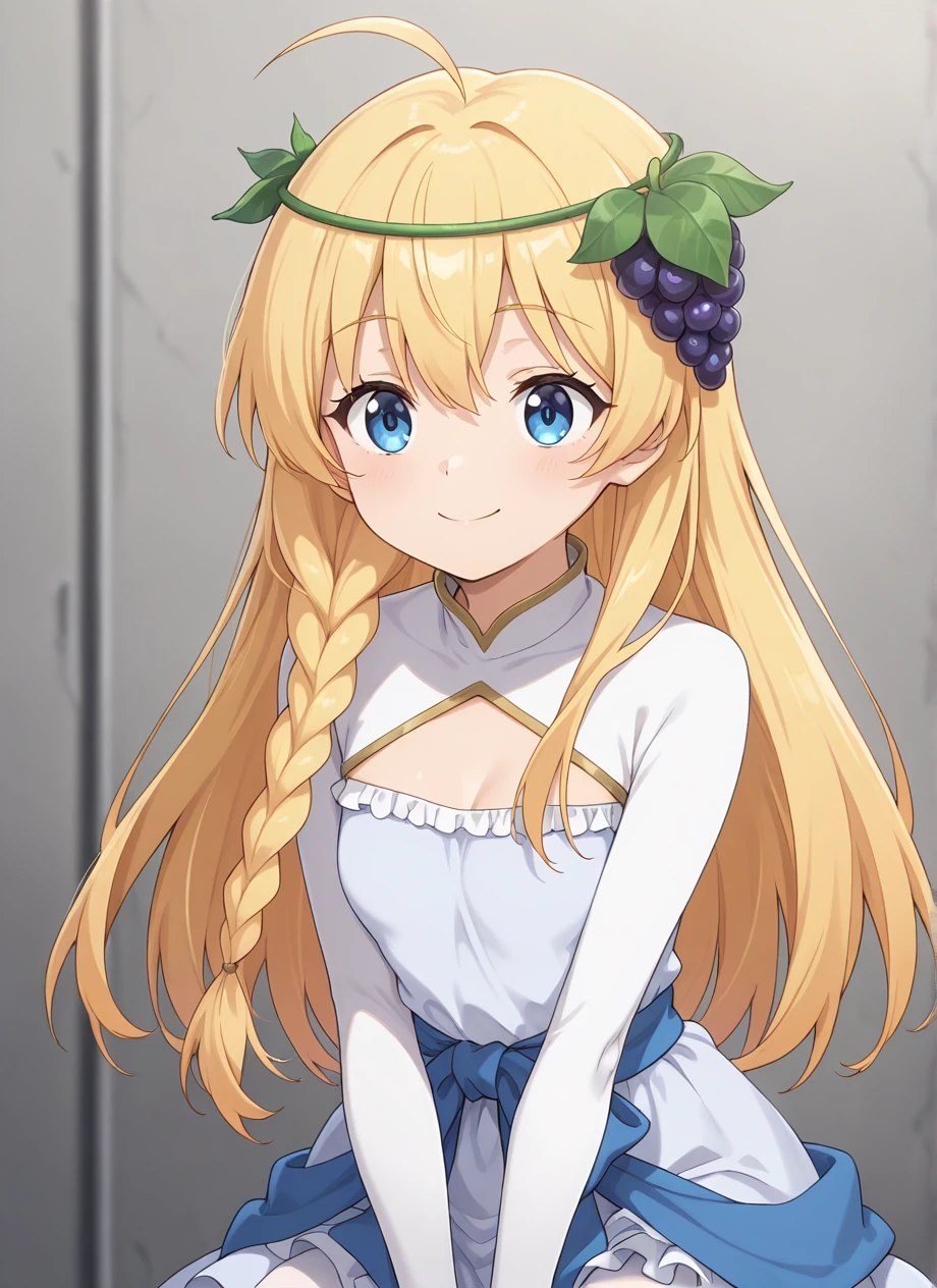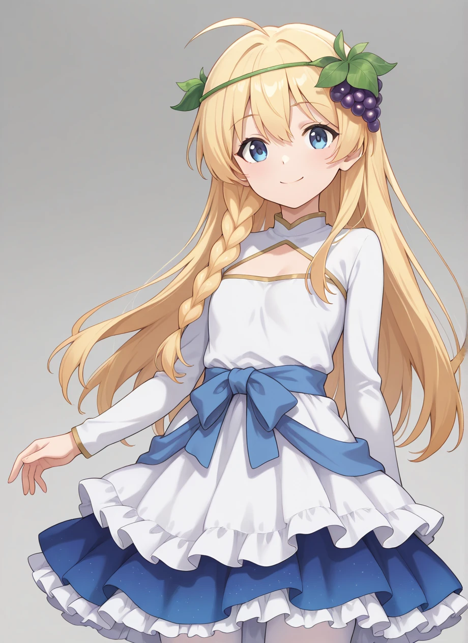 Prompt full: Iris-Liver020, long hair, blonde hair, blue eyes, single braid, side braid, hair between eyes, ahoge, hair ornament, flower, food-themed hair ornament, white dress, blue dress, layered dress, frills, cleavage cutout, clothing cutout, waist bow, sash, frilled dress, pantyhose, white pantyhose, blue footwear, white footwear, skirt hold, jewelry, floral head wreath, grapes