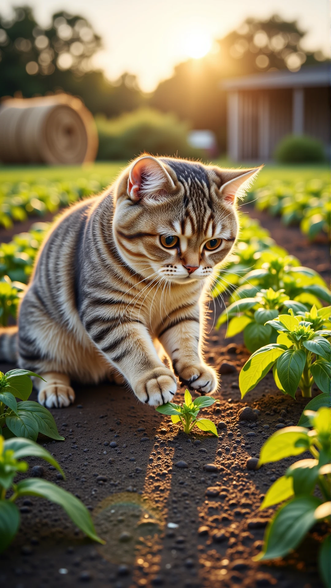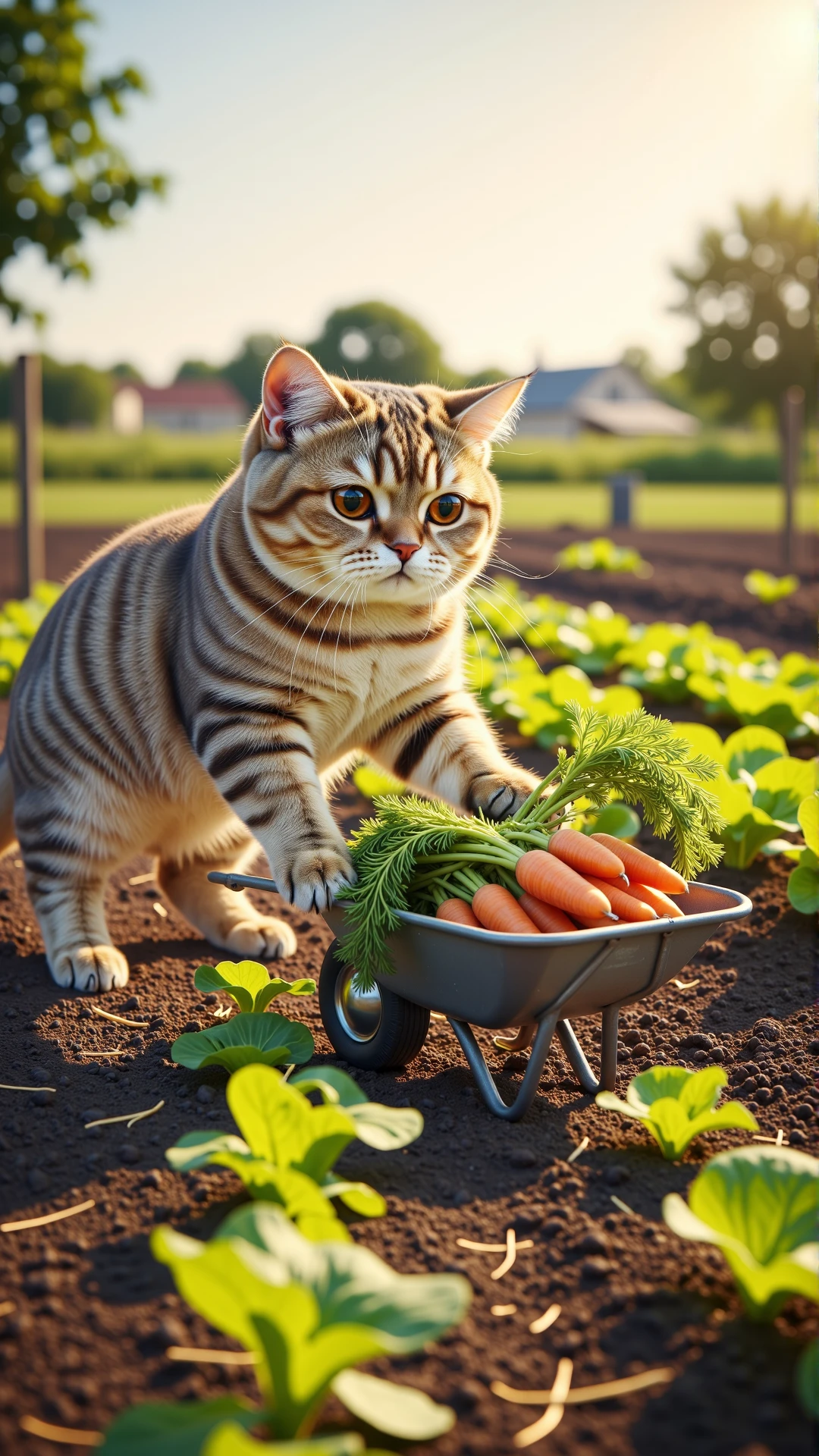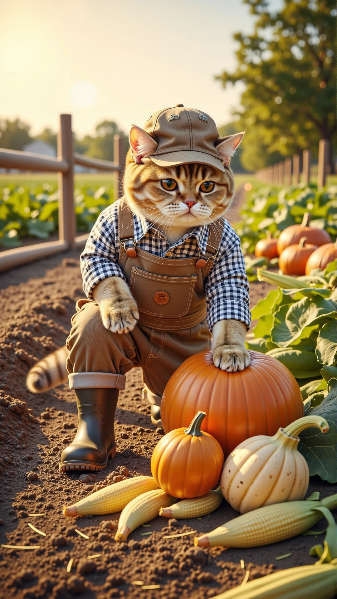 An ultra-detailed, photorealistic still image from a charming fantasy documentary, depicting an anthropomorphic British Shorthair cat, wearing a sturdy leather belt with attached gardening tools and a wide-brimmed straw hat, meticulously "watering" rows of flourishing vegetables on a sun-dappled farm in the late afternoon. The cat's dense, grey fur is visible around its face and paws, which delicately hold a large, antique metal watering can, the water arching gracefully onto healthy, vibrant green plants (e.g., rows of tall corn, leafy lettuce). Its large, expressive copper eyes show careful attention to its task. Patches of golden sunlight filter through distant fruit trees and a rustic wooden barn, creating beautiful dappled light on the soil and leaves. The light is directional, coming from the side and behind the cat, rim-lighting the water droplets and highlighting the textures of the plants and its farmer attire. The camera angle is eye-level, slightly off-center, employing a wide aperture to achieve a very shallow depth of field that isolates the anthropomorphic cat against a beautifully blurred background of expansive fields and farm structures. The composition is balanced and artistic, conveying a sense of idyllic charm and dedicated agricultural work. The mood is tranquil and productive, with warm color temperatures enhancing the afternoon ambiance, emphasizing the detailed textures of soil, water, plants, and the cat's clothing.