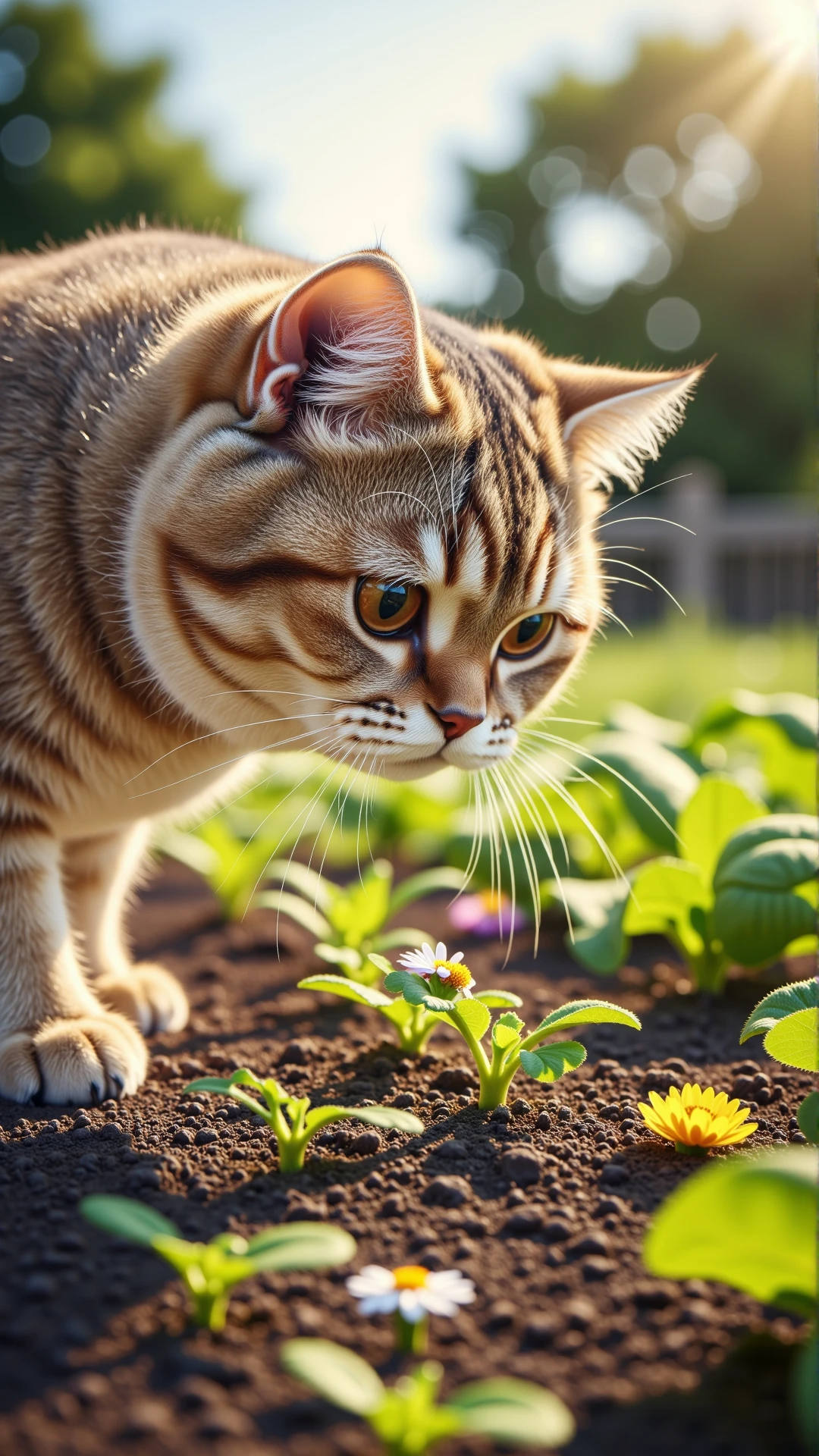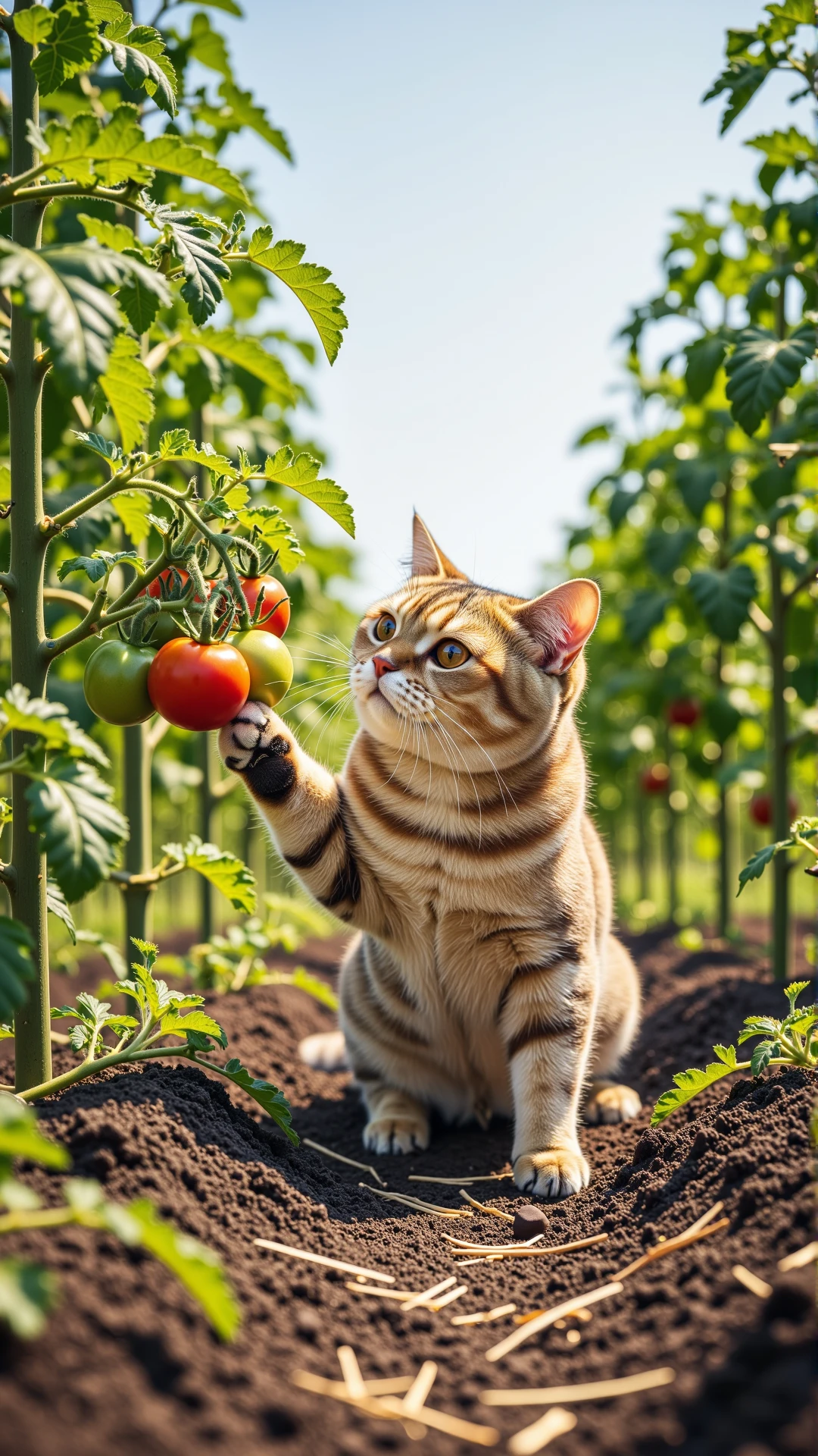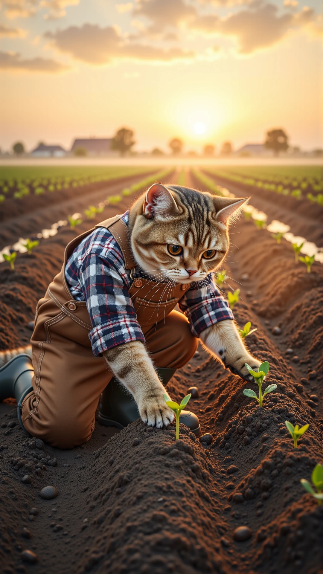 An ultra-detailed, photorealistic still image from a charming fantasy documentary, depicting an anthropomorphic British Shorthair cat, wearing a sturdy leather belt with attached gardening tools and a wide-brimmed straw hat, meticulously "watering" rows of flourishing vegetables on a sun-dappled farm in the late afternoon. The cat's dense, grey fur is visible around its face and paws, which delicately hold a large, antique metal watering can, the water arching gracefully onto healthy, vibrant green plants (e.g., rows of tall corn, leafy lettuce). Its large, expressive copper eyes show careful attention to its task. Patches of golden sunlight filter through distant fruit trees and a rustic wooden barn, creating beautiful dappled light on the soil and leaves. The light is directional, coming from the side and behind the cat, rim-lighting the water droplets and highlighting the textures of the plants and its farmer attire. The camera angle is eye-level, slightly off-center, employing a wide aperture to achieve a very shallow depth of field that isolates the anthropomorphic cat against a beautifully blurred background of expansive fields and farm structures. The composition is balanced and artistic, conveying a sense of idyllic charm and dedicated agricultural work. The mood is tranquil and productive, with warm color temperatures enhancing the afternoon ambiance, emphasizing the detailed textures of soil, water, plants, and the cat's clothing.