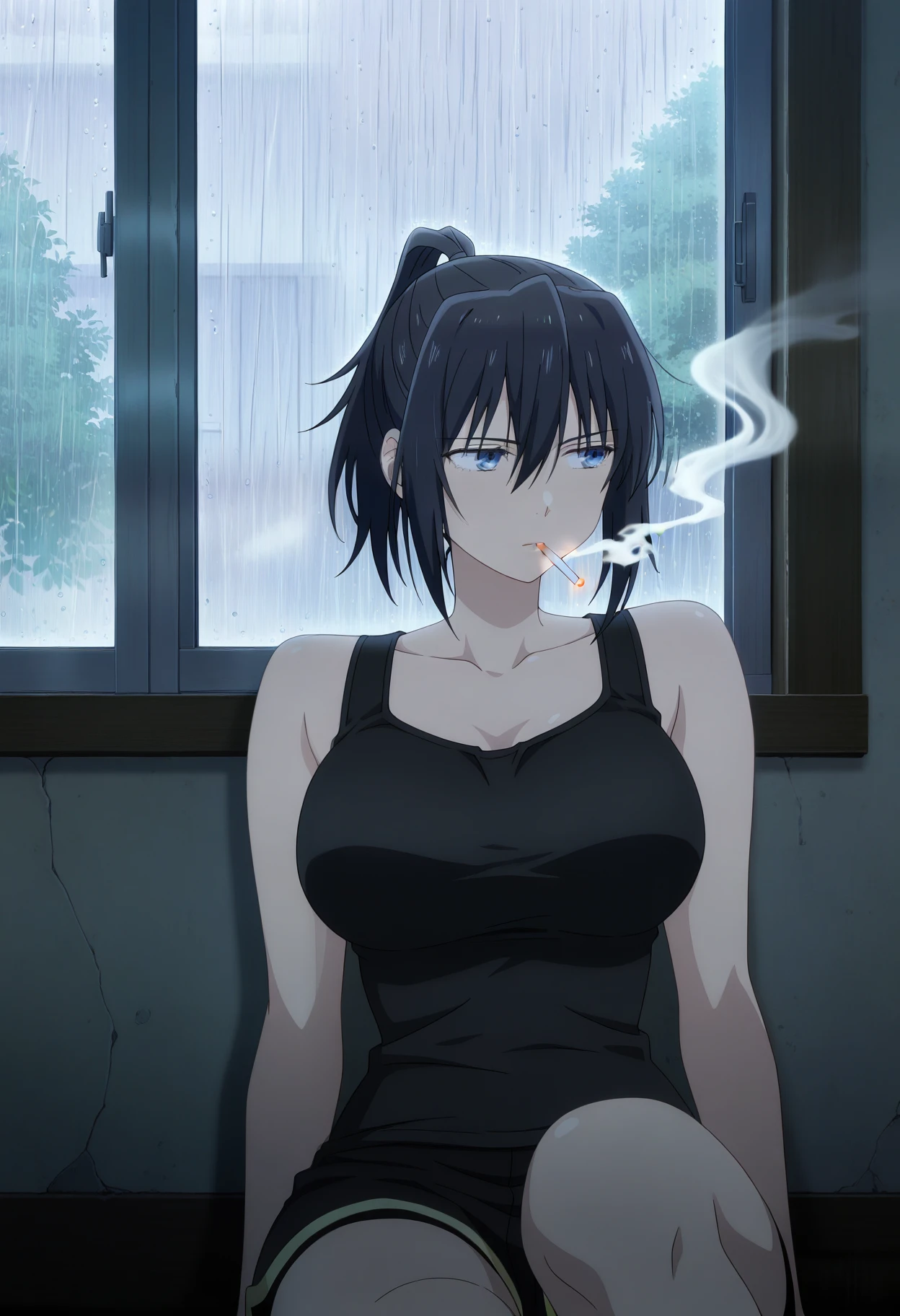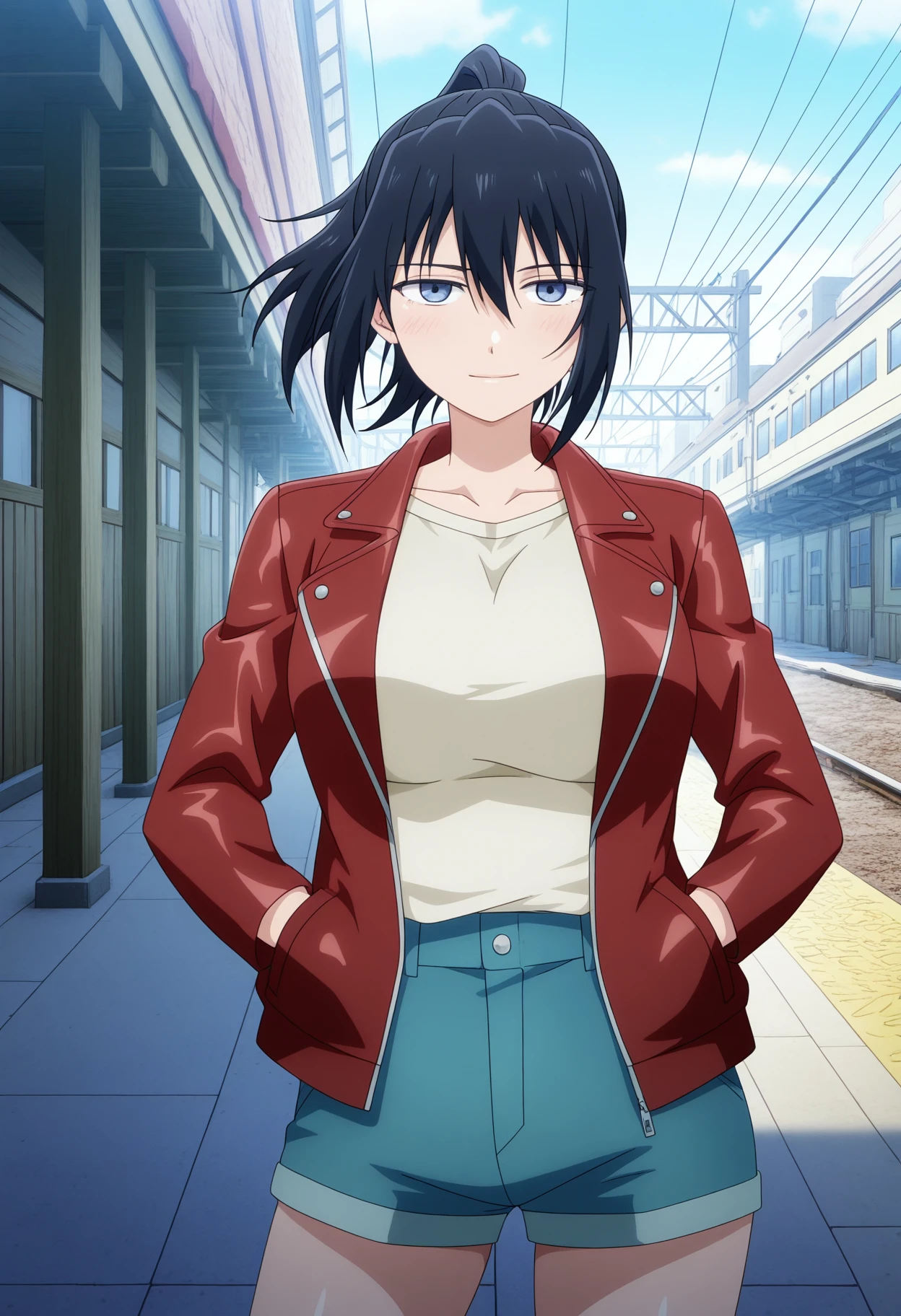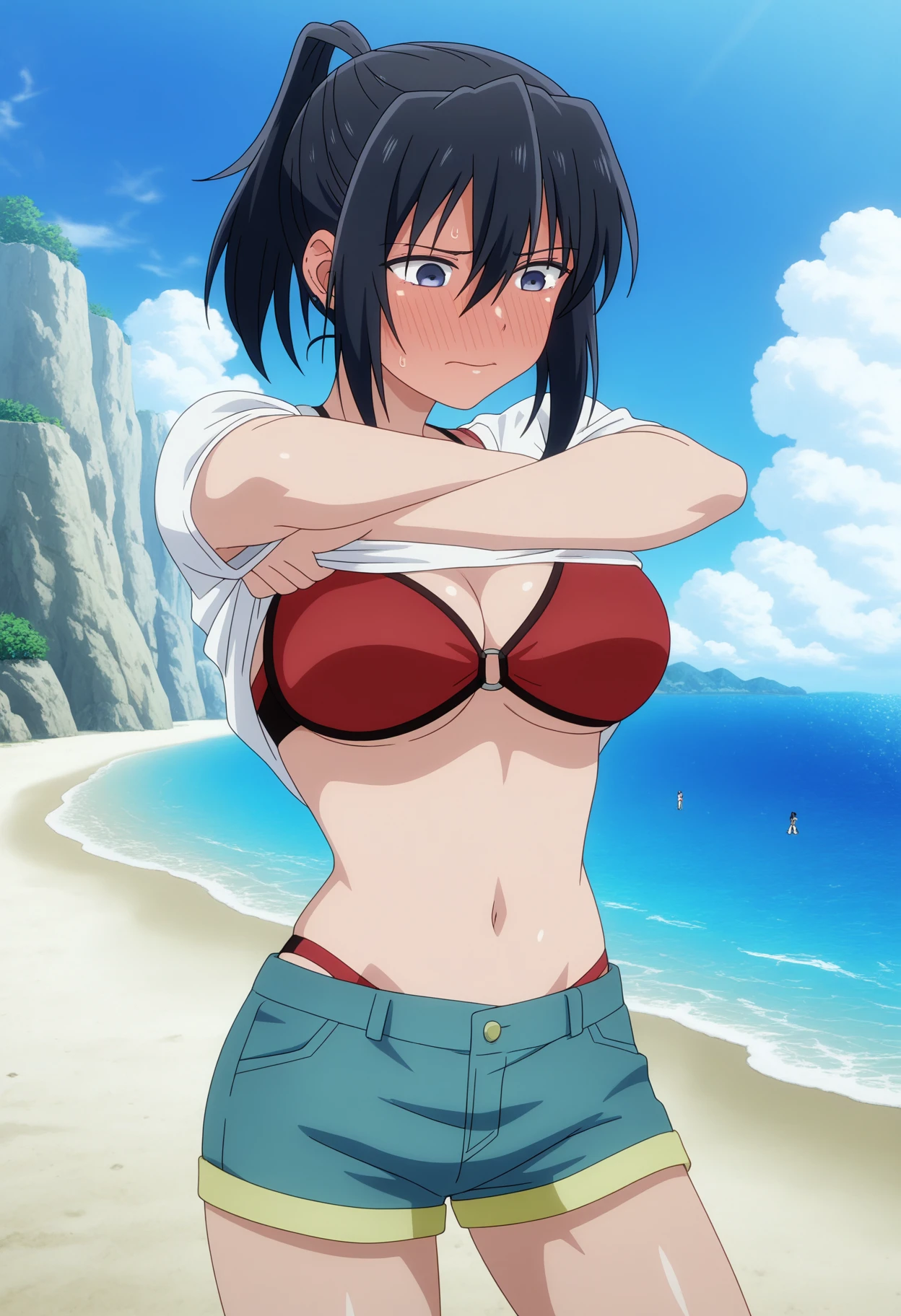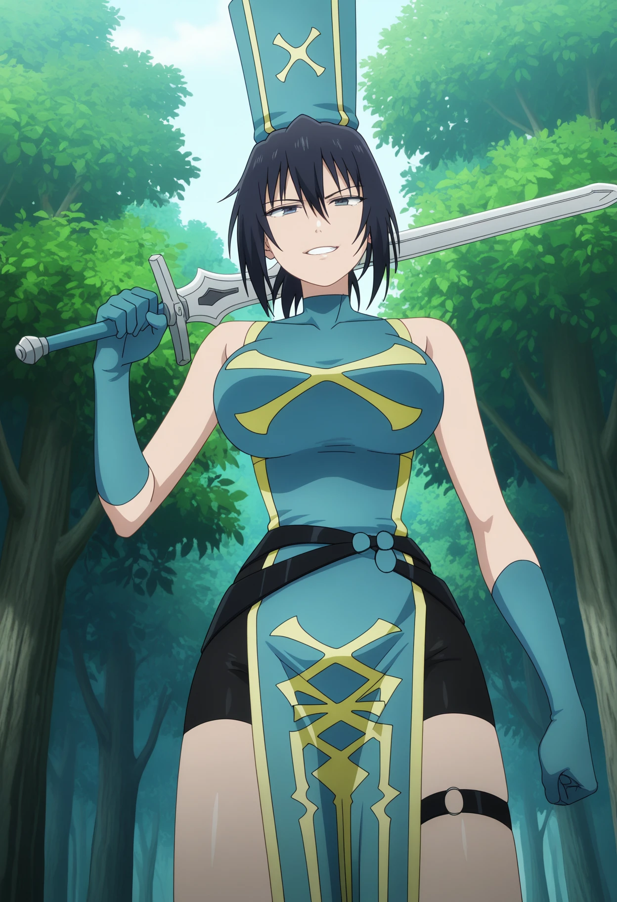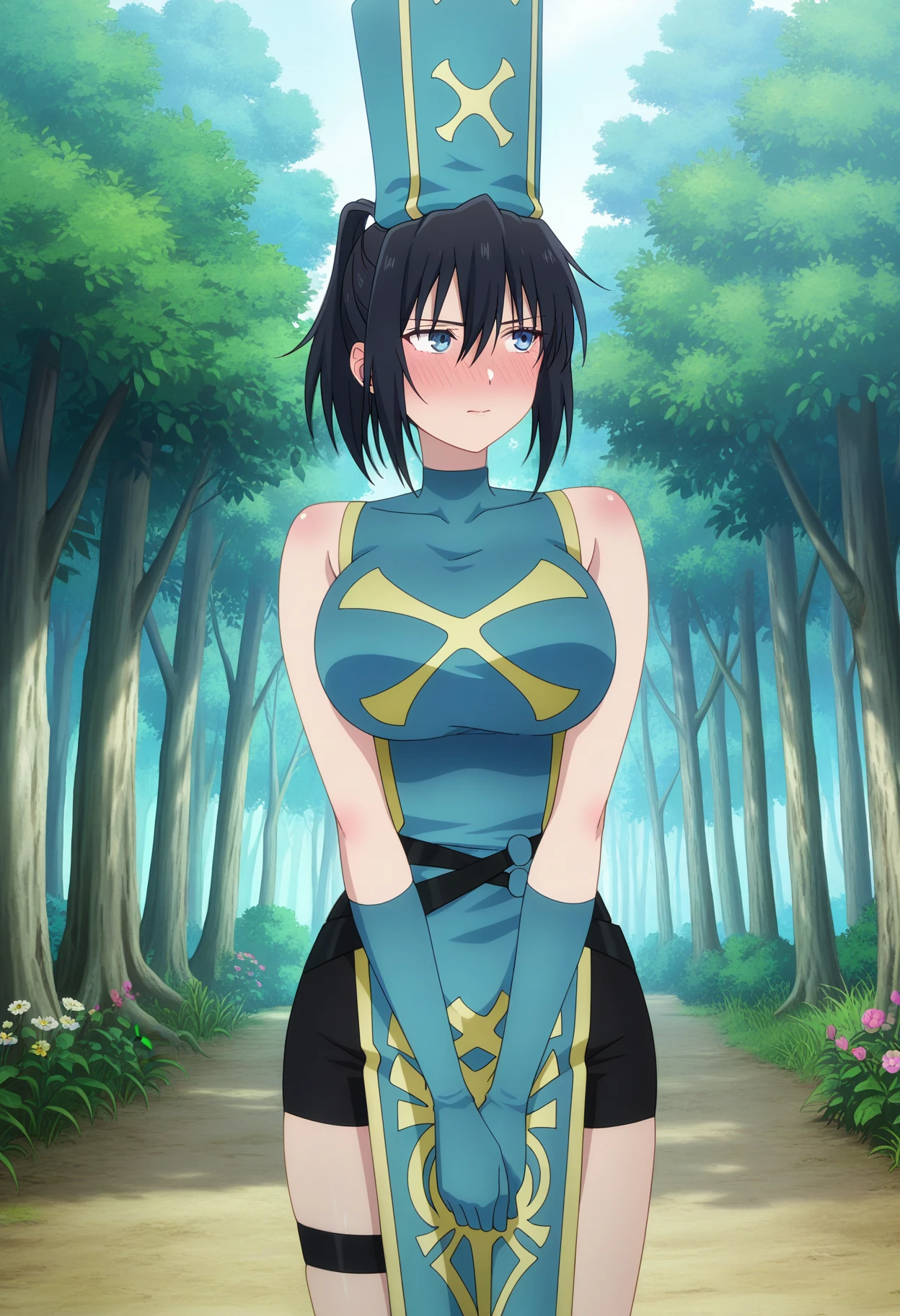 anemonewz, black hair, medium hair, ponytail, hair between eyes, blue eyes, large breasts, blue headwear, mitre, elbow gloves, blue gloves, bare shoulders, pelvic curtain, sleeveless, chinese clothes, blue dress, black shorts, shorts, under dress, blue tabard