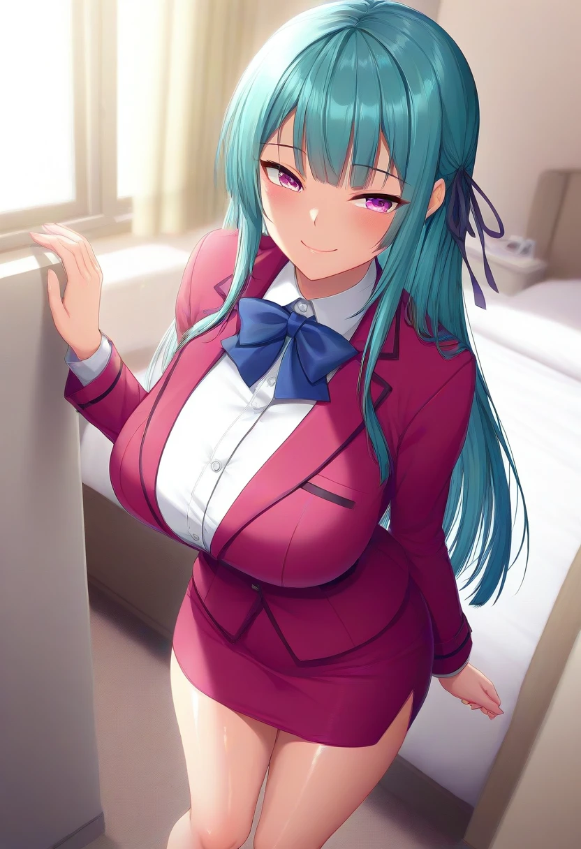 Saya Takamine, violet eyes, cyan hair, long hair, straight hair, blunt bangs, sidehair, hair ribbon,