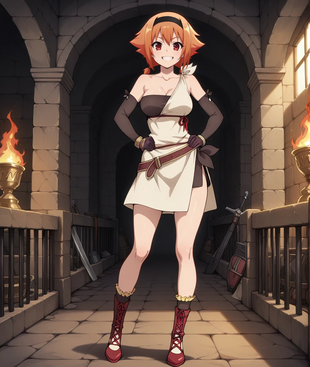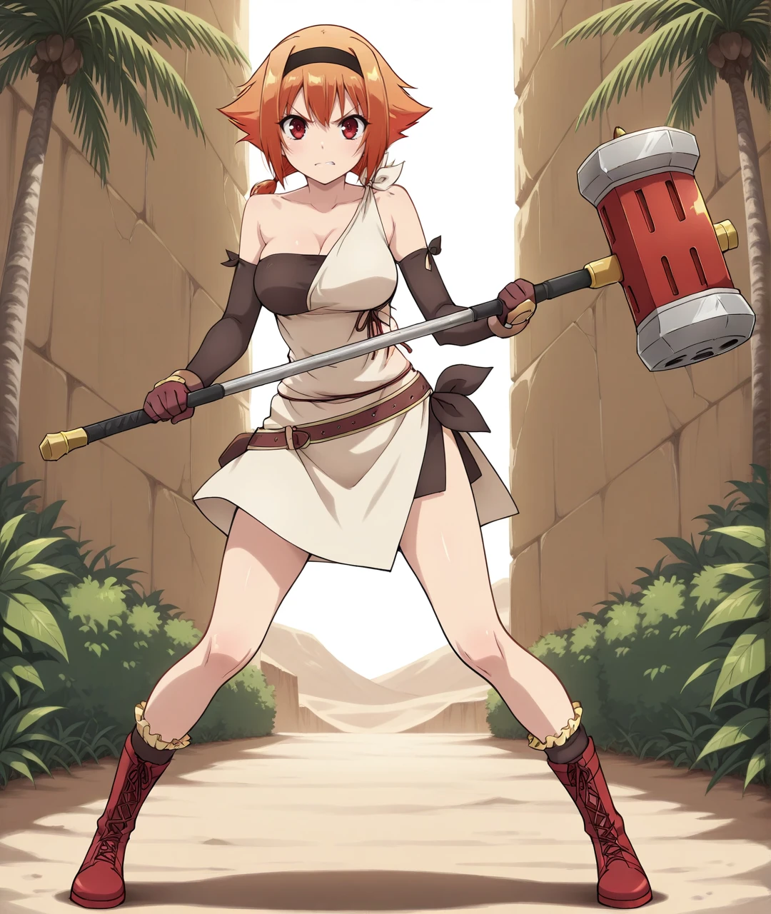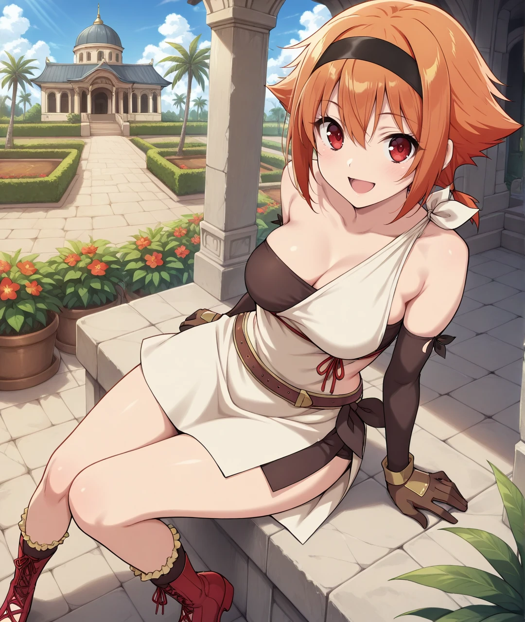 IngridBase, red eyes, short hair, orange hair, bow, twintails, short twintails, black hairband, bare shoulders, collarbone, medium breasts, strapless, sleeveless dress, asymmetrical dress, short dress, two-tone dress, brown dress, beige dress, side slit, short skirt, side slit skirt, tied sash, cloth wrap, brown belt, black elbow gloves, arm warmers, brown gloves, bare legs, brown boots, red boots, lace up boots, frilled socks,