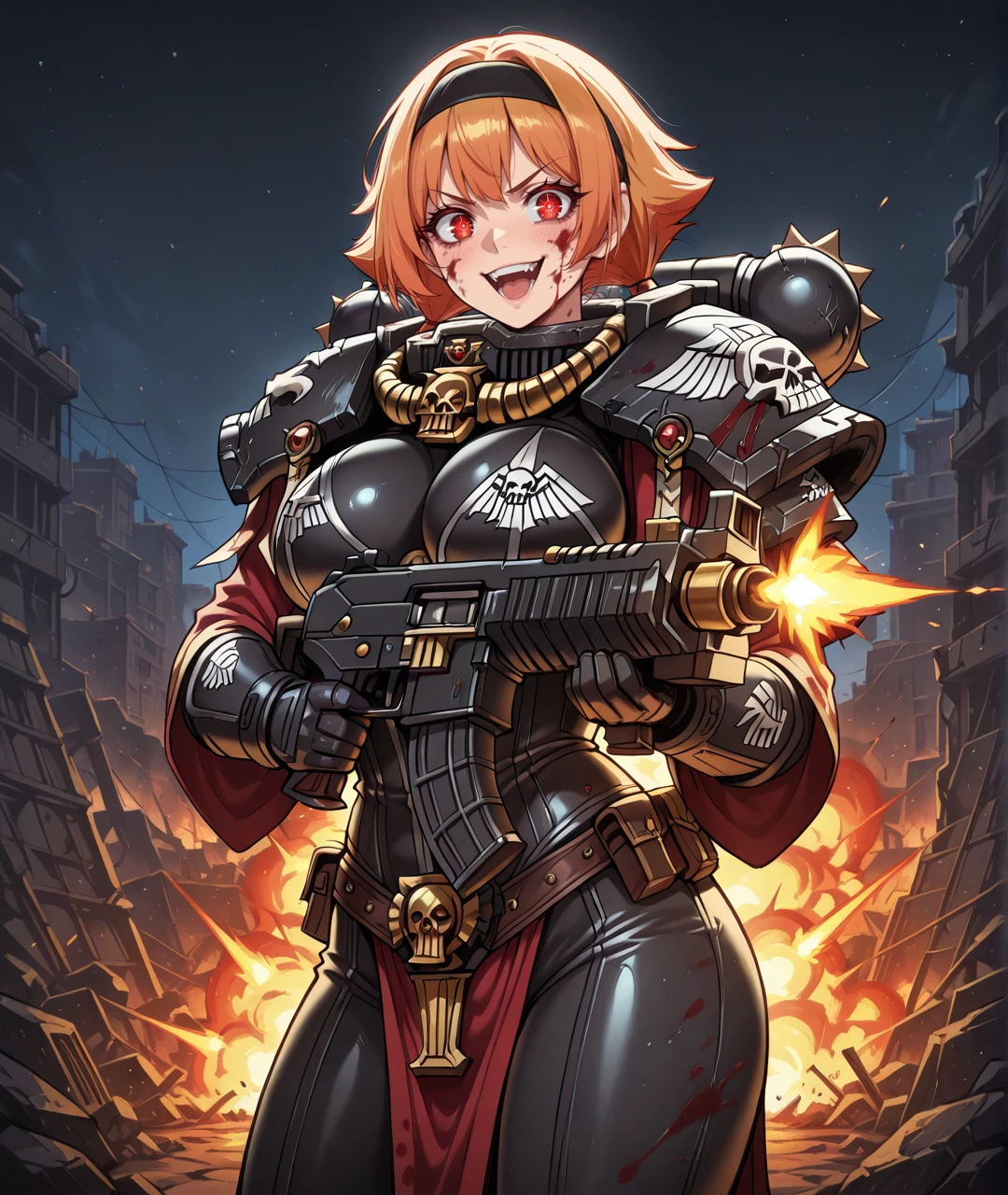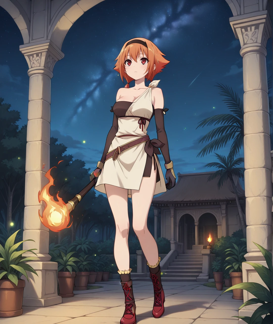 Tags: IngridBase, red eyes, short hair, orange hair, bow, twintails, short twintails, black hairband, ???? shoulders, collarbone, ??????????????, strapless, sleeveless dress, asymmetrical dress, short dress, two-tone dress, brown dress, beige dress, side slit, short skirt, side slit skirt, tied sash, cloth wrap, brown belt, black elbow gloves, arm warmers, brown gloves, ???? legs, brown boots, red boots, lace up boots, frilled socks,