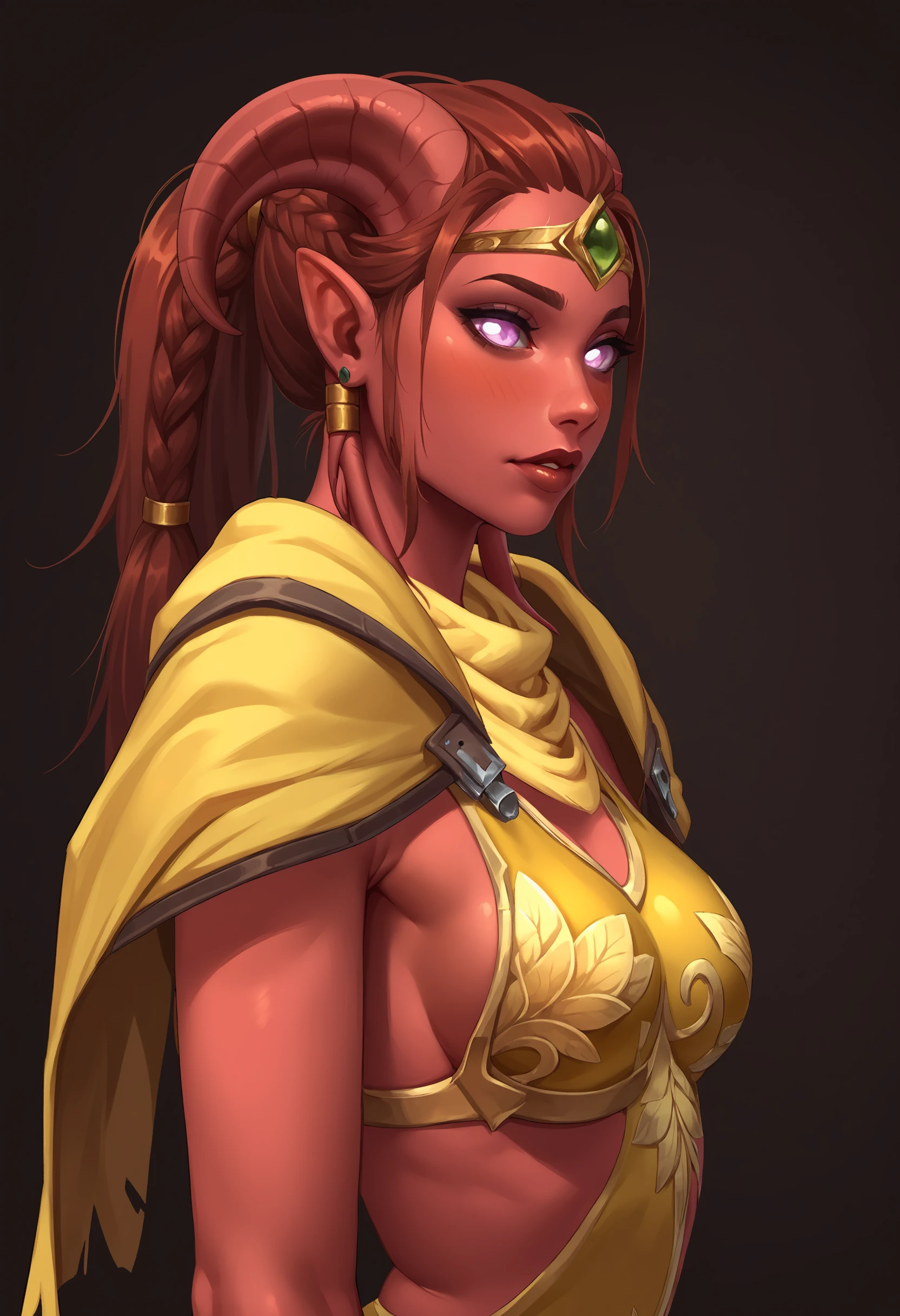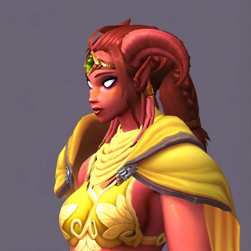 Annora,female,draenei, red skin, long red hair, braided ponytail hair, gold tiara with emerald, glowing pink eyes, red curved horns, golden dress, golden scarf, golden fabric shoulderpads,