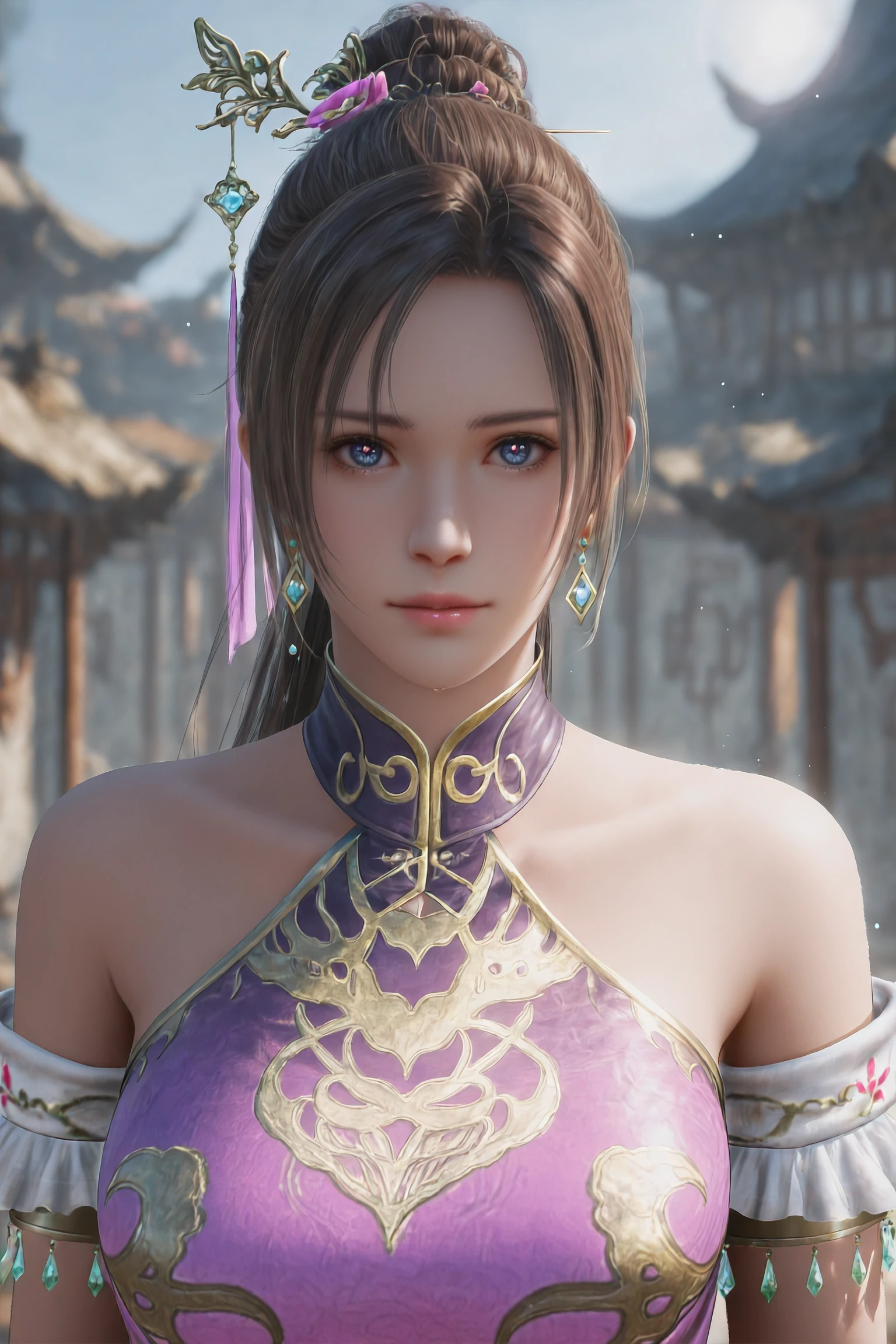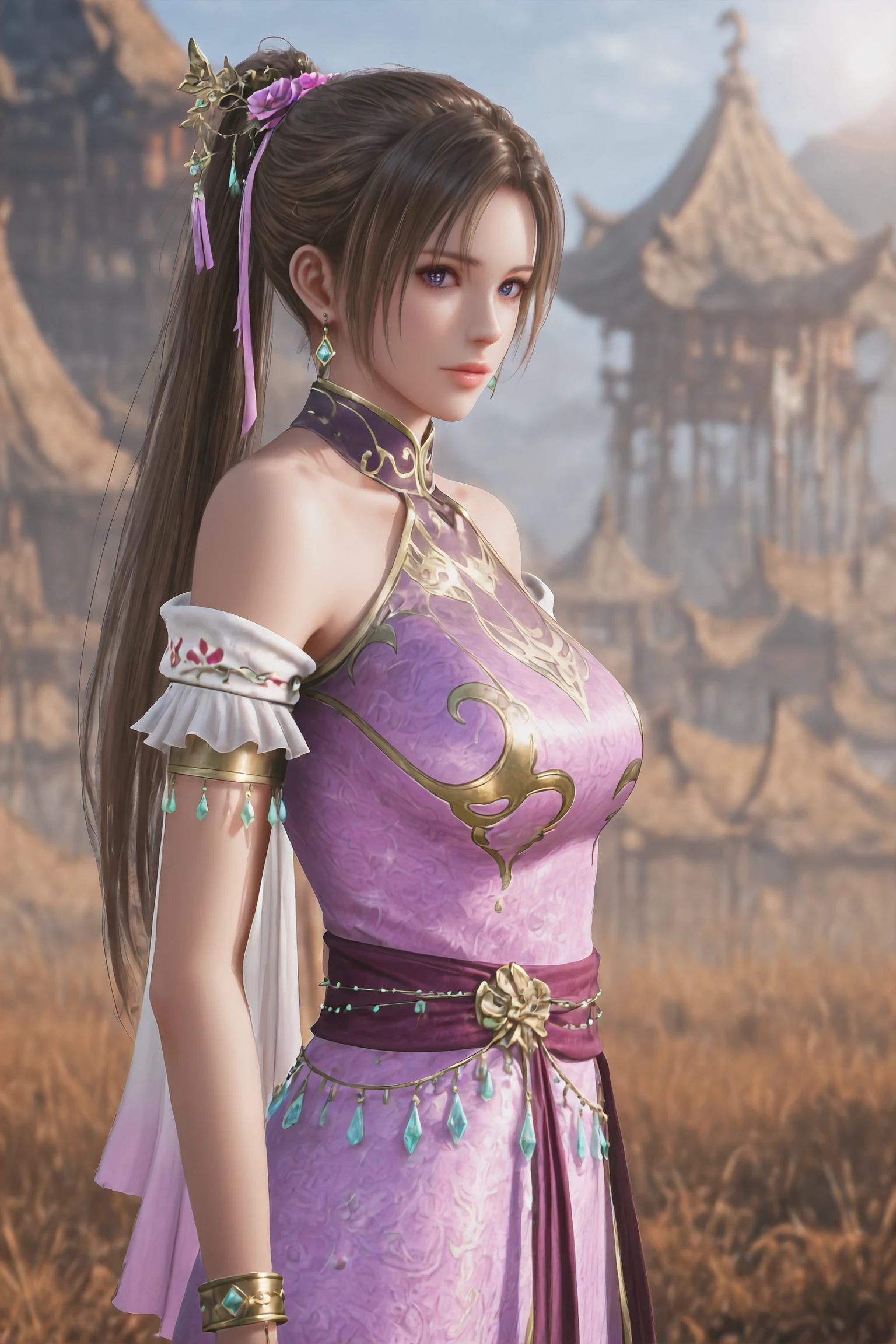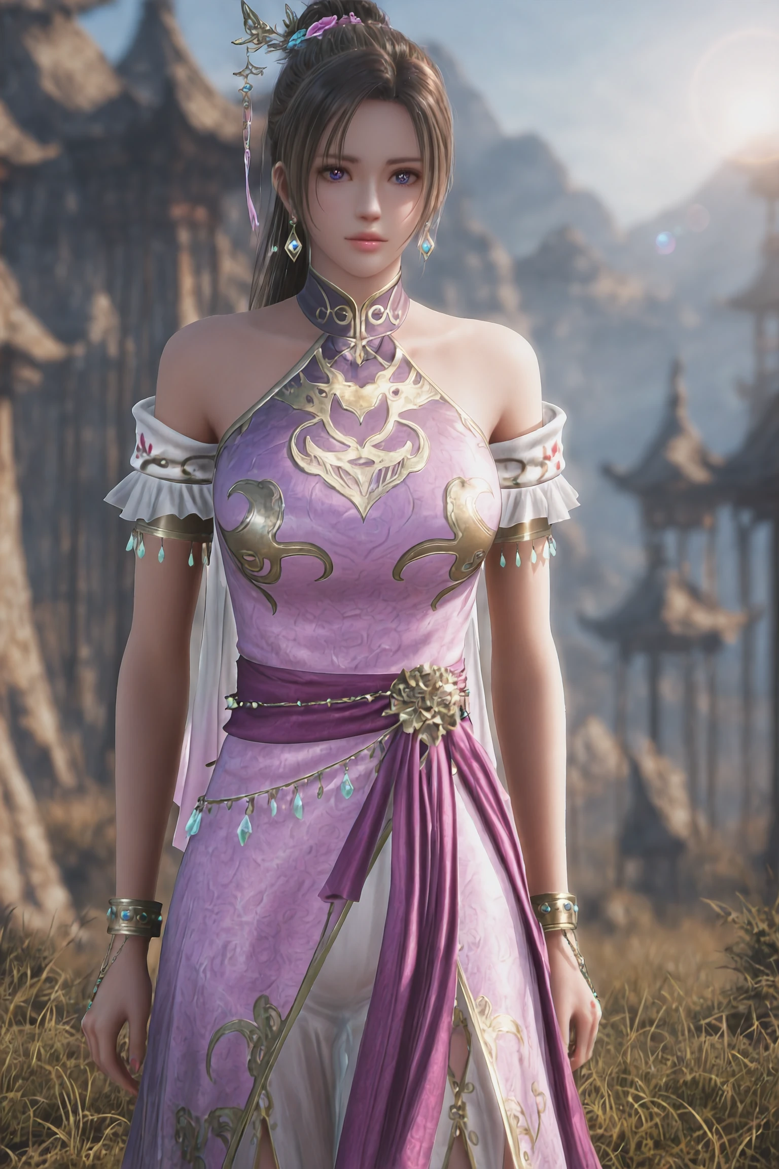 1girl,solo,DiaoChanOrigin,jewelry,earrings,brown hair,hair ornament,dress,bare shoulders,chinese clothes,purple dress,long hair,ponytail,pink dress,bracelet,hair bun,blue eyes,