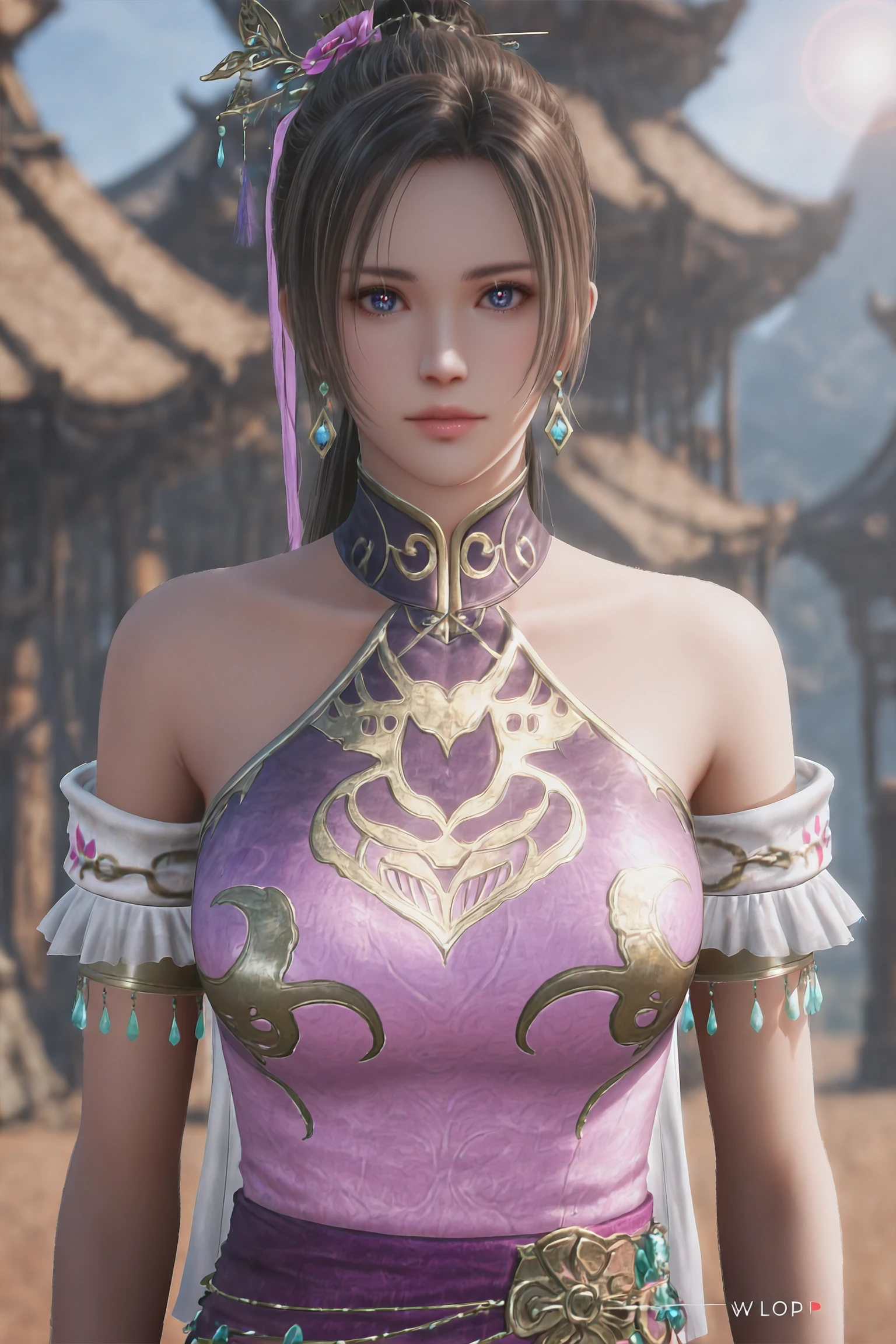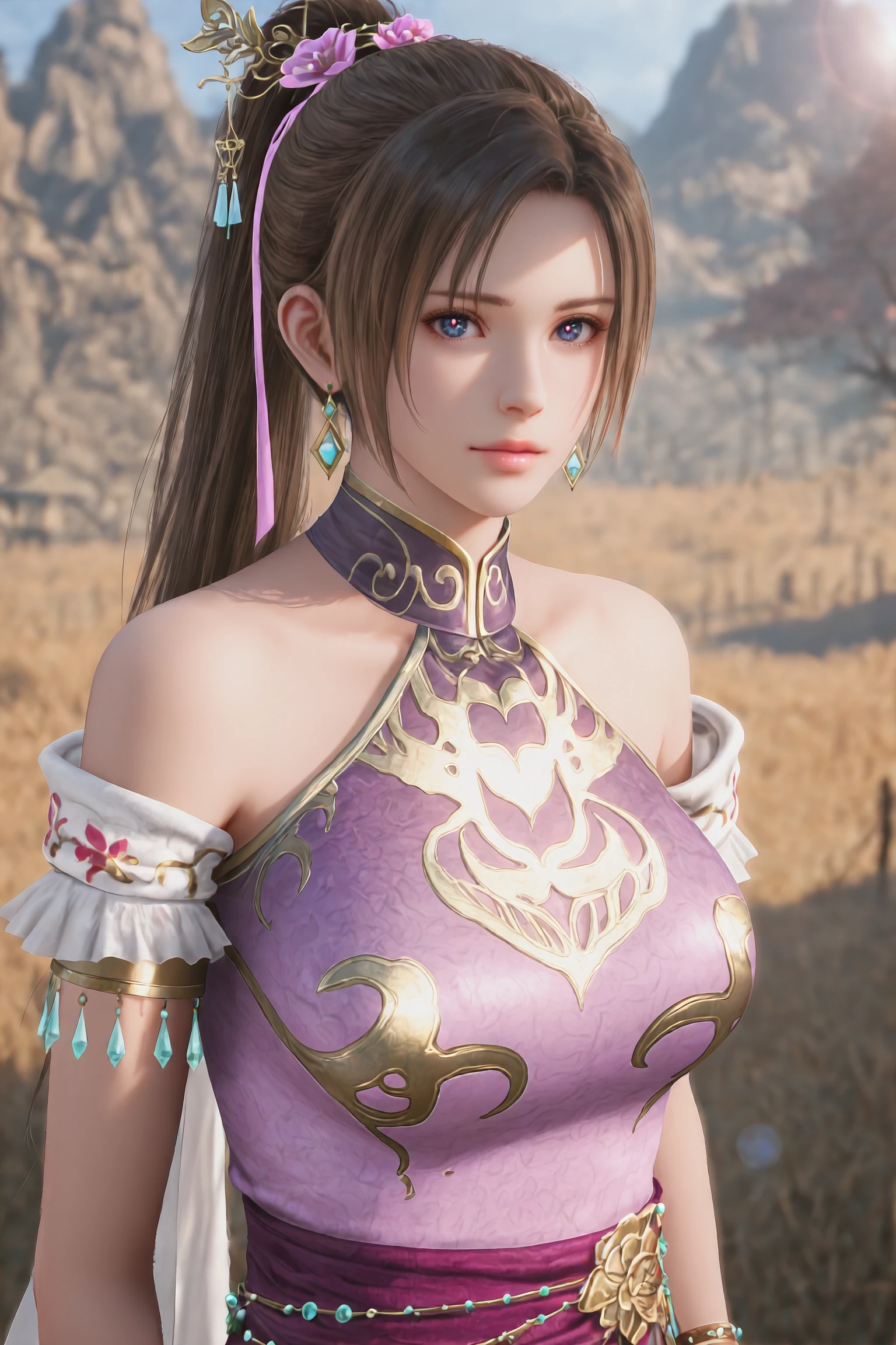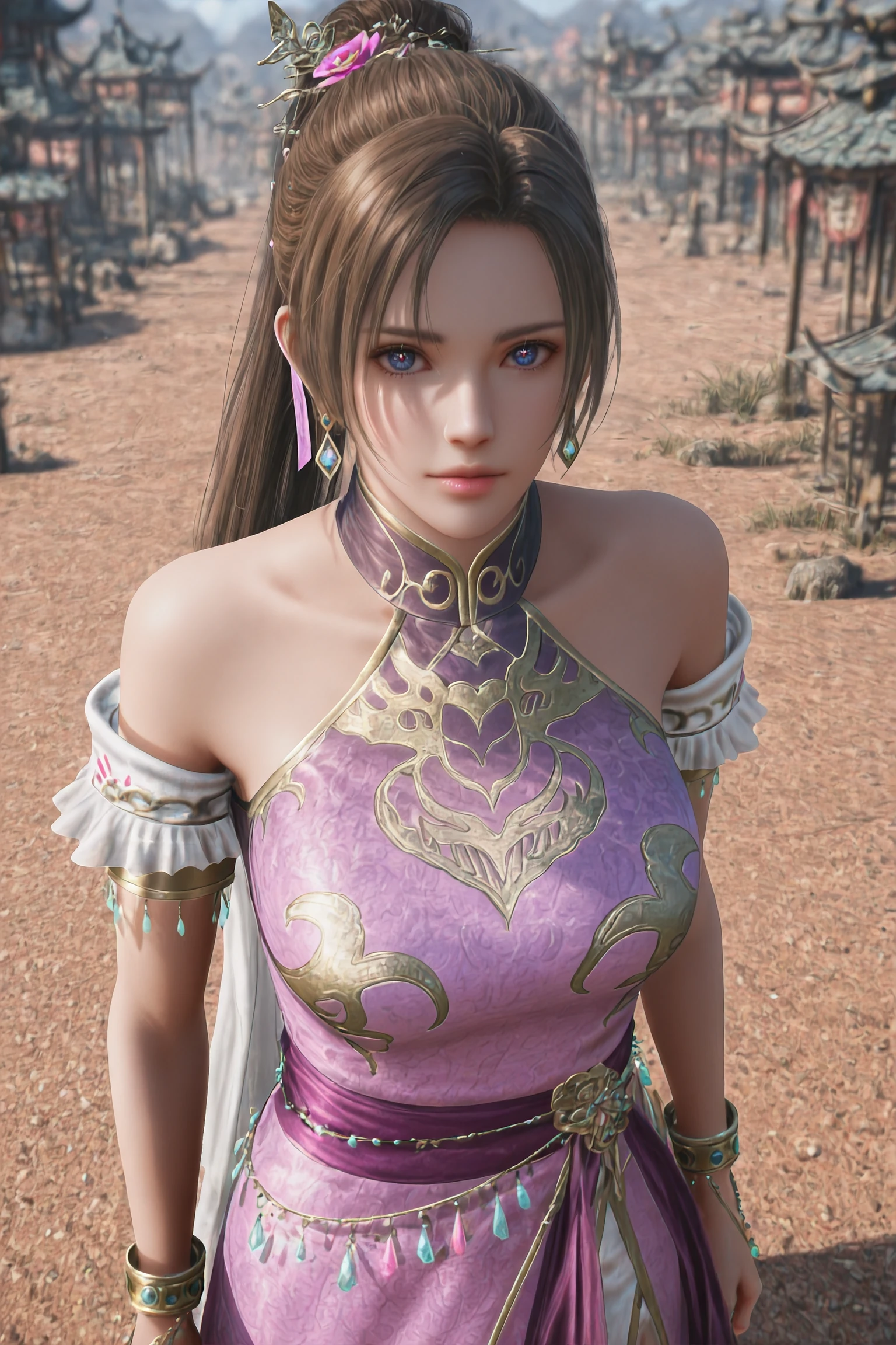 1girl,solo,DiaoChanOrigin,jewelry,earrings,brown hair,hair ornament,dress,bare shoulders,chinese clothes,purple dress,long hair,ponytail,pink dress,bracelet,hair bun,blue eyes,