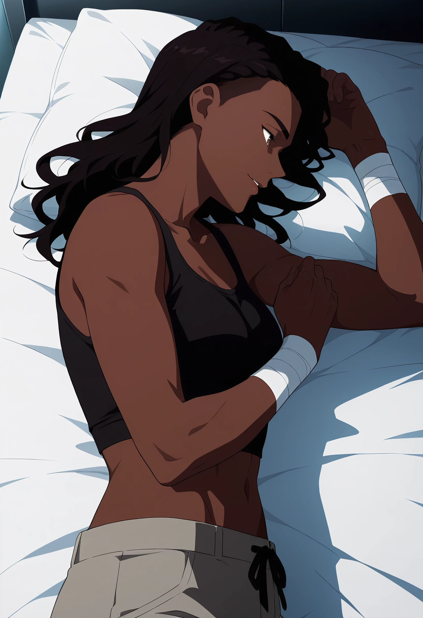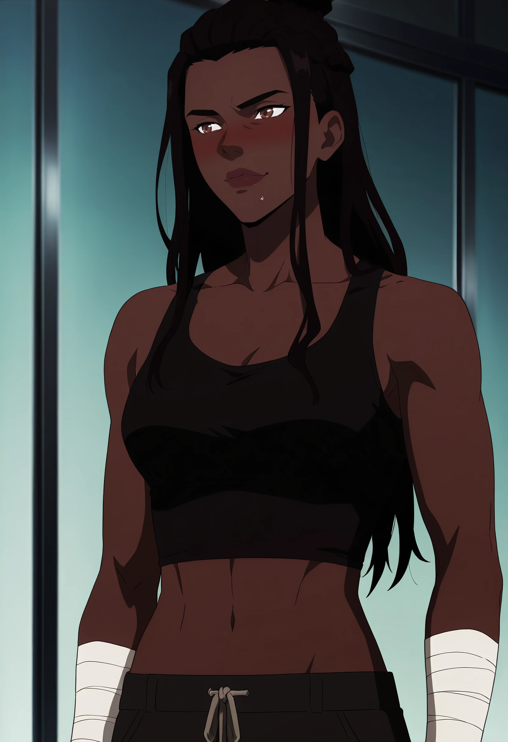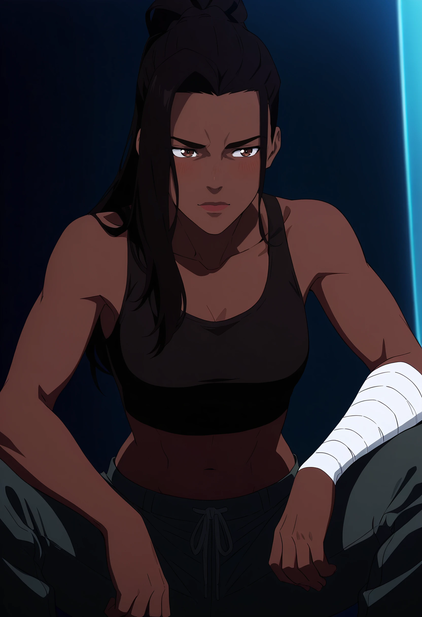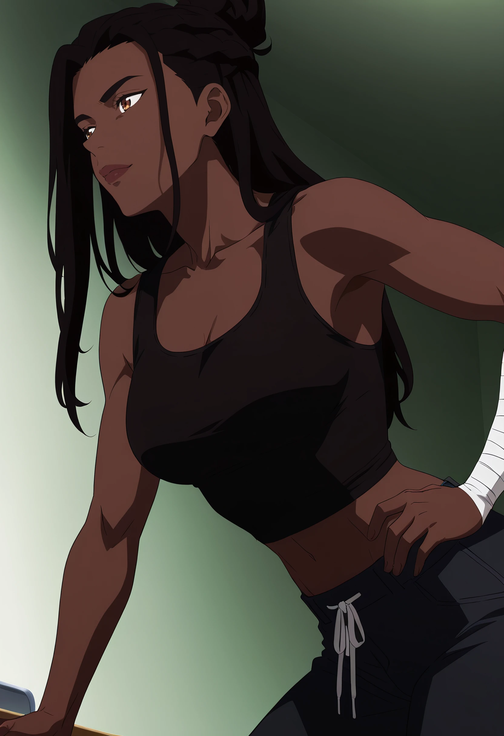 ZinniaTanktop, shirt, tank top, collarbone, bare shoulders, bandages, bandaged arm, sleeveless, black shirt, crop top, navel, midriff,