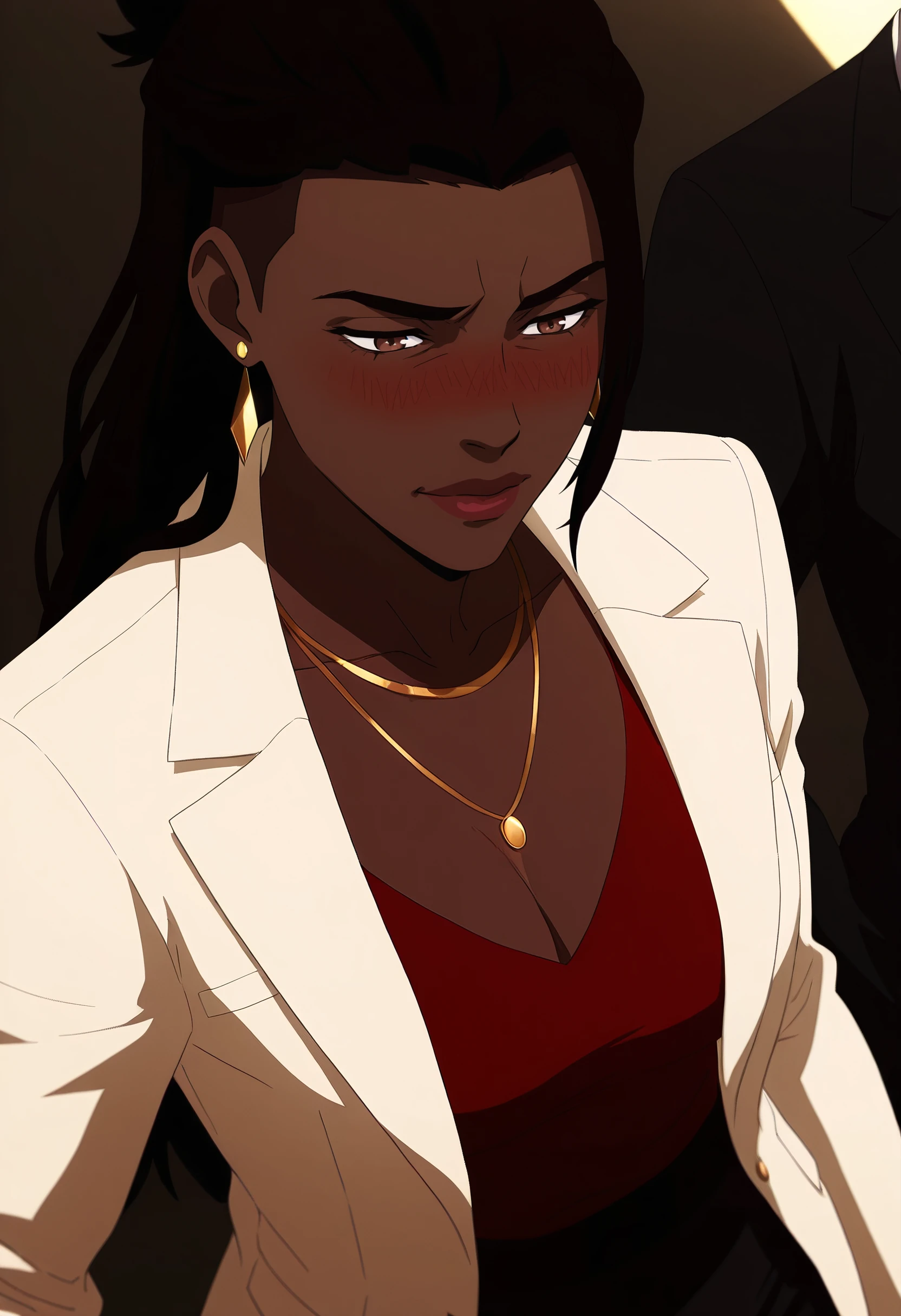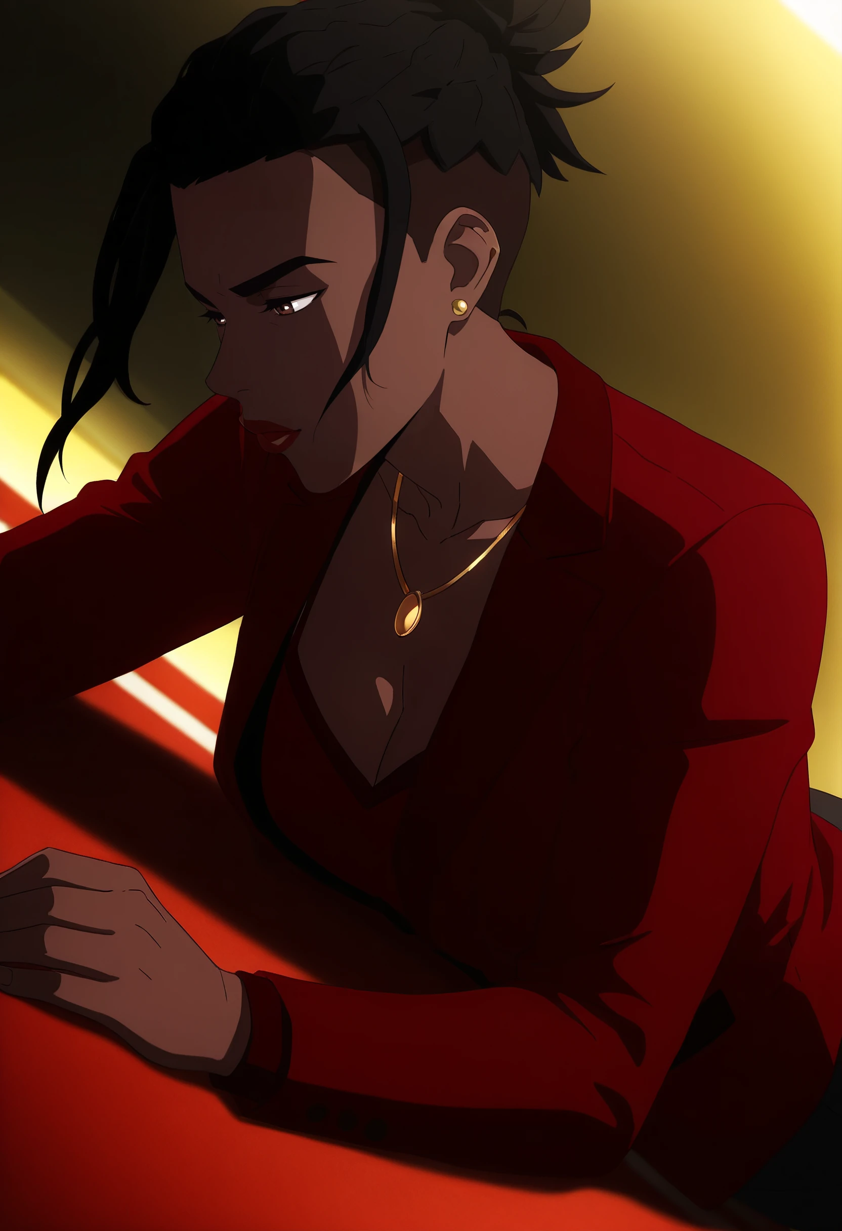 ZinniaDress, jewelry, necklace, earrings, shirt, short hair, lips, makeup, jacket, red shirt, formal, suit, collarbone, lipstick, cleavage,