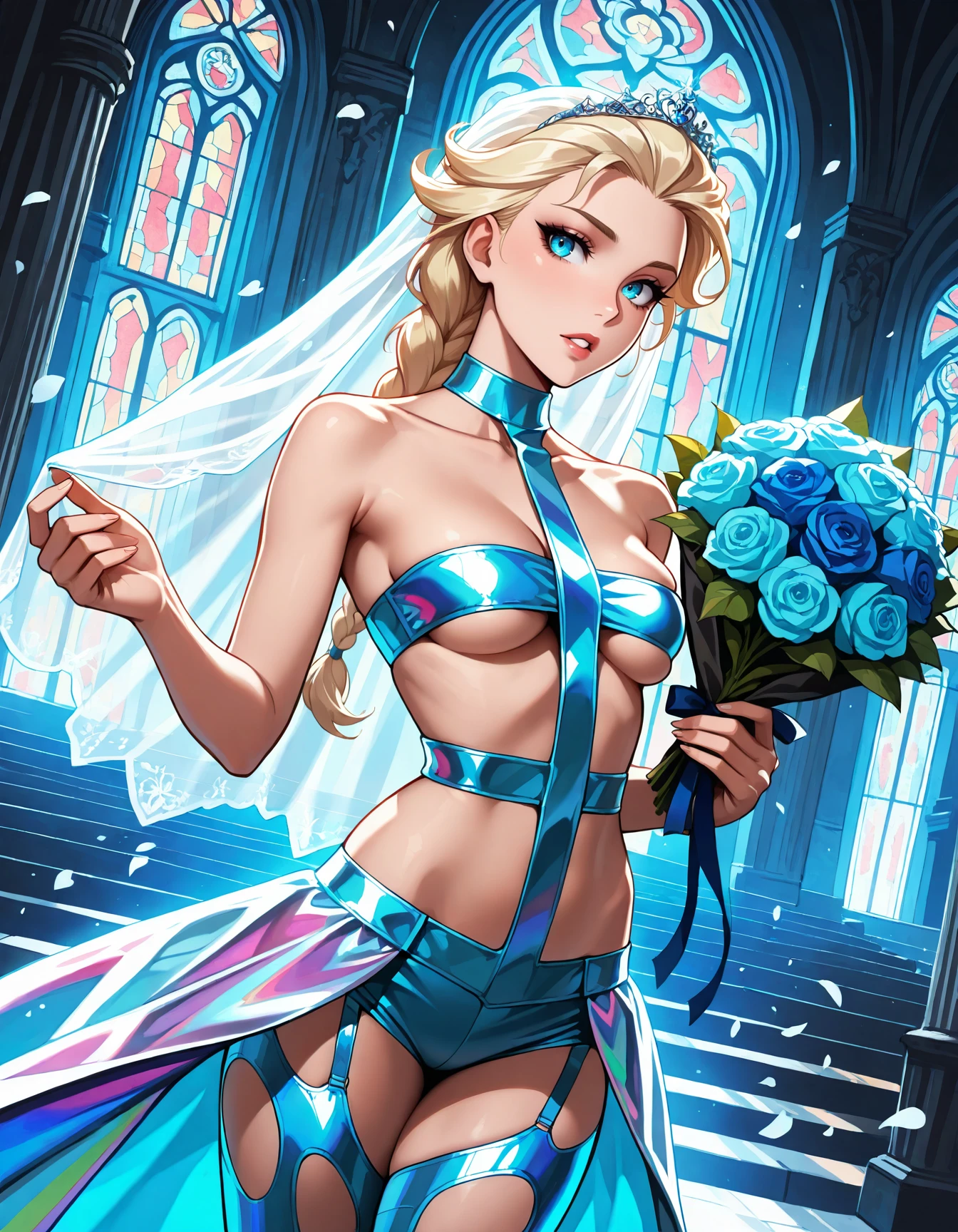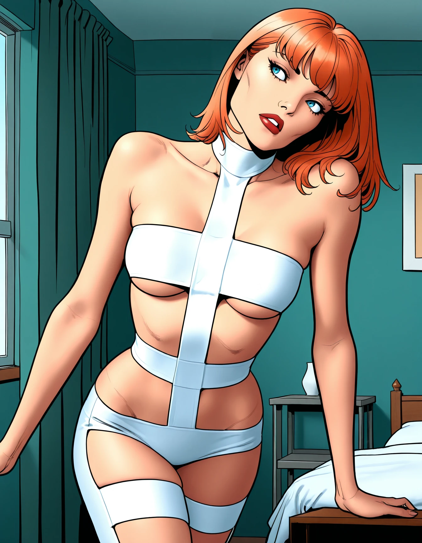 Invoke with l33l00_escape, orange hair, strapless, midriff, white harness, white clothing, clothing cutout, tube top,small breasts, underboob cutout, thigh cutout, bare arms, bare shoulders, collarbone,