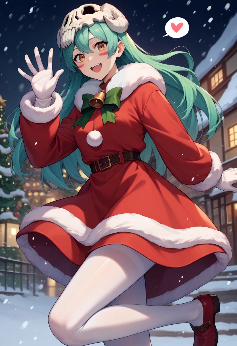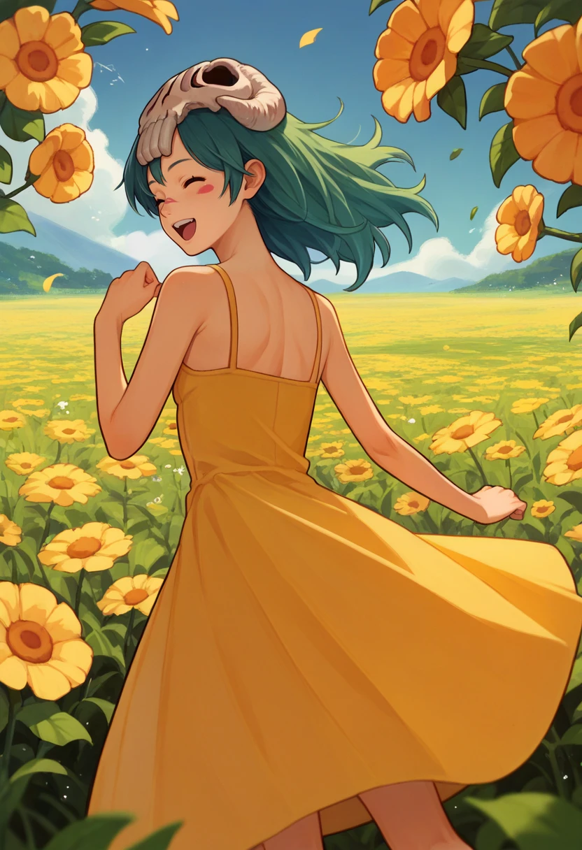 Default Outfit: skull, torn clothes, green shirt, underboob, green skirt