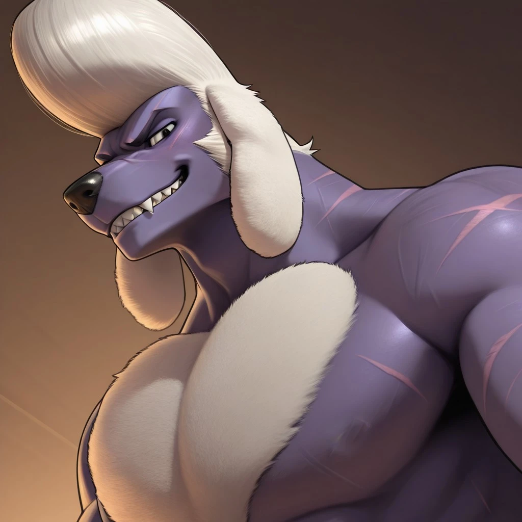 weredog, dog boy, poodle, purple skin, white fur, pompadour, white chest fur, black eyes, black nose, Fluffy dog ears, fluffy wrists, fluffy ankles, claws, muscular figure, abs, muscular male, scars,