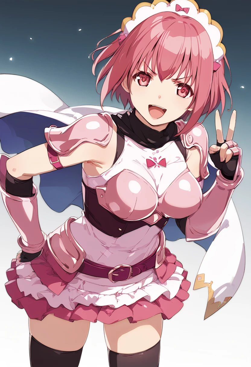skirt, thighhighs, gloves, elbow gloves, armor, shoulder armor, black thighhighs, pauldrons, pink skirt, zettai ryouiki, armored dress, frills, capelet, gauntlets,head ornament,