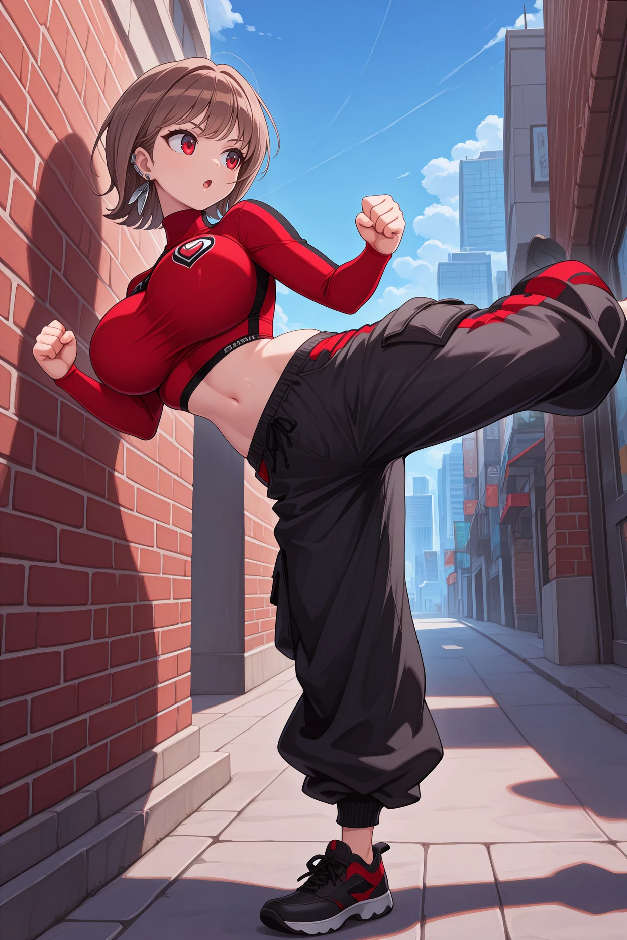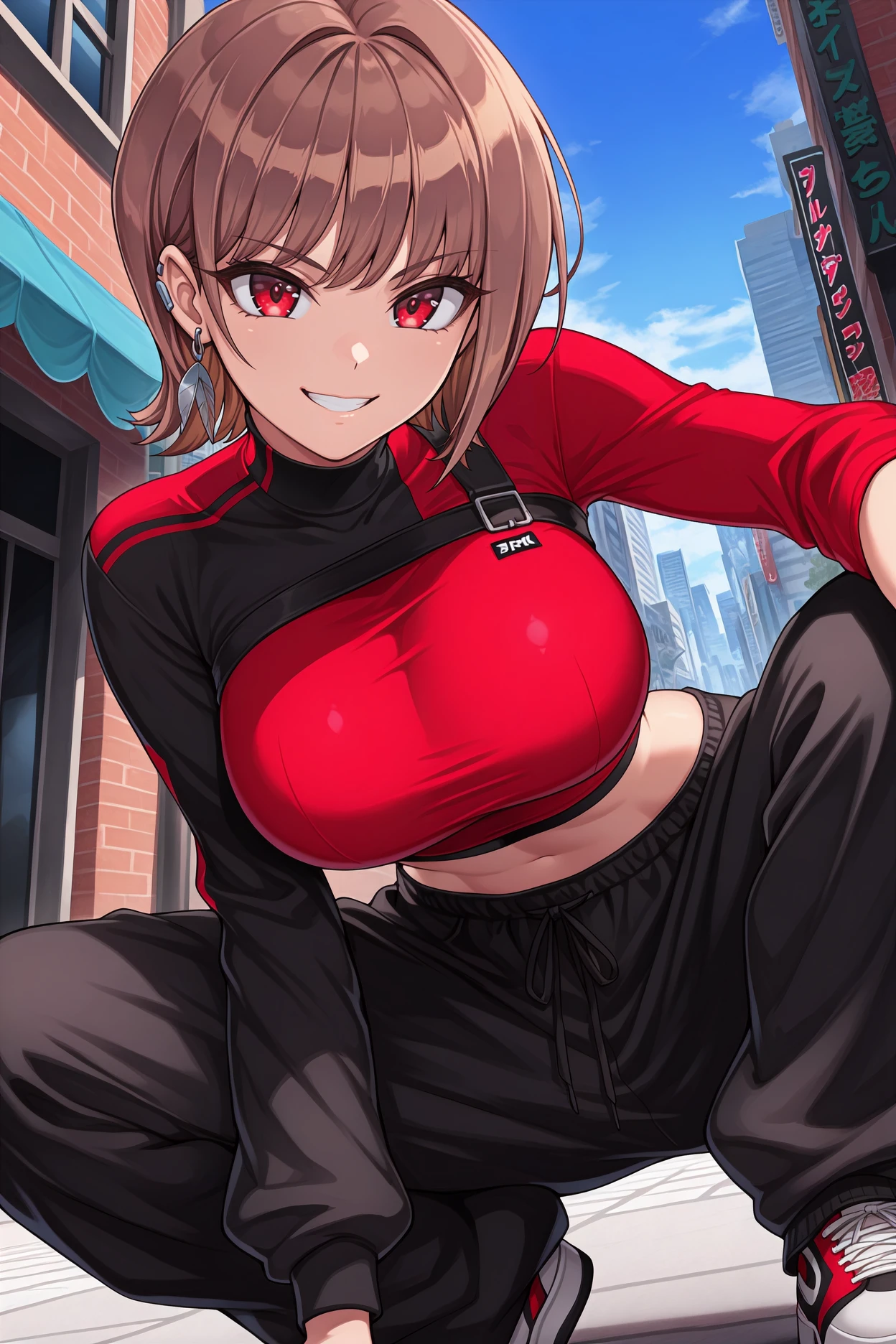 Add "turtleneck, red shirt, black shirt, multicolored shirt, cropped shirt, midriff, black pants, baggy pants" for her cropped shirt/pants look.