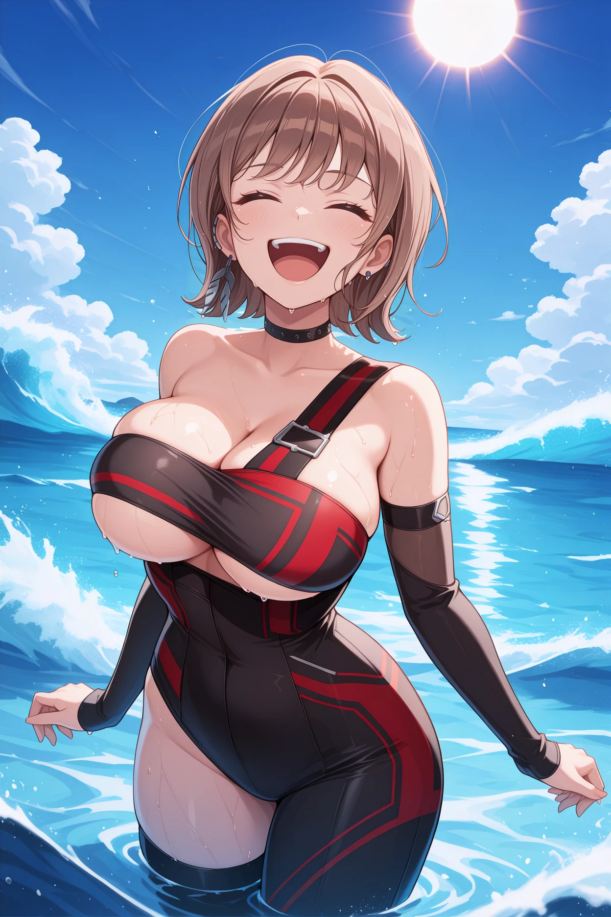 Add "earrings, black choker, bare shoulders, single strap, cleavage, black bodysuit, two-tone bodysuit, clothing cutout, underboob, stomach cutout, detached sleeves, single pantsleg, single thighhigh, black thighhigh" for her cutout bodysuit/diving suit.