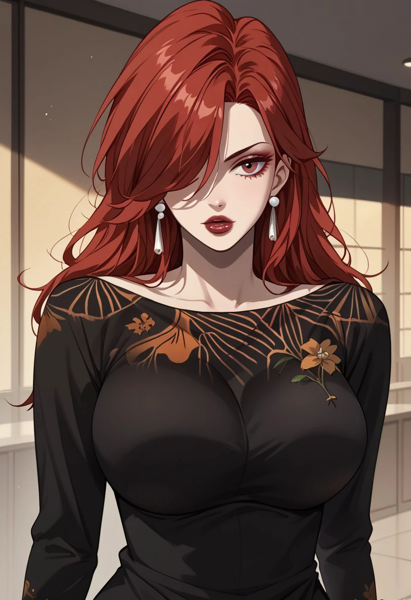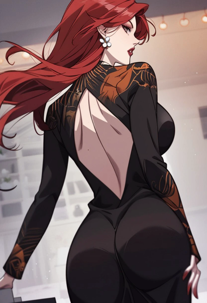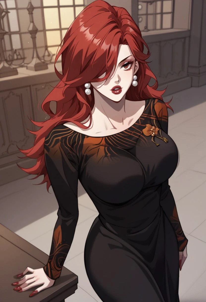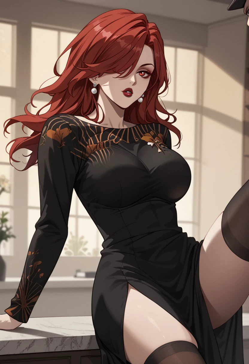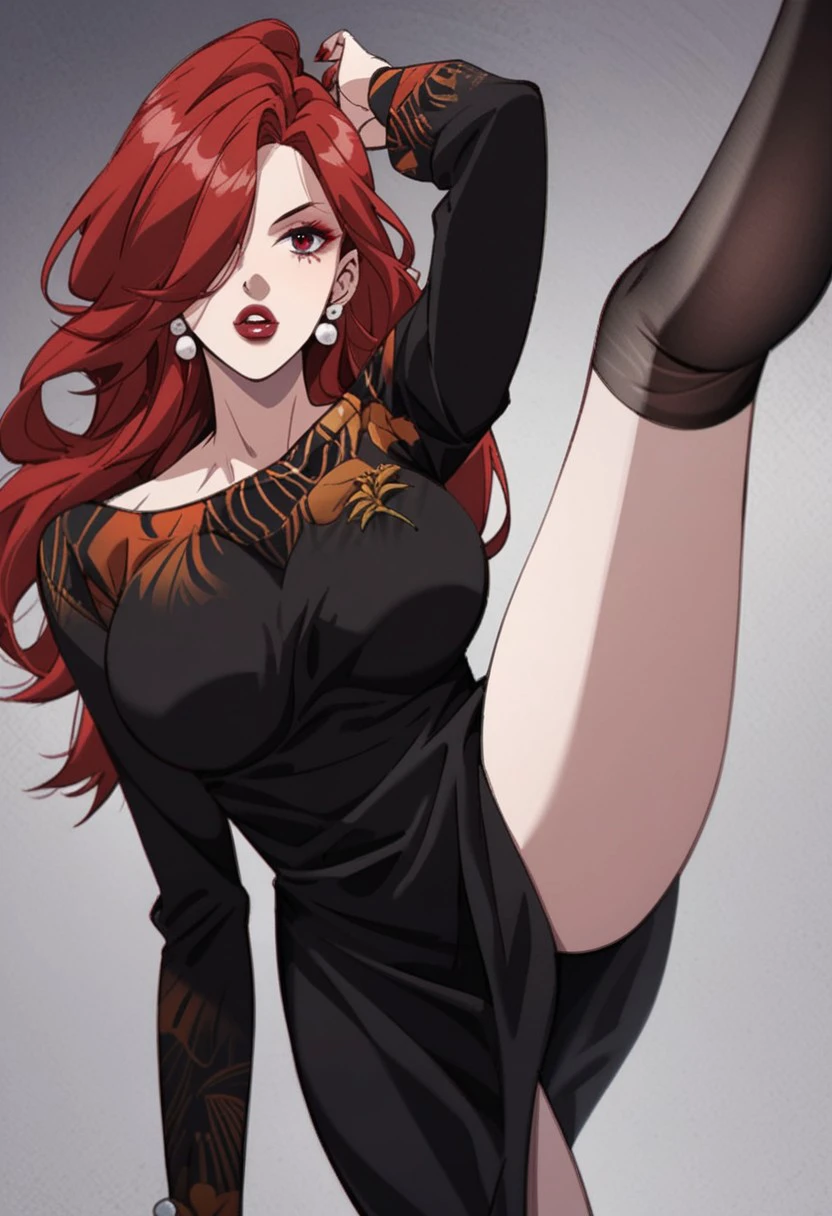 jewelry, earrings, black dress, print dress, tight dress, long sleeves, long dress, black thighhighs,