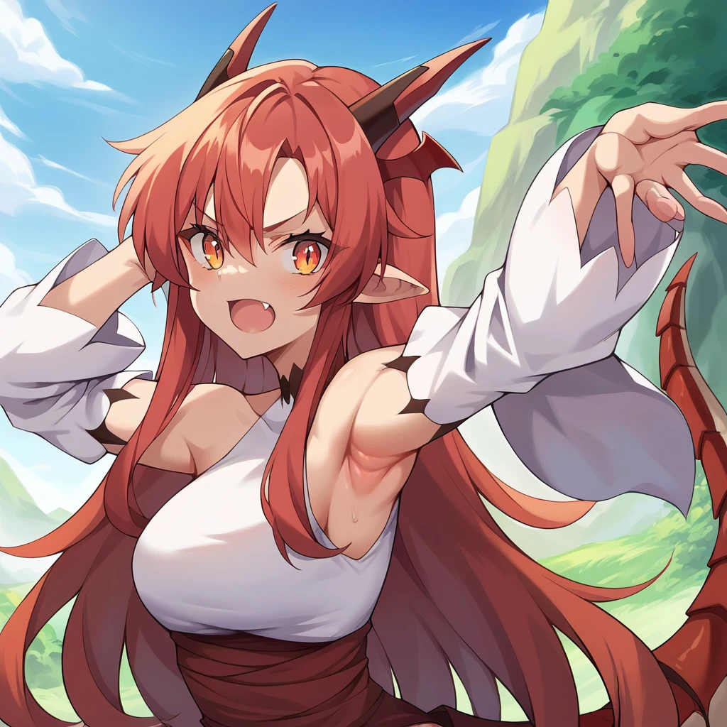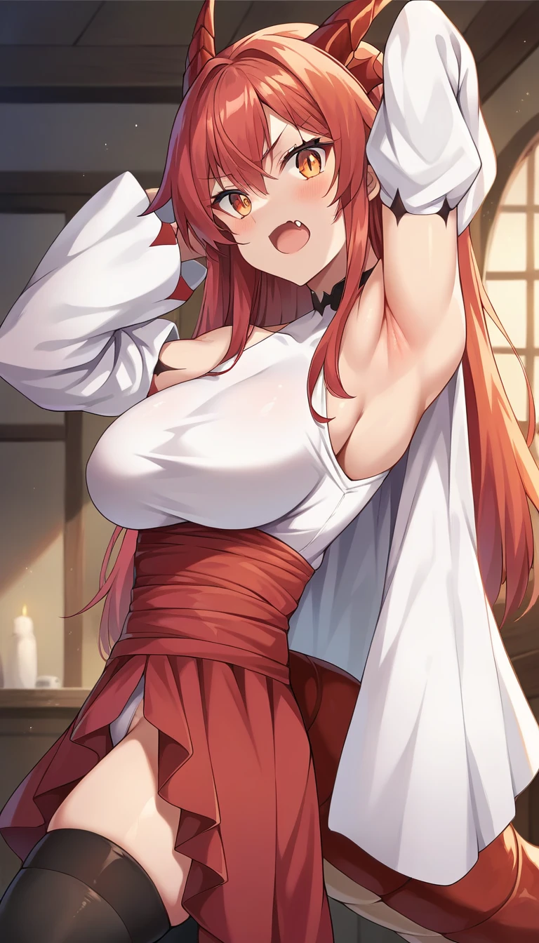 Clothing: white leotard, red skirt, detached sleeves, black thighhighs,