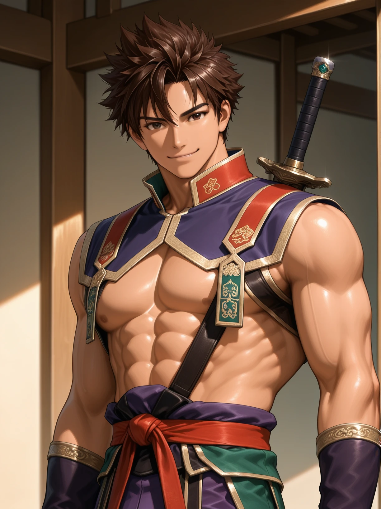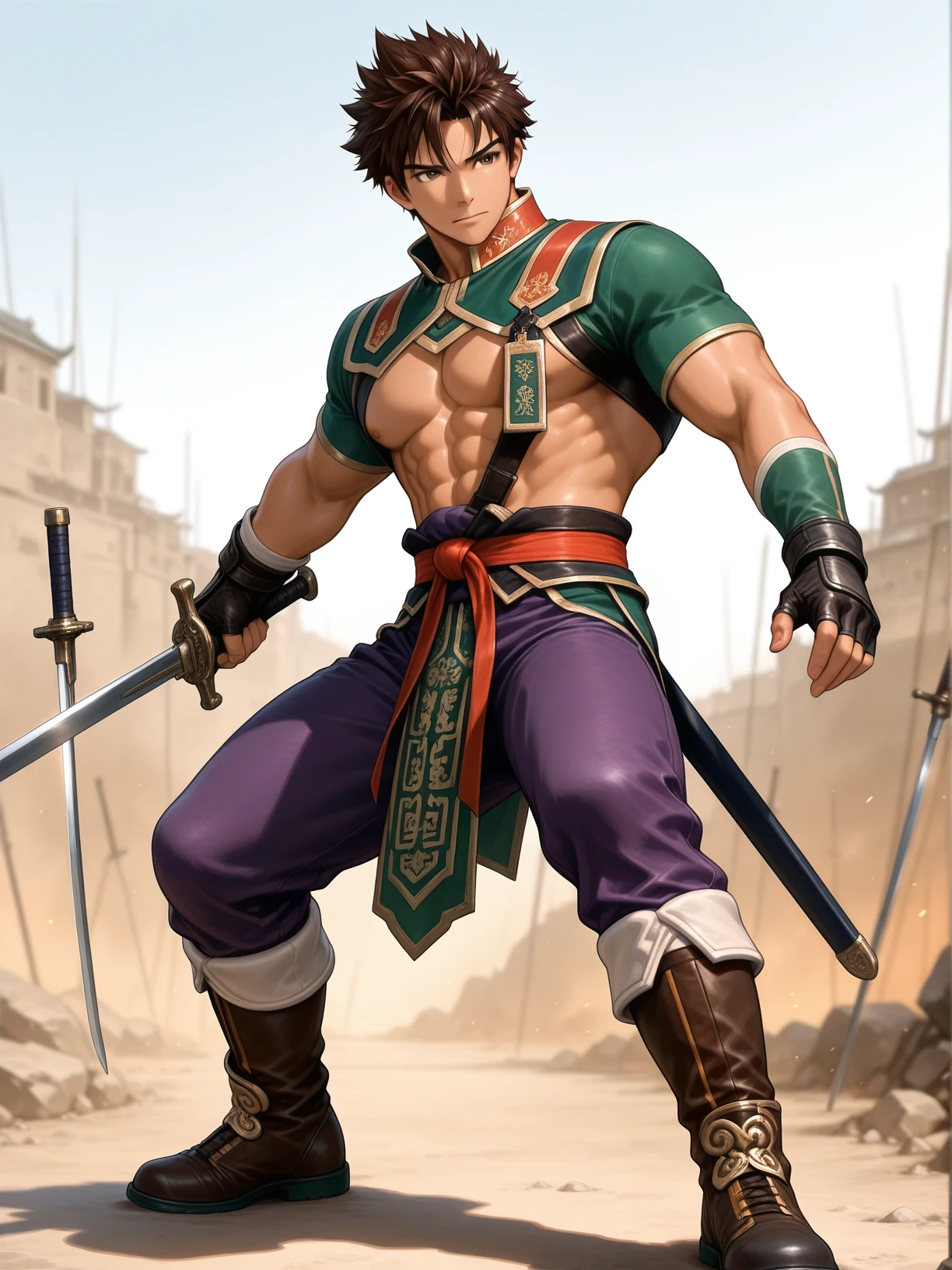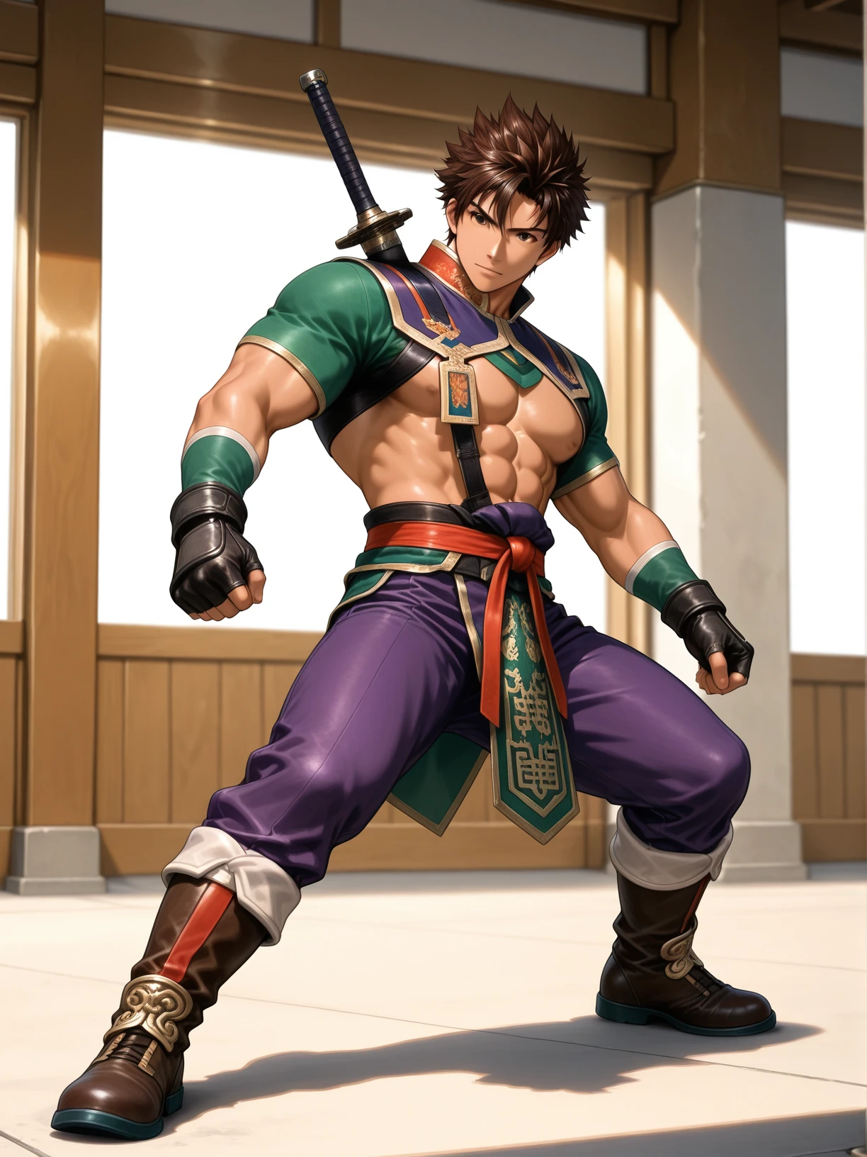 yun seong, 1boy, brown hair, spiky hair, brown eyes, asian male, traditional korean outfit, purple and red clothing, green sleeves, short sleeves, exposed midriff, visible abs, purple pants, pants tucked into boots, boots, black fingerless gloves, boots
