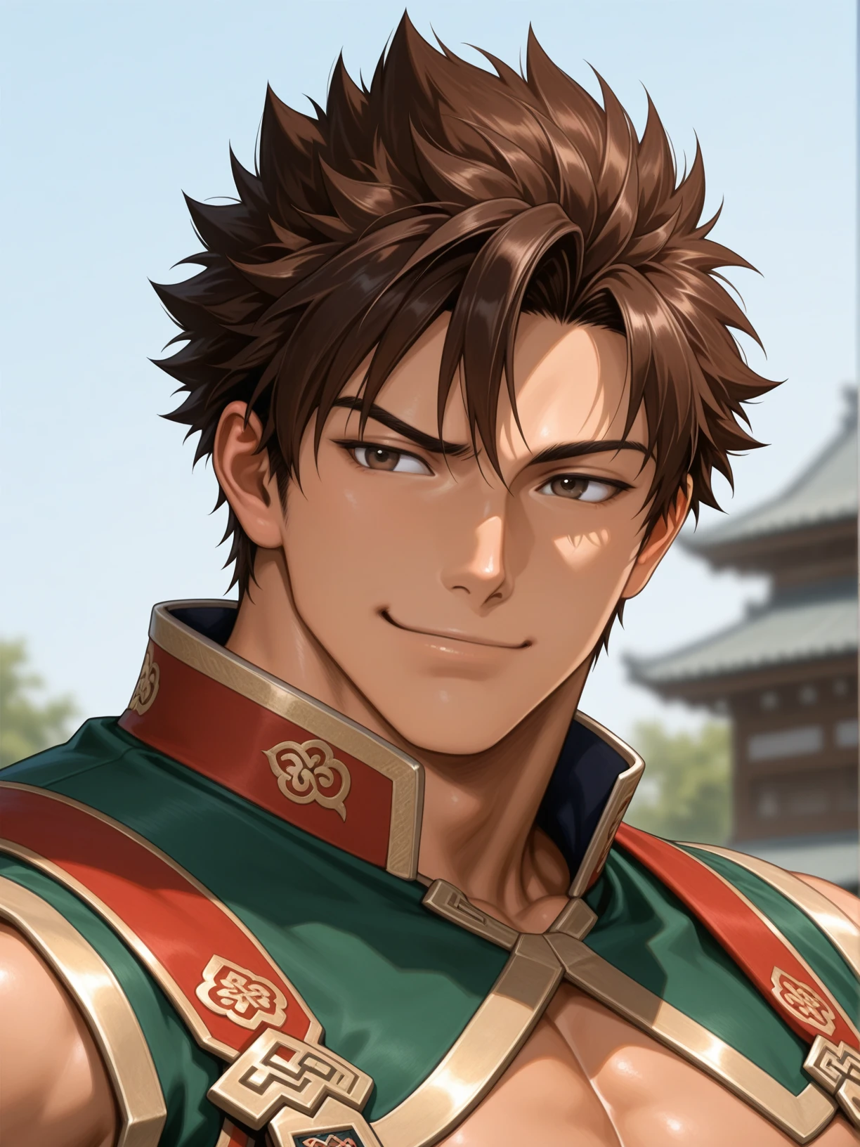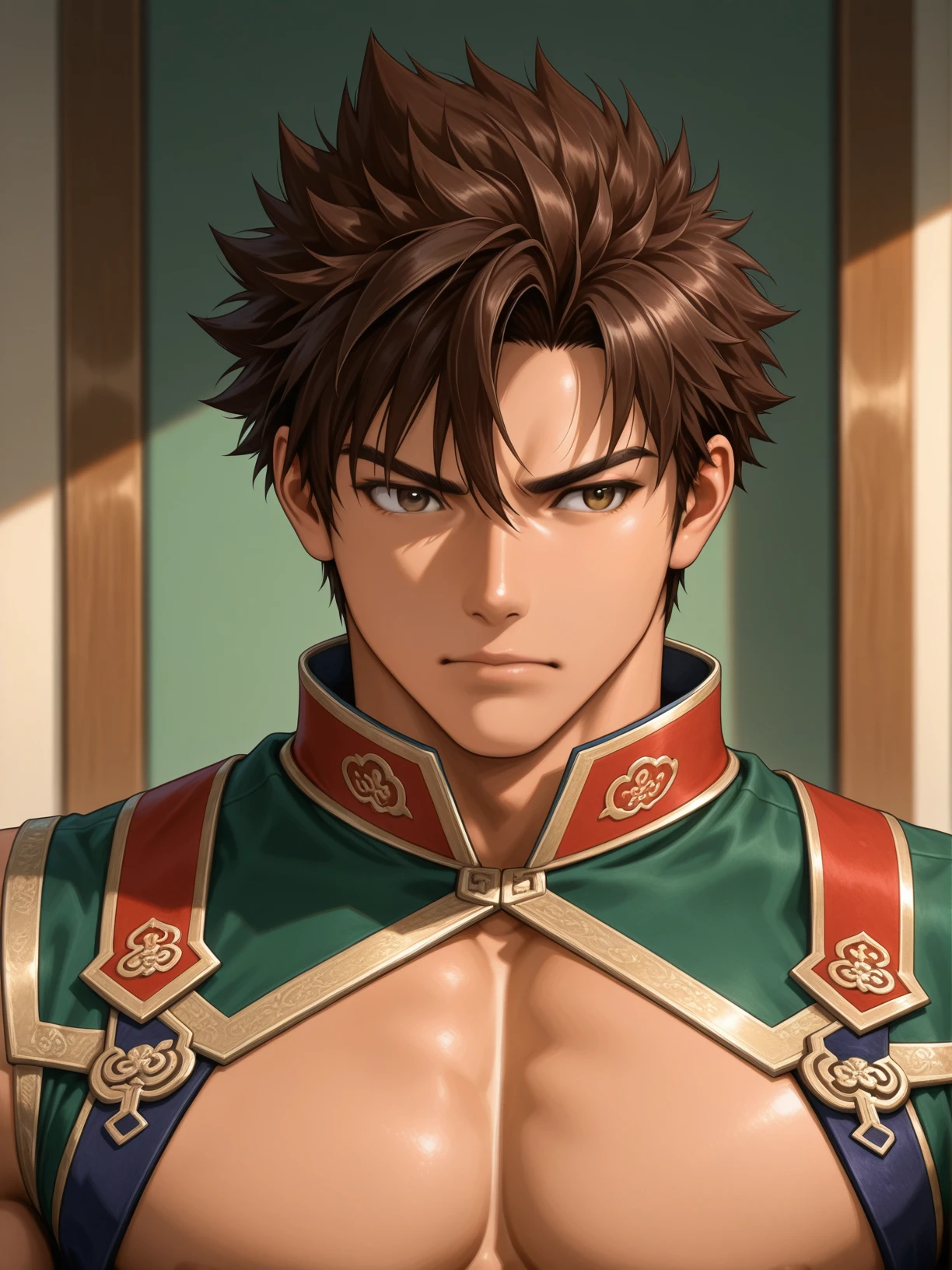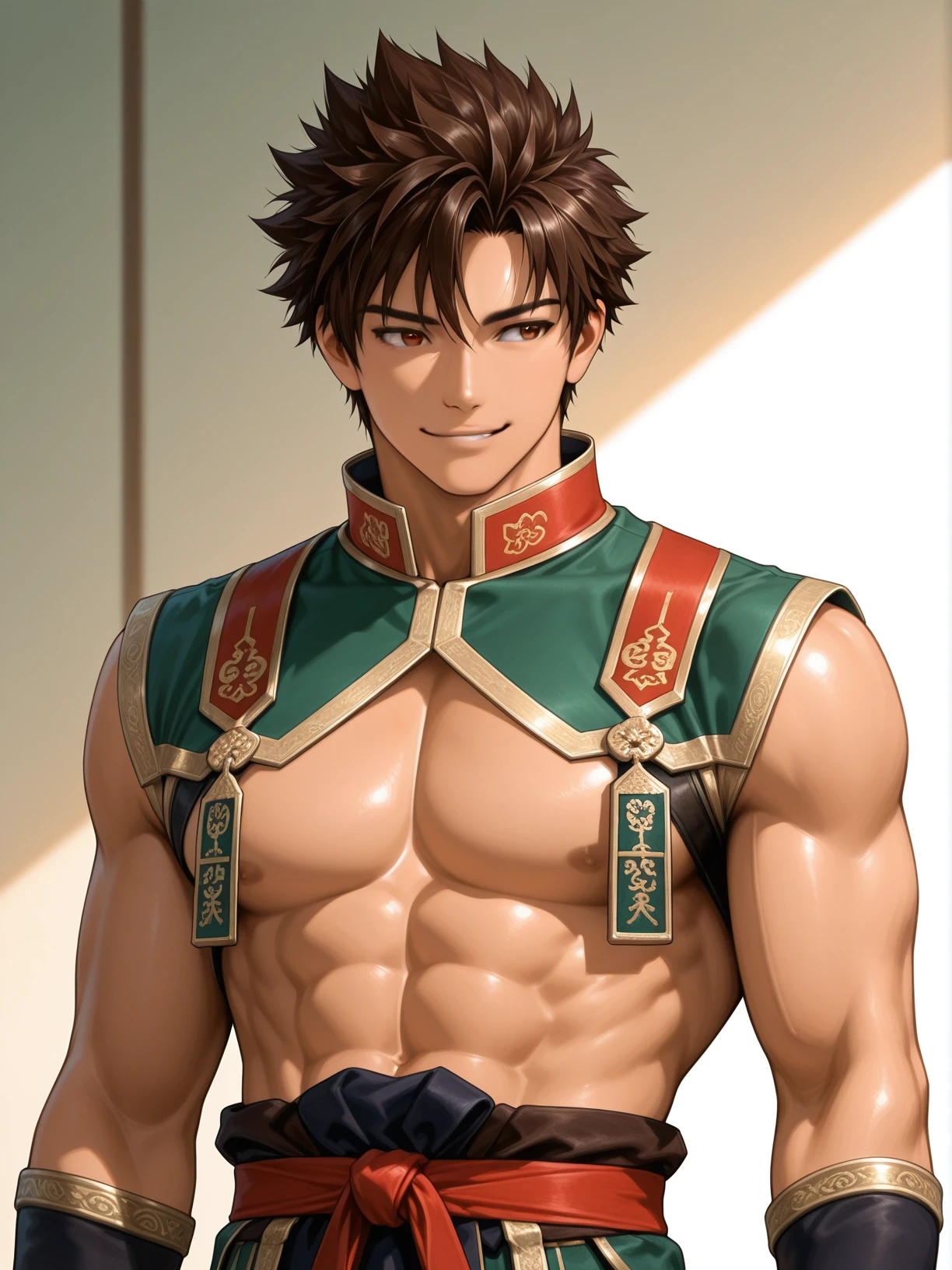yun seong, 1boy, brown hair, spiky hair, brown eyes, asian male, traditional korean outfit, purple and red clothing, green sleeves, short sleeves, exposed midriff, visible abs, purple pants, pants tucked into boots, boots, black fingerless gloves, boots