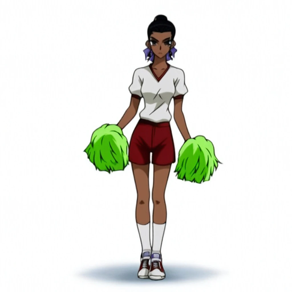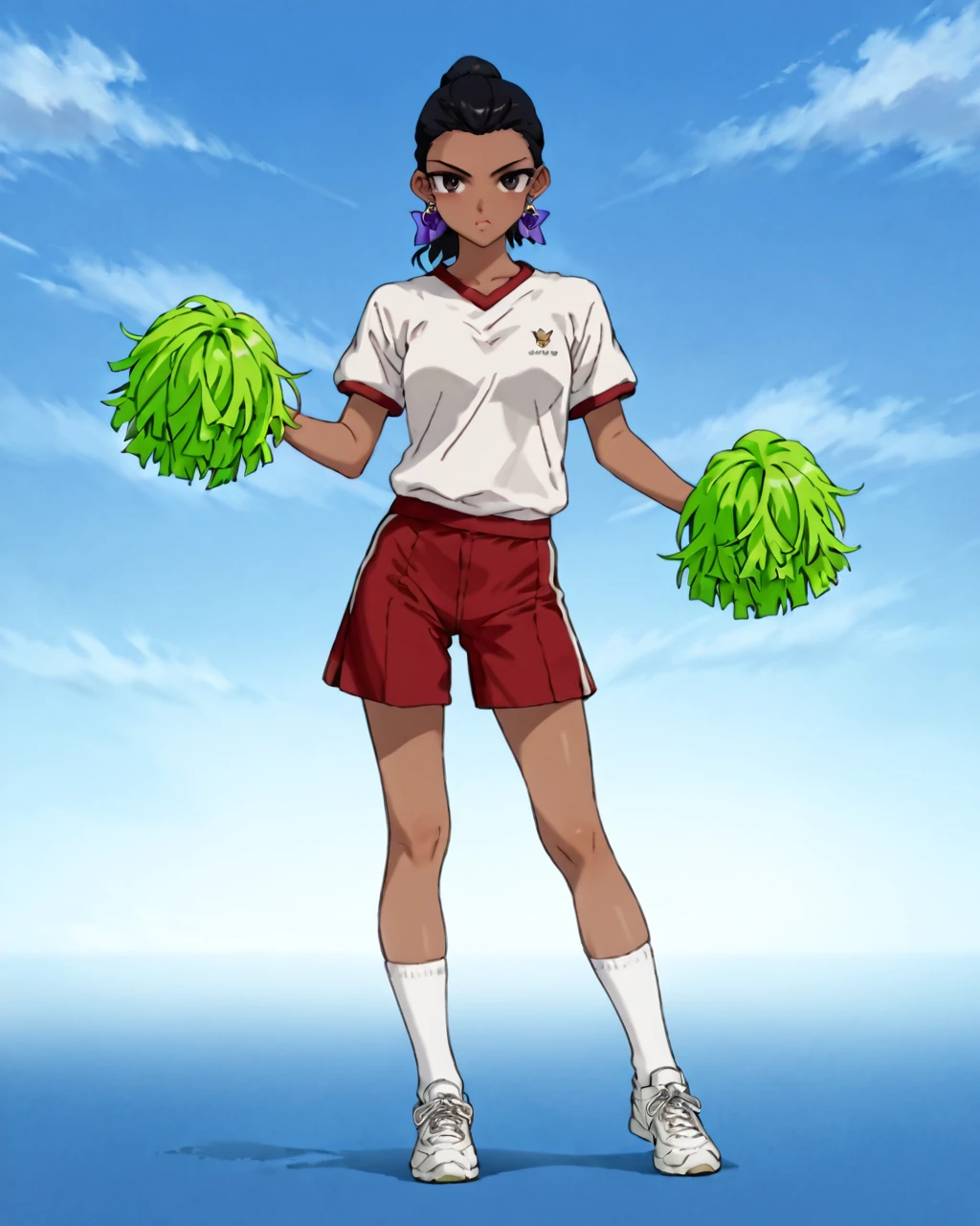 Lala Gonzalez, Lala, Dark brown eyes, Black hair, dark-skinned female, dark skin, 1girl, solo, gym uniform, shorts, socks, cheerleader, sneakers, earrings, shoes
