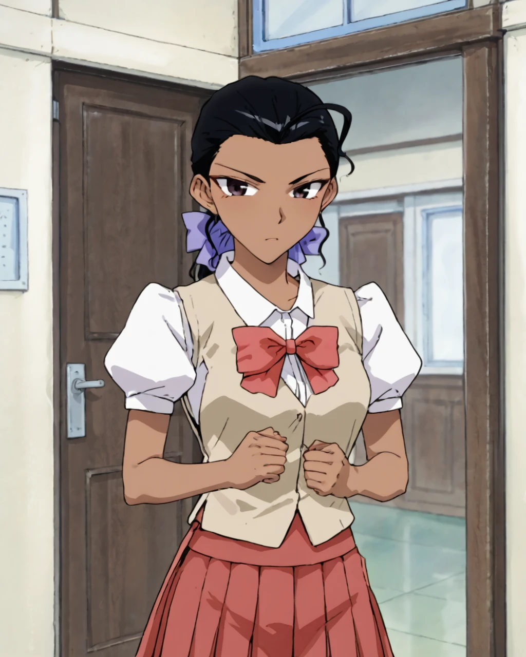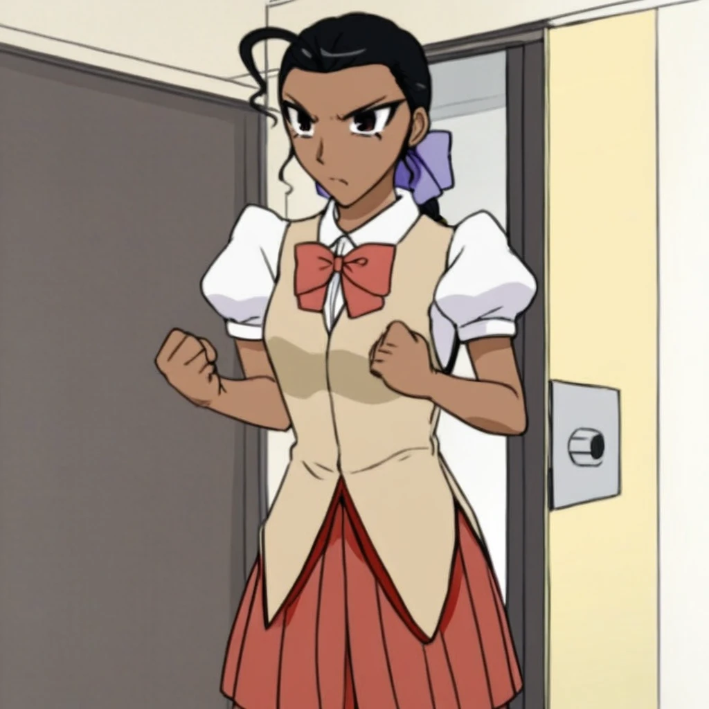 Lala Gonzalez, Lala, Dark brown eyes, Black hair, dark-skinned female, dark skin, 1girl, solo, school uniform, skirt, bow, ponytail, puffy sleeves, pleated skirt, ahoge, red skirt, short sleeves, hair bow, puffy short sleeves, door, clenched hands