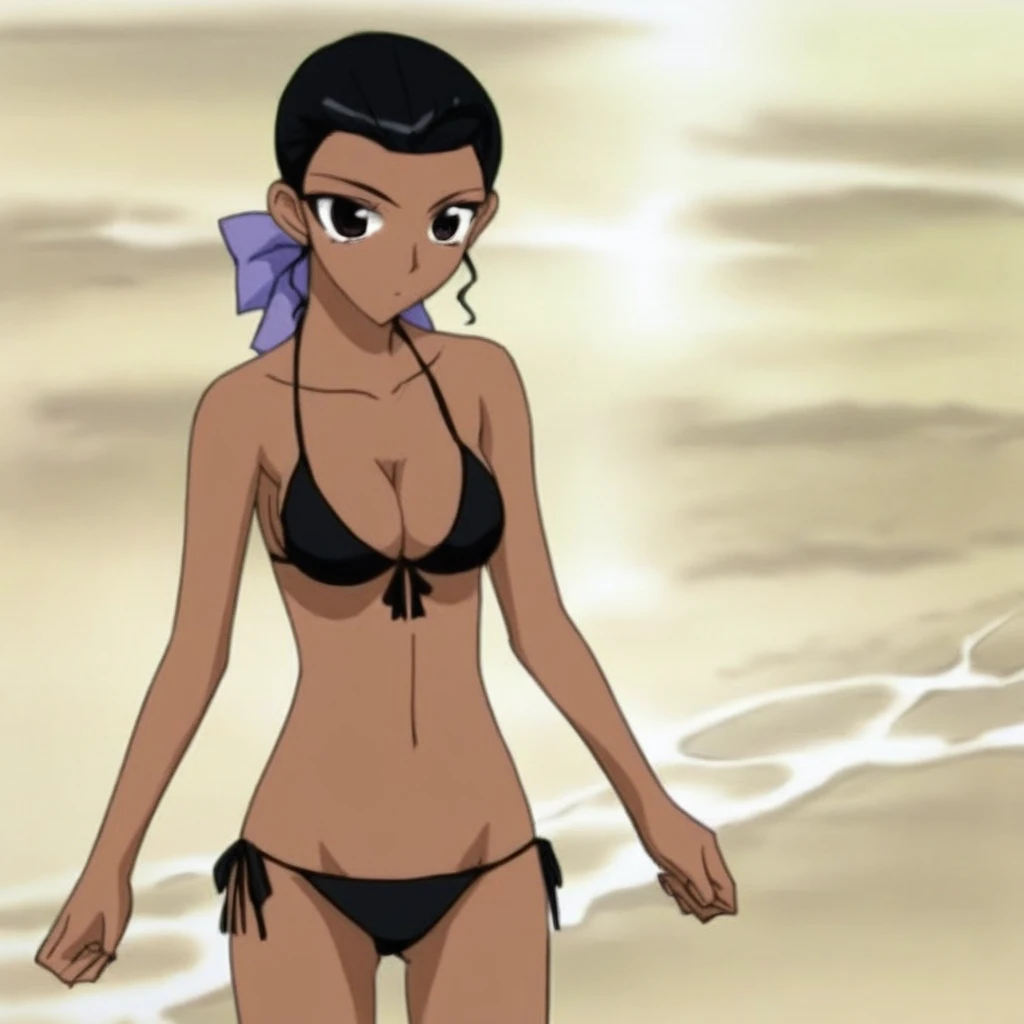 Lala Gonzalez, Lala, Dark brown eyes, Black hair, dark-skinned female, dark skin, 1girl, solo, breasts, black bikini, cleavage, side-tie bikini bottom, ribbon