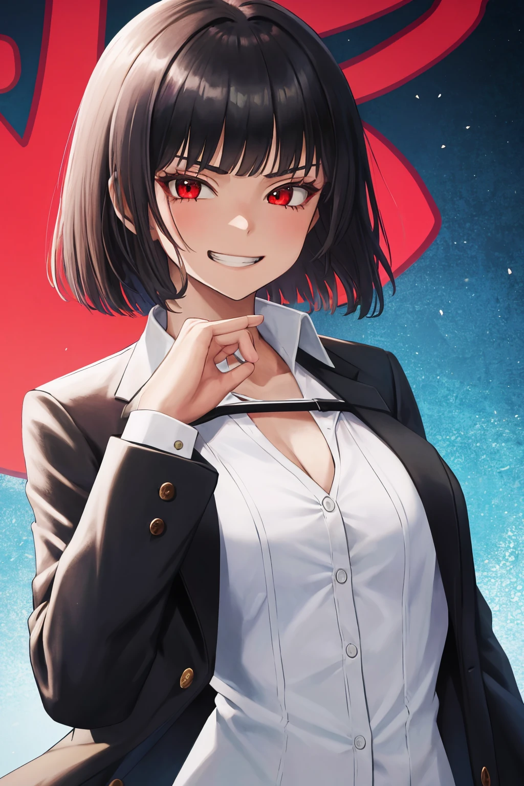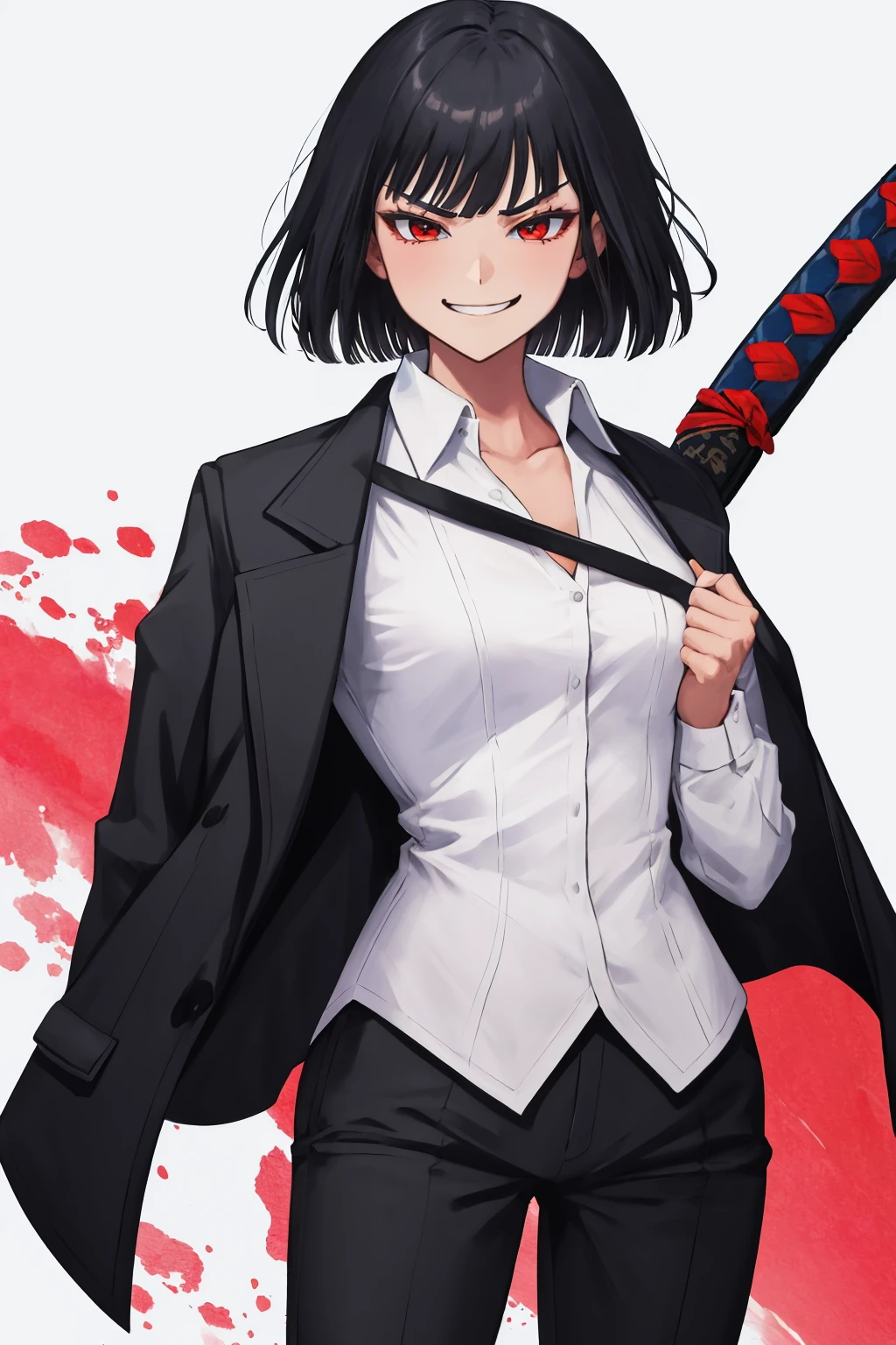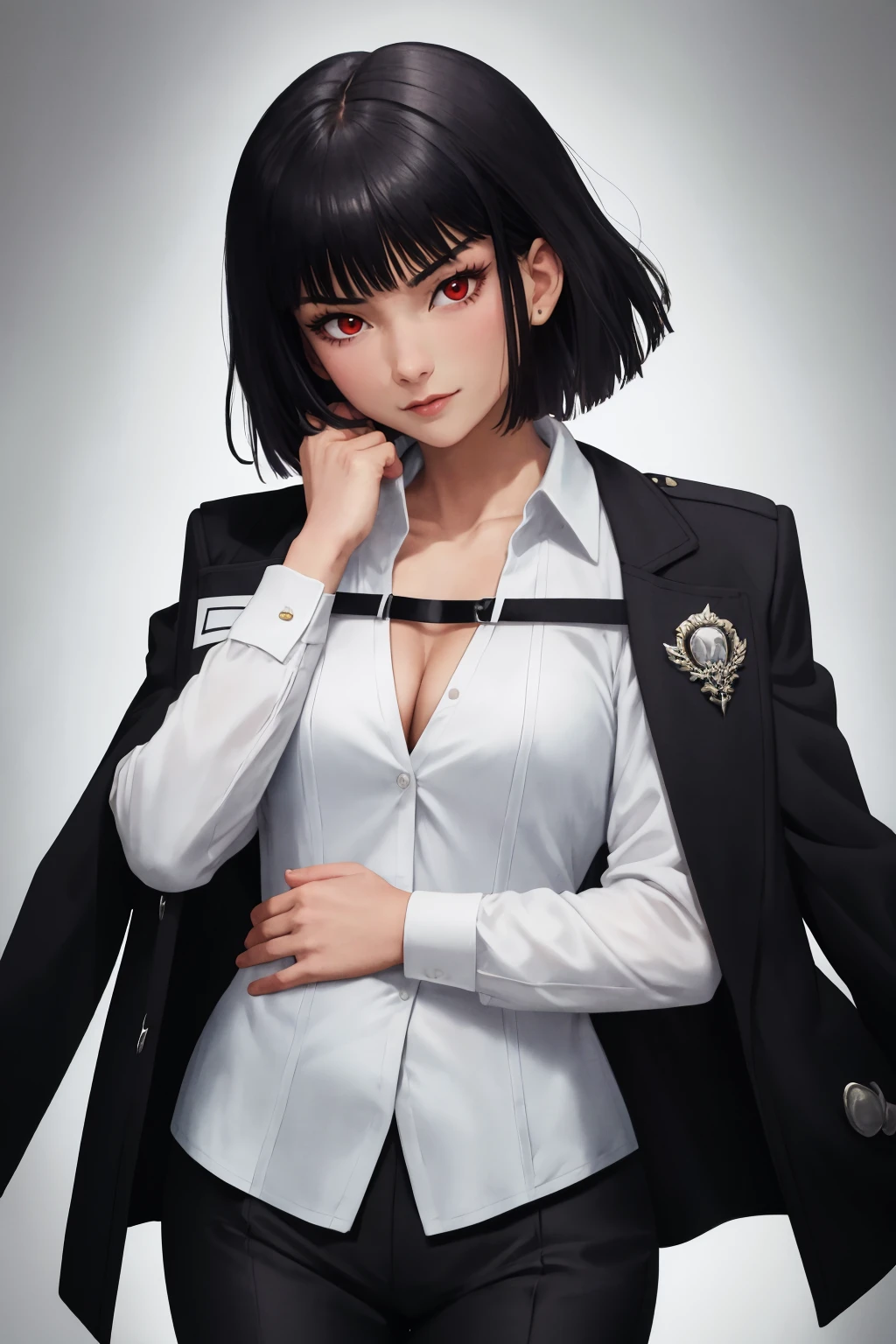 ryoshu, white shirt, black jacket, jacket on shoulders, chest strap, black pants