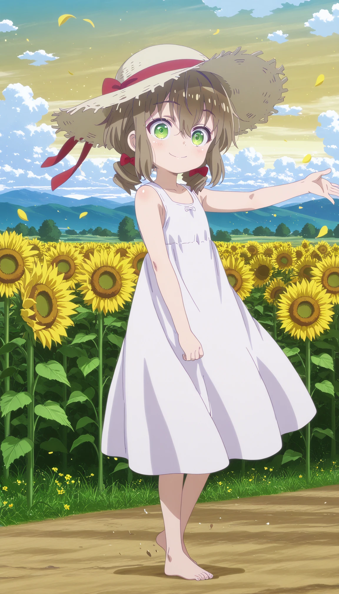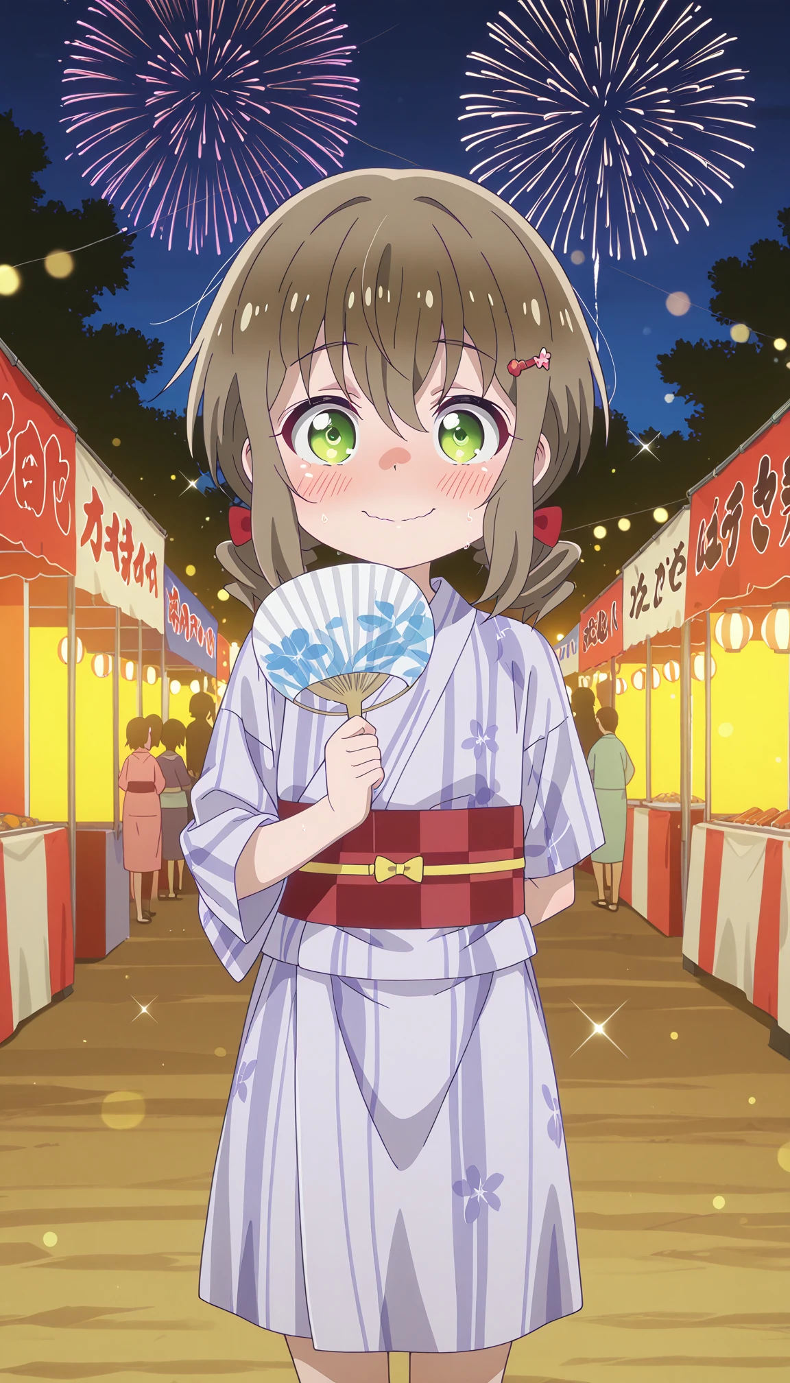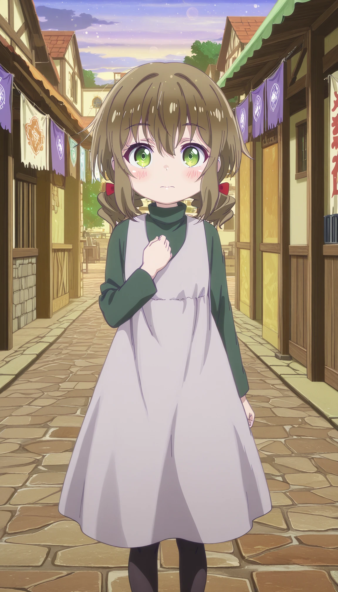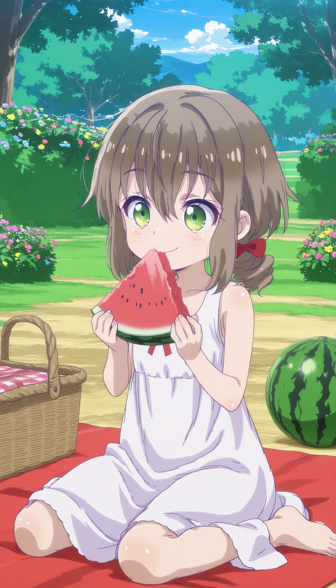 green eyes, brown hair, low twintails, short twintails, hair bow, red bow
