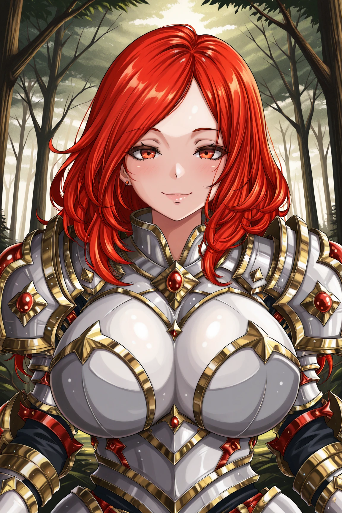 ➜ SanstoneGSILXL, red eyes, red hair, long hair, parted bangs, large breasts, white armor, jewelry, shoulder armor, breastplates, faulds, loincloth, black shorts, bracelet, armored boots