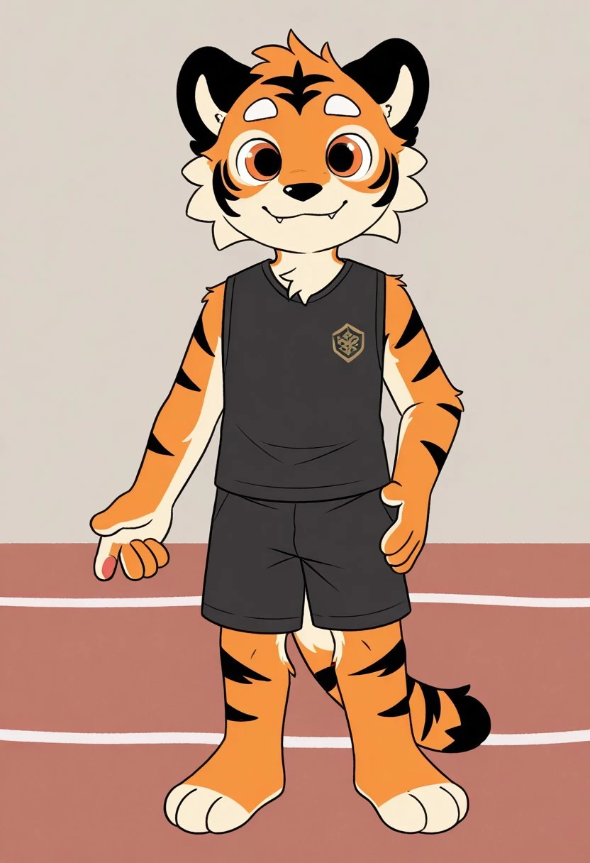<Lora:reditily:1>,red(itily), Anthro, furry,tiger,solo,male,Orange fur,black stripes, Orange eyes,round eyes,fangs,White eyebrows,black ears,black nose,black shirt, black pants,cute,Athletic body