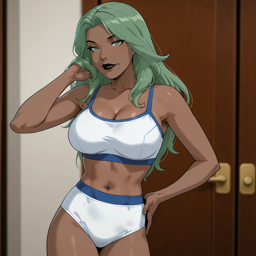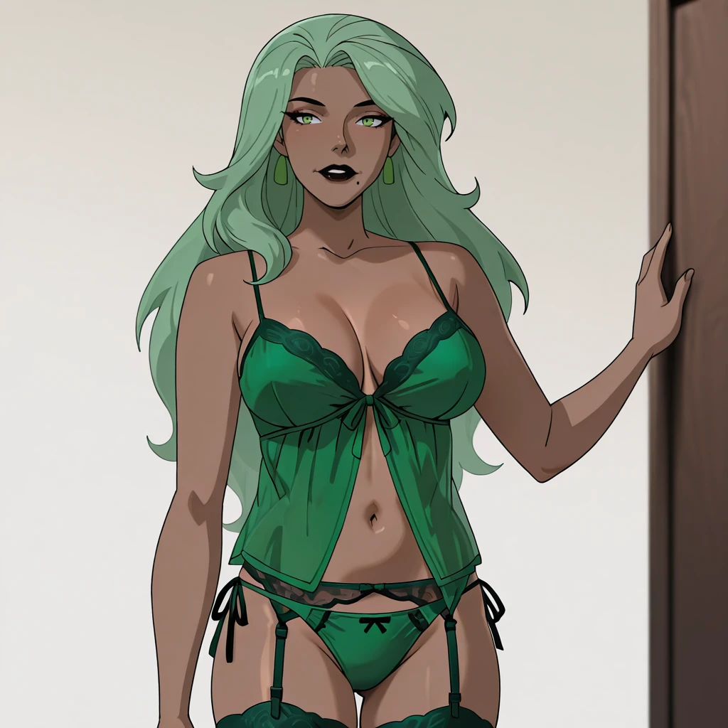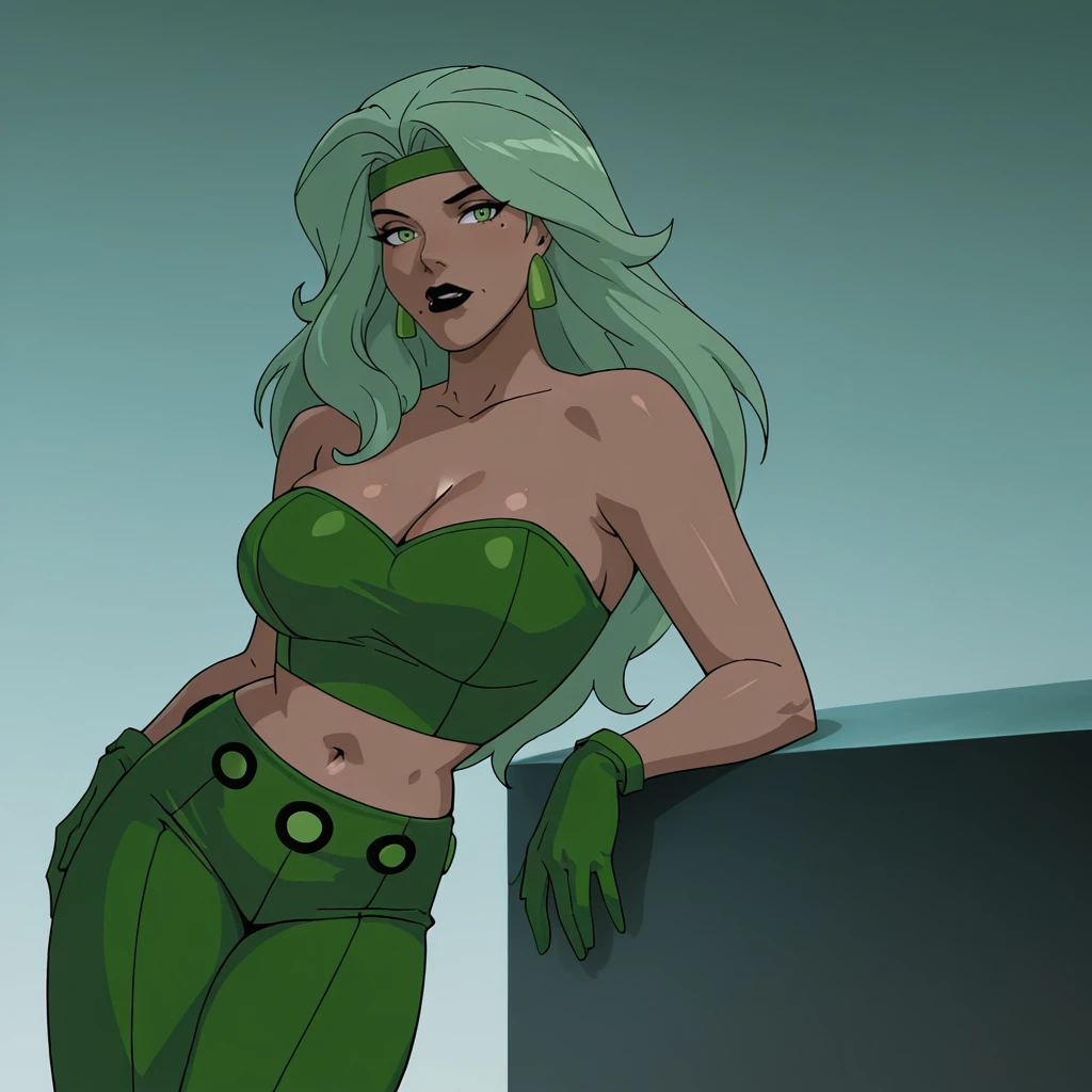 Trigger : FireHuman, 1girl, solo, jewelry, long hair, earrings, navel, green hair, lipstick, gloves, midriff, large breasts, green pants, makeup, green eyes, crop top, cleavage, dark-skinned female, dark skin, headband, mole, bare shoulders