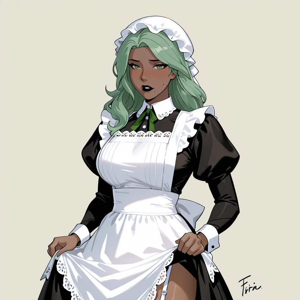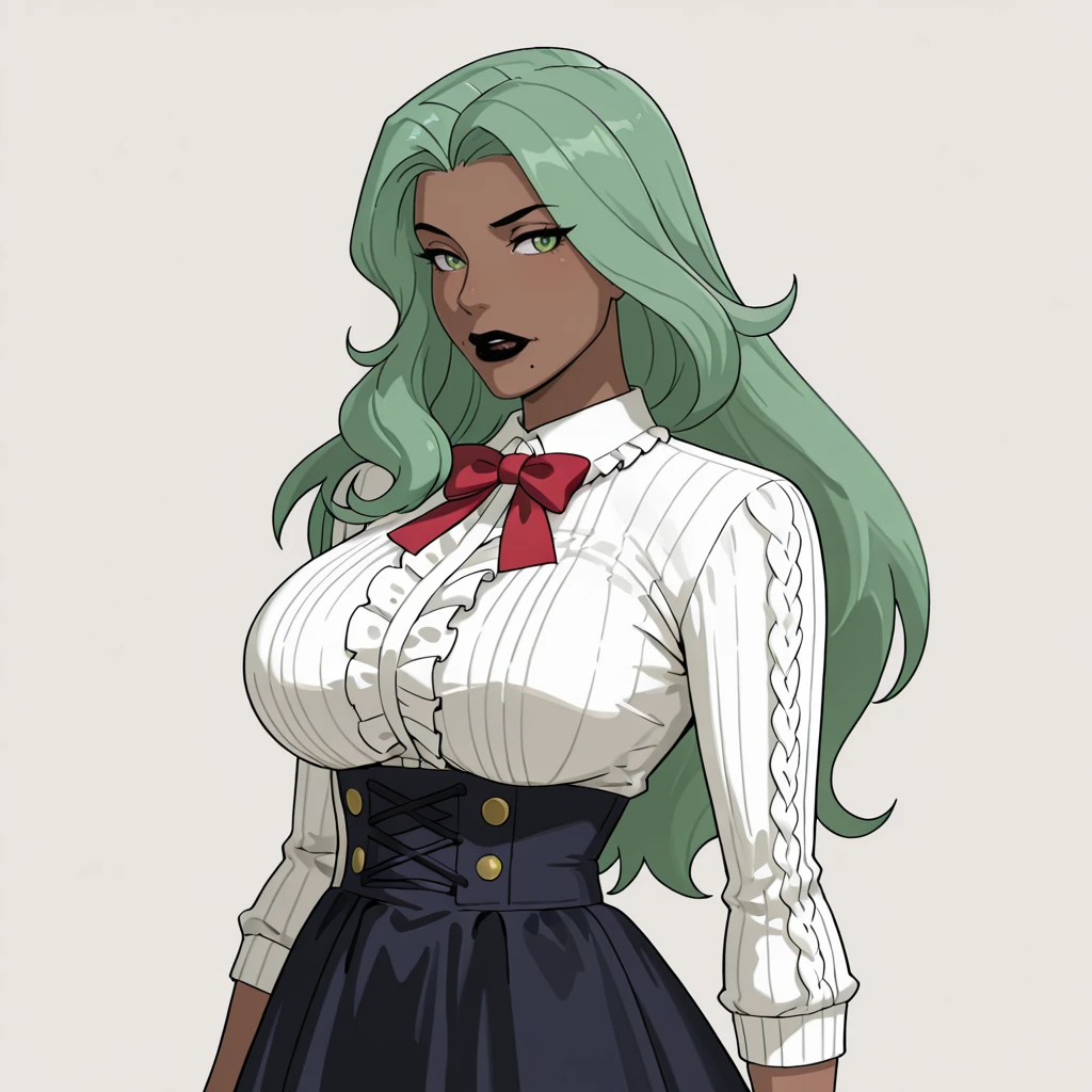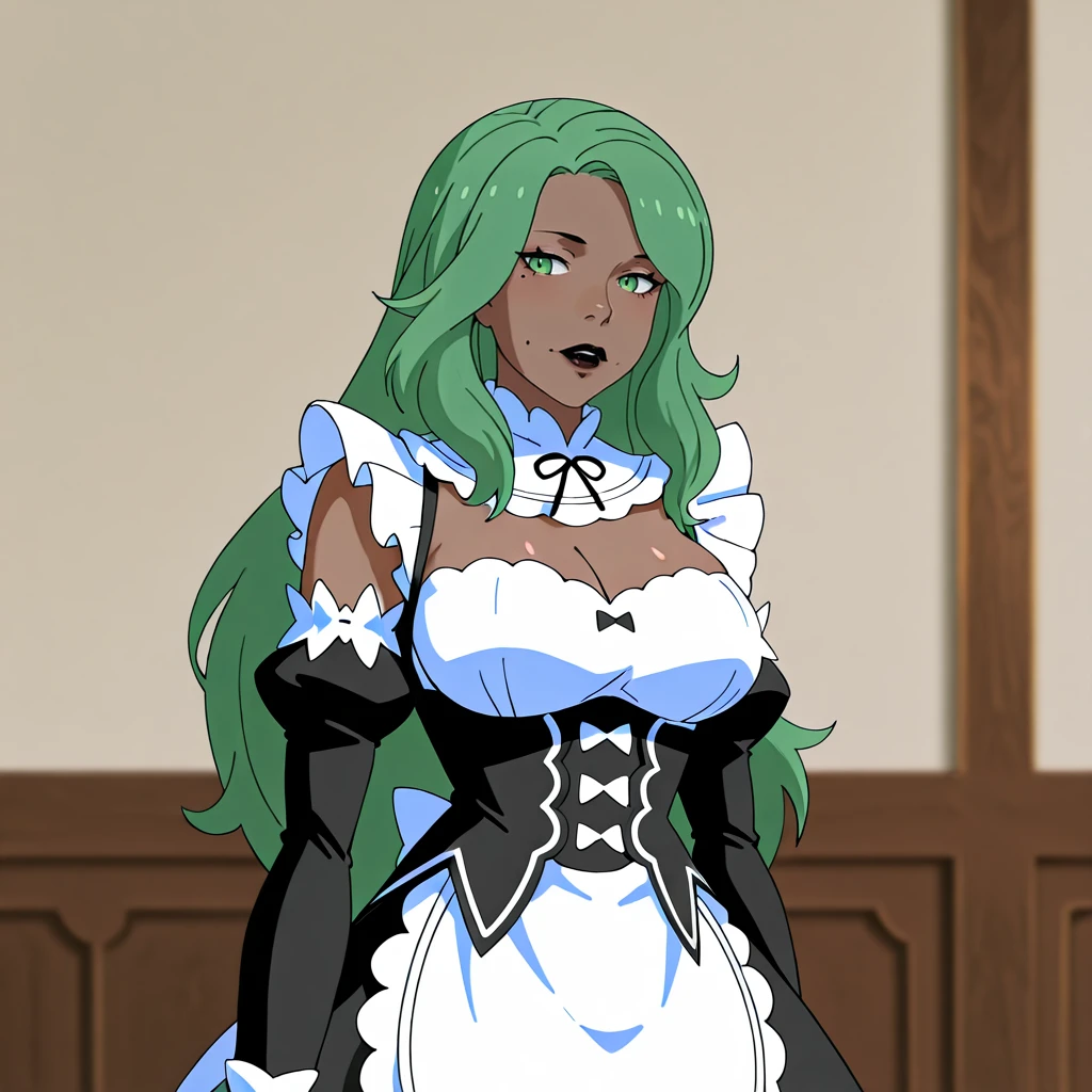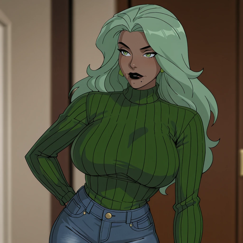 Trigger : FireHuman, 1girl, solo, jewelry, long hair, earrings, navel, green hair, lipstick, gloves, midriff, large breasts, green pants, makeup, green eyes, crop top, cleavage, dark-skinned female, dark skin, headband, mole, bare shoulders
