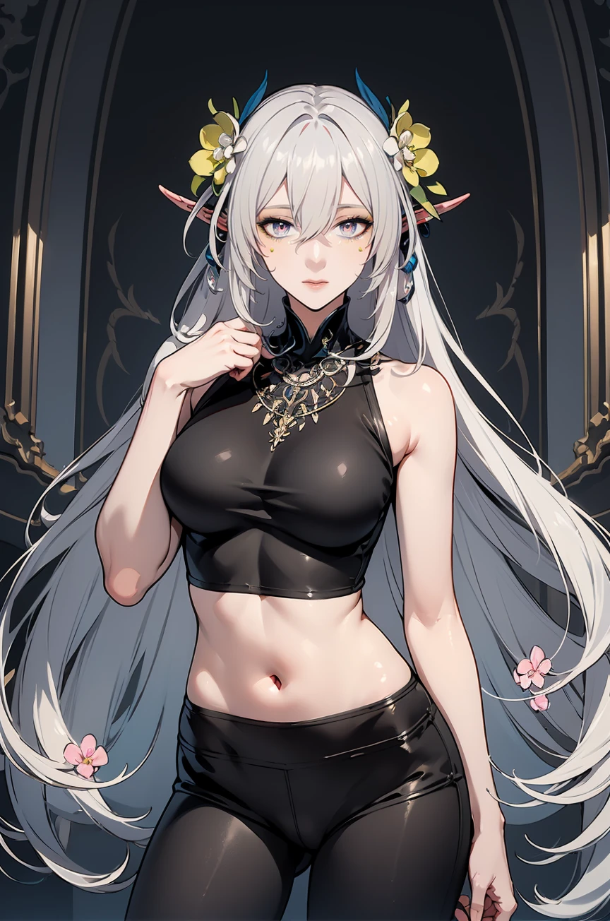 LamiaG,grey hair,pointy ears,hair flower,multicolored eyes,