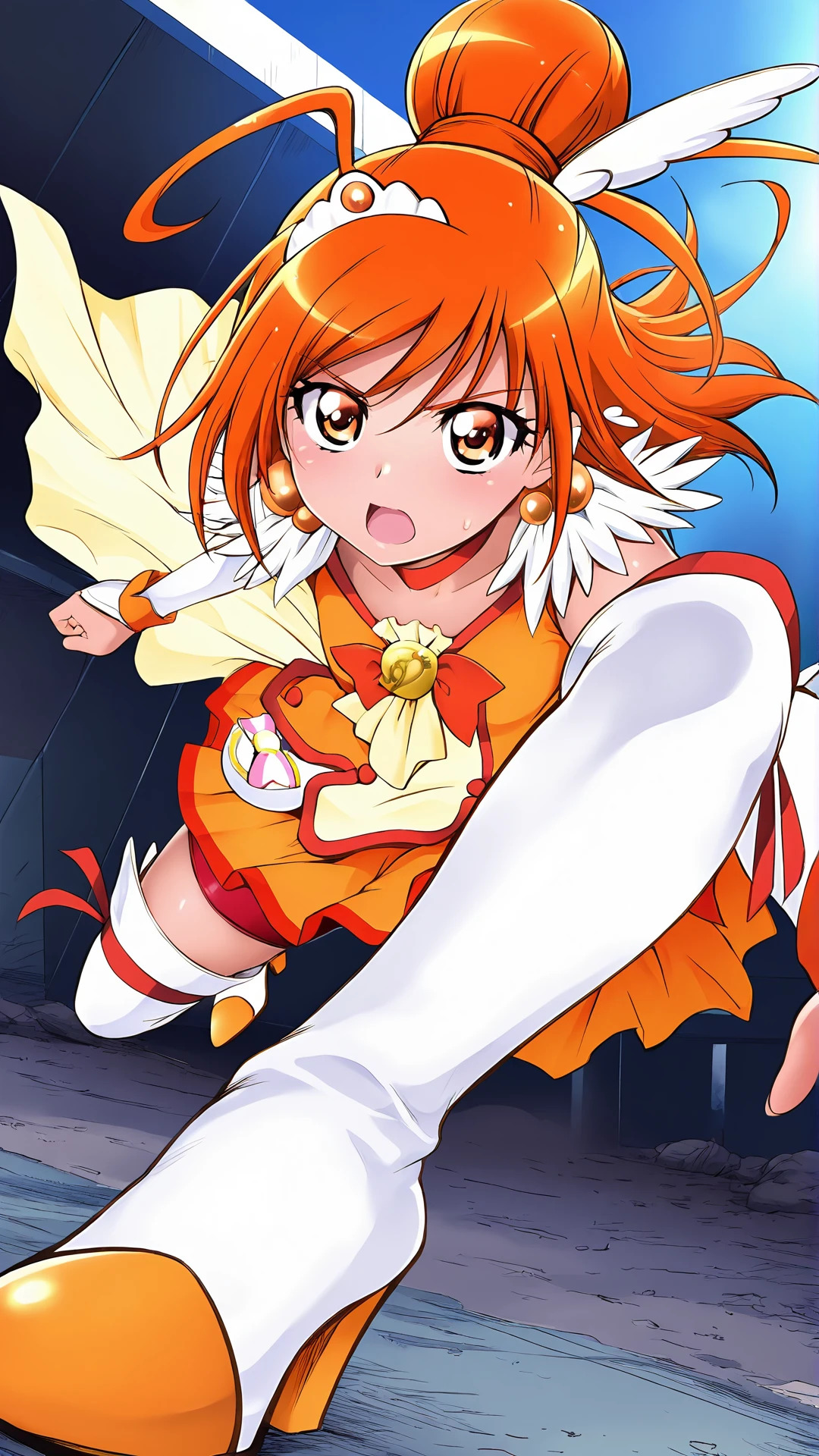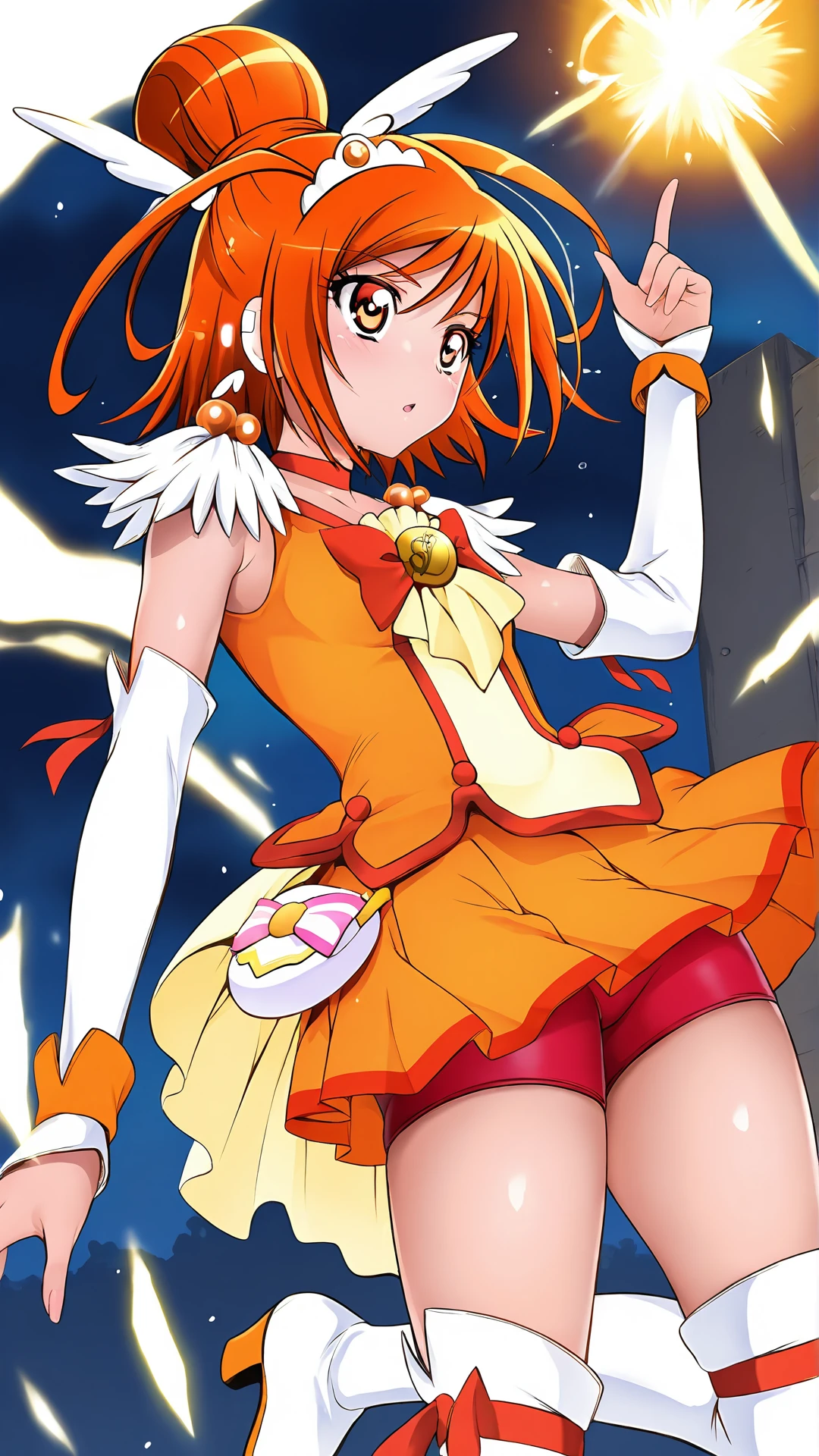 Cycloneakane,1girl,cure sunny,hino akane \(smile precure!\),orange skirt,thighhighs,boots,skirt,choker,orange hair,magical girl,orange choker,shorts,single hair bun,thigh boots,red shorts,short hair,hair bun,orange eyes,bike shorts under skirt,tiara,jewelry,brooch,high heels,