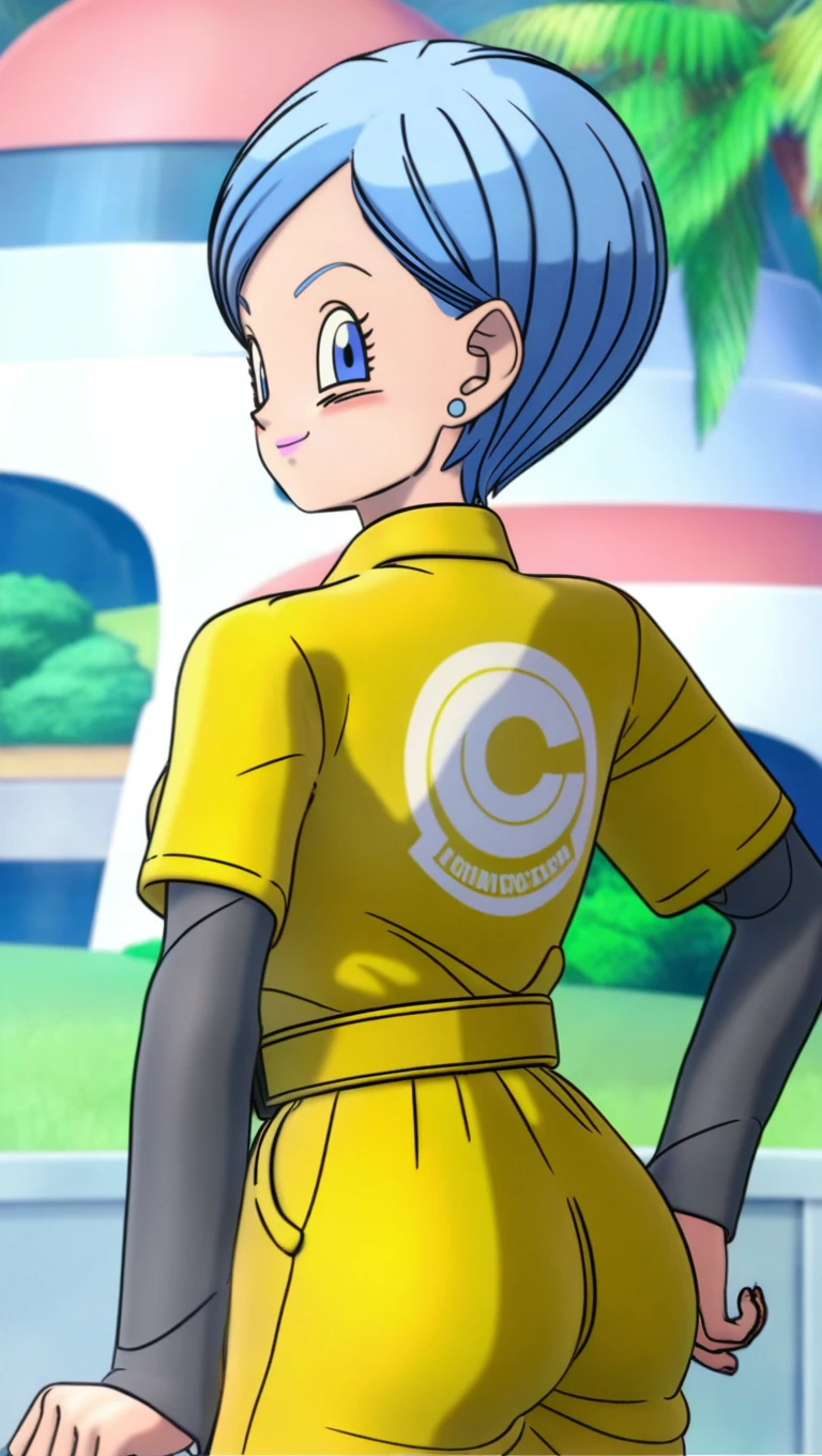 sup3rh3r0 outfit, superh3r0 hair, yellow jacket, yellow belt, yellow pants, orange shoes, black socks, black undershirt, blue stud earrings, pink lipstick, superh3ro style, 3d,
