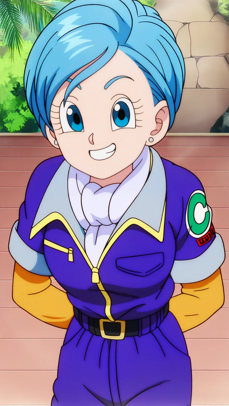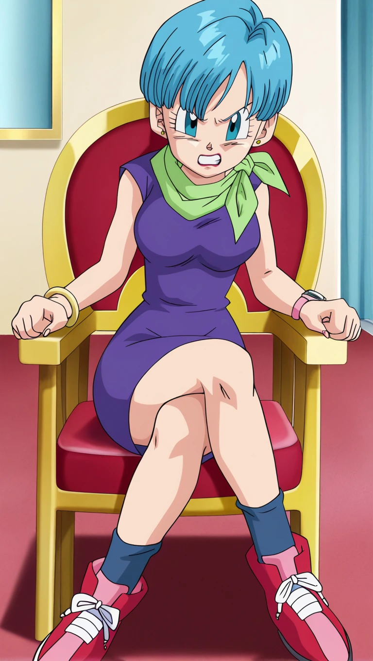 BOG outfit, b0g hair, purple dress, green neckerchief, red shoes, blue socks, gold stud earrings, lipstick, gold bracelet, pink wristwatch, dbs style, medium breasts,