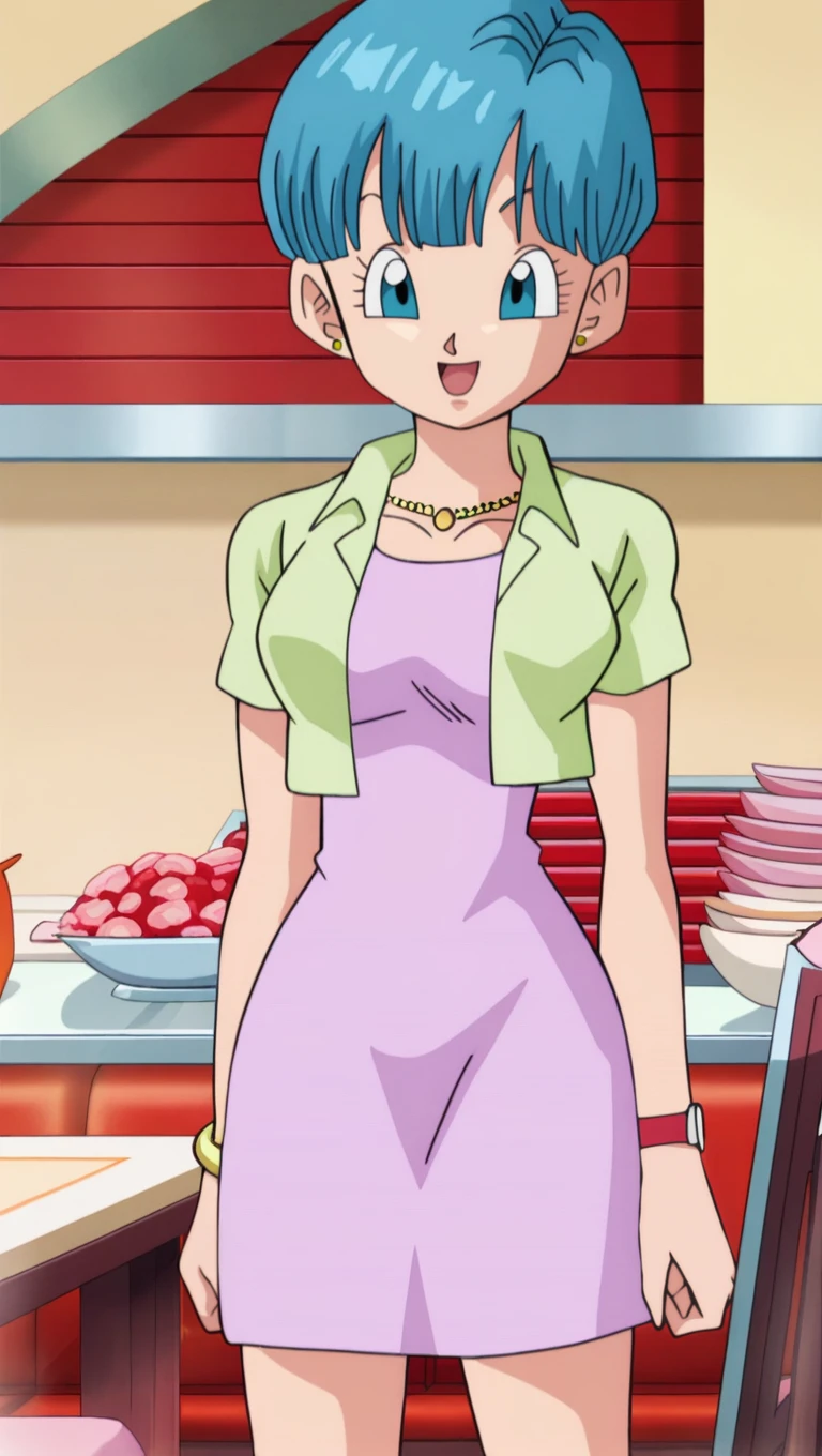 res0rt outfit, bowl cut, pink dress, green cropped jacket, gold stud earrings, gold bracelet, red wristwatch, gold ball necklace, lipstick, red ankle boots, dbs style, medium breasts,