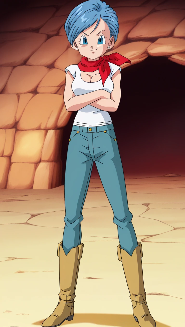 ROF outfit, white shirt, red neckerchief, white stud earrings, R0f hair, blue jeans, brown boots, dbs style, ??????????????, cleavage,