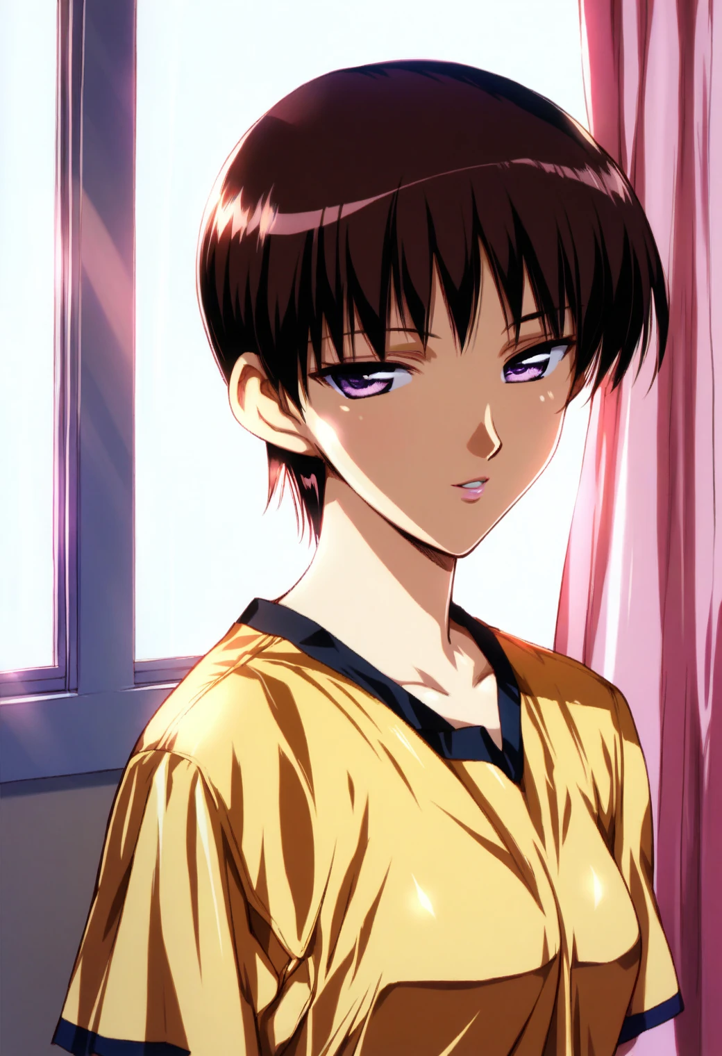 takira, short hair, dark red hair, brown hair, purple eyes, half-closed eyes